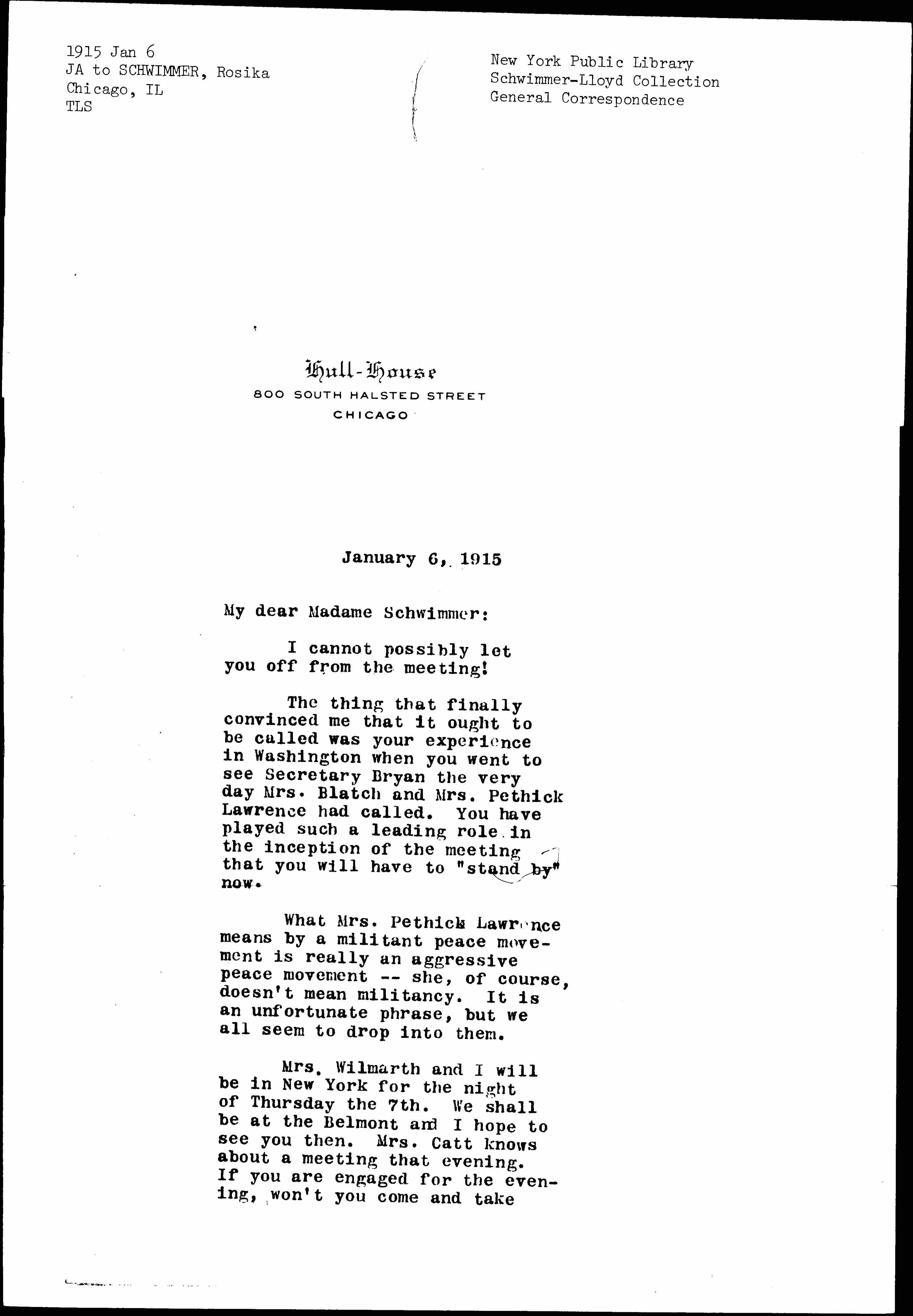 The thing that finally convinced me that it ought to be called was your experience in Washington when you went to see Secretary Bryan the very day Mrs. Blatch and Mrs. Pethick Lawrence had called. You have played such a leading role in the inception of the meeting that you will have to "stand by" now.