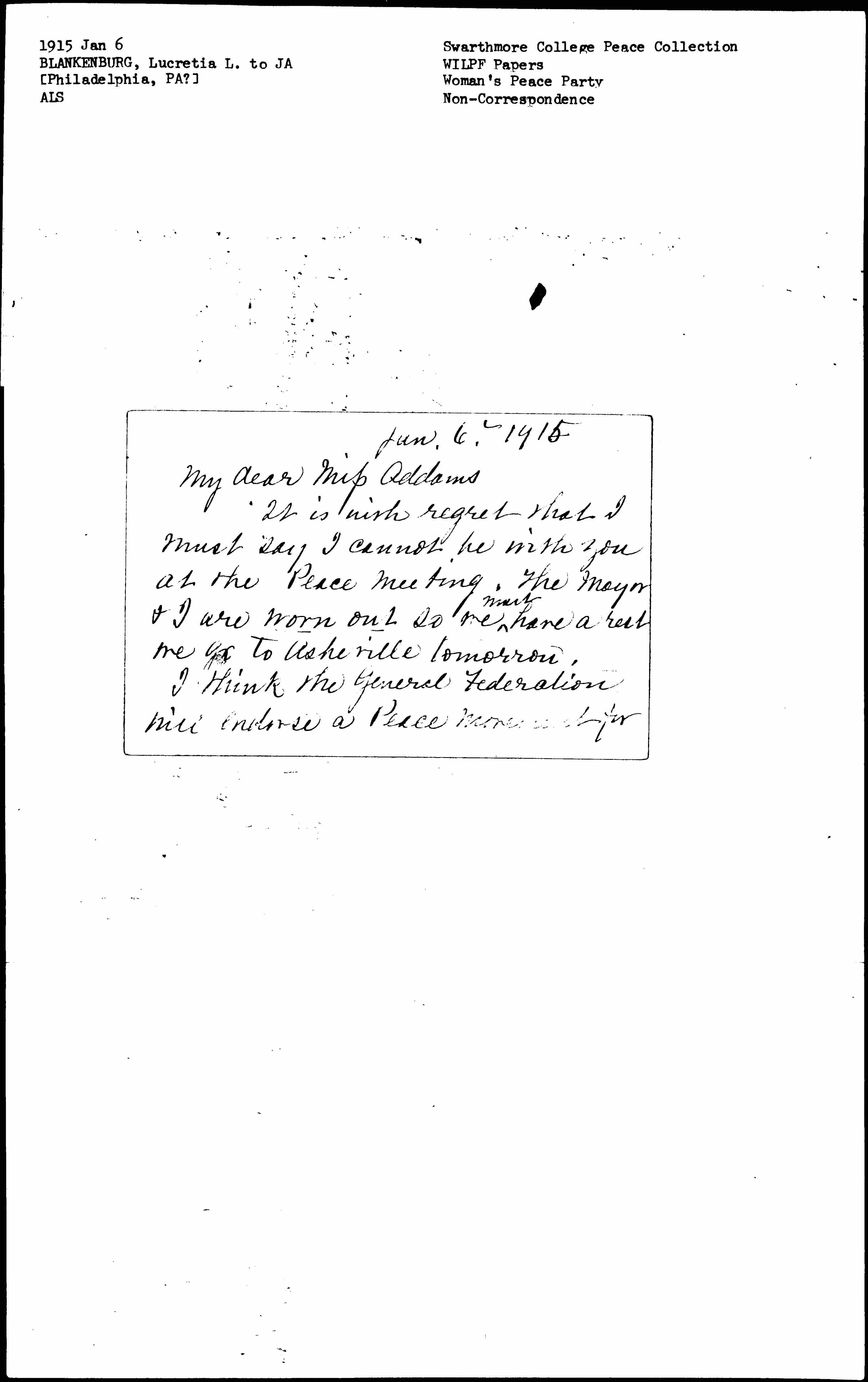It is with regret that I must say I cannot be with you at the Peace meeting. The Mayor & I are worn out so we <must> have a rest. We go to Asheville tomorrow.
