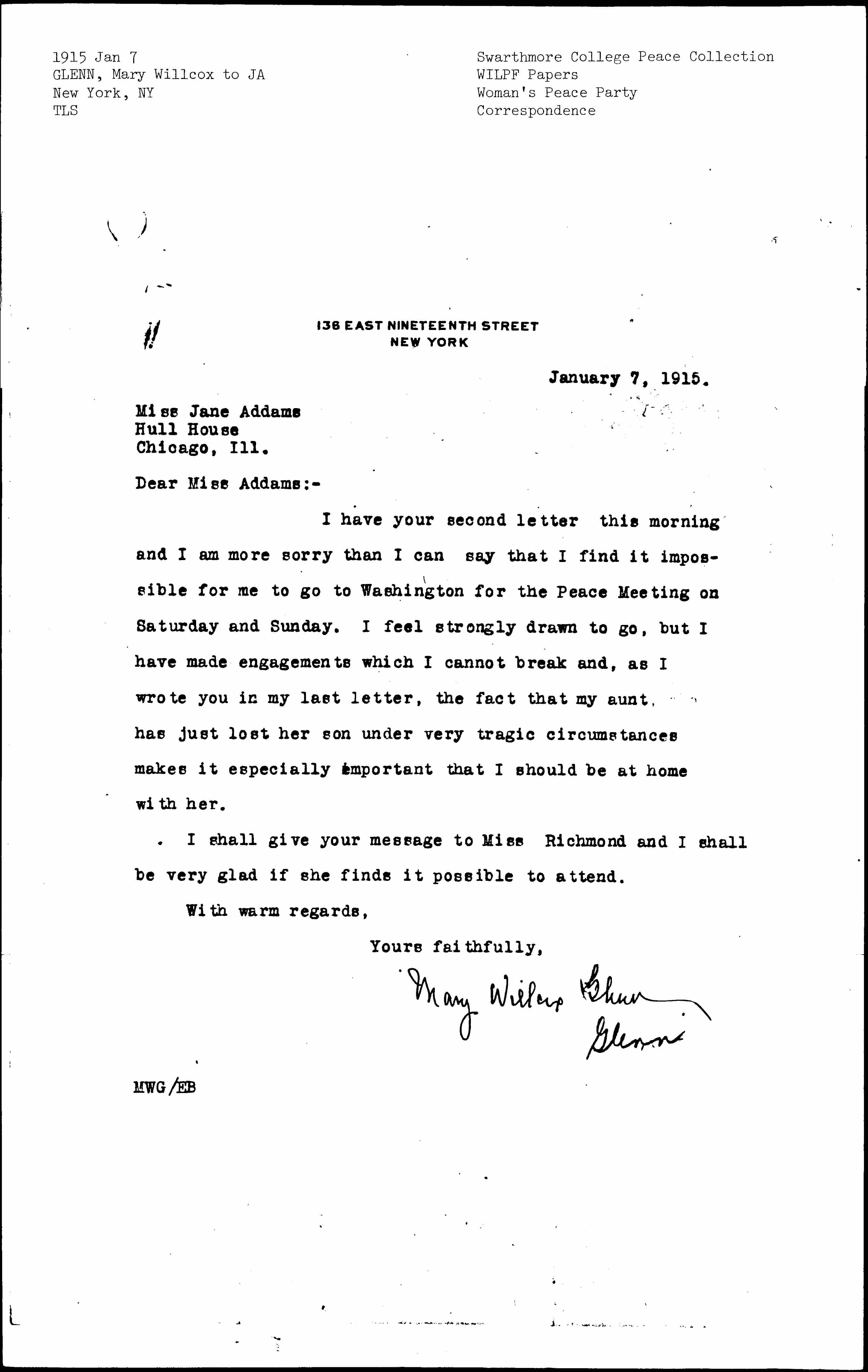I have your second letter this morning and I am more sorry than I can say that I find it impossible for me to go to Washington for the Peace Meeting on Saturday and Sunday. I feel strongly drawn to go, but I have made engagements which I cannot break and, as I wrote you in my last letter, the fact that my aunt has just lost her son under very tragic circumstances makes it especially important that I should be at home with her.