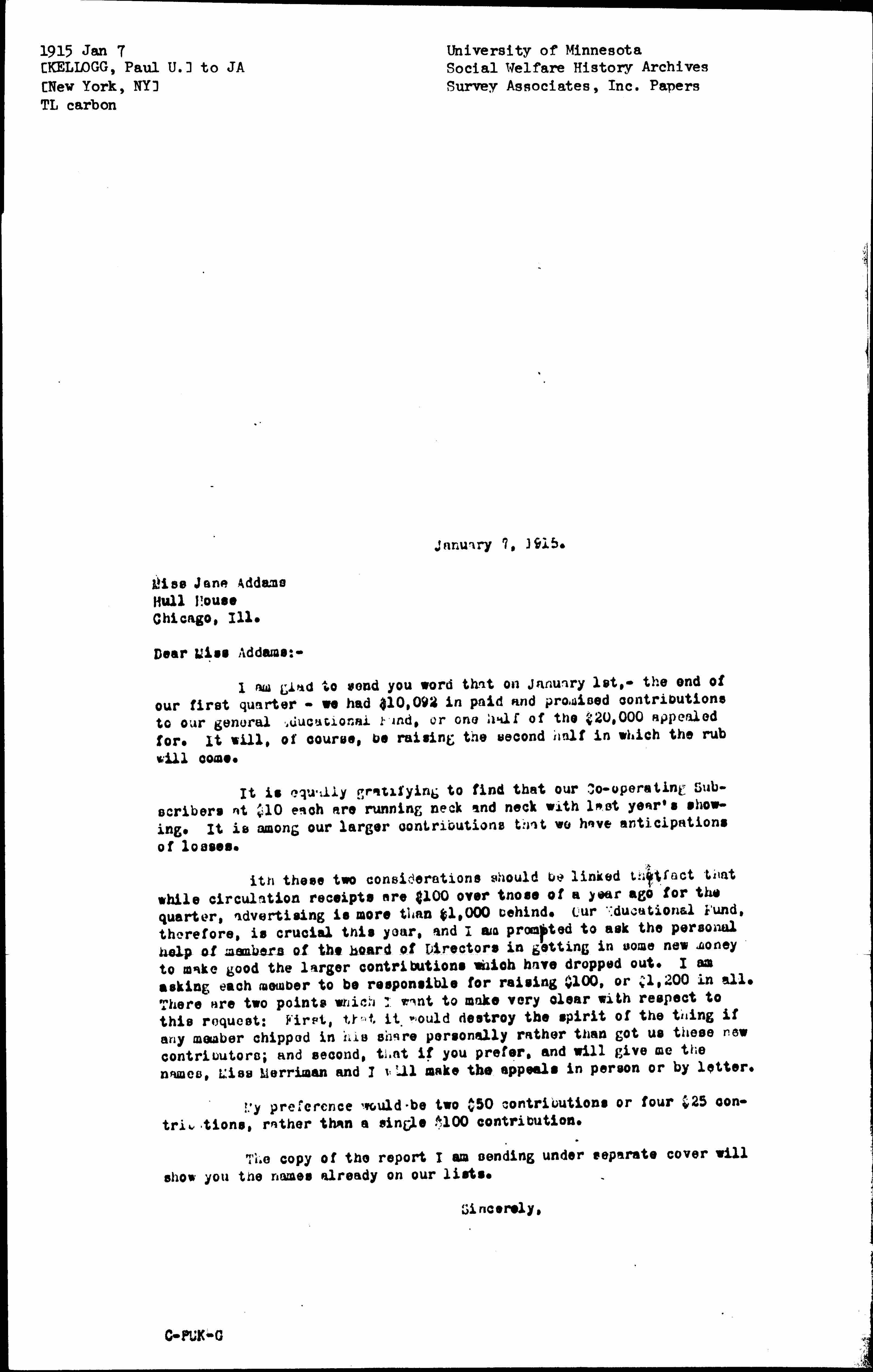I am glad to send you word that on January 1st, -- the end of our first quarter -- we had $10,092 in paid and promised contributions to our general educational fund, or one half of the $20,000 appealed for. It will, of course, be raising the second half in which the rub will come.