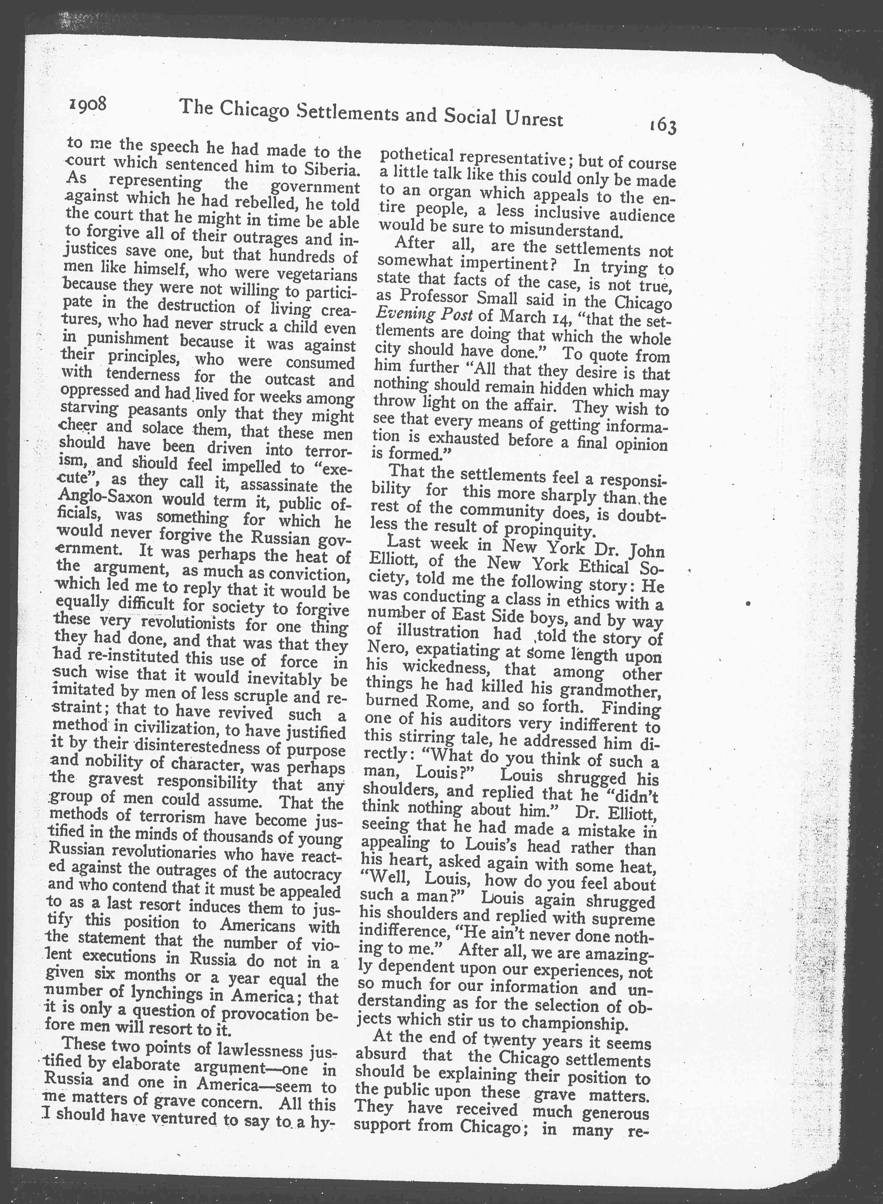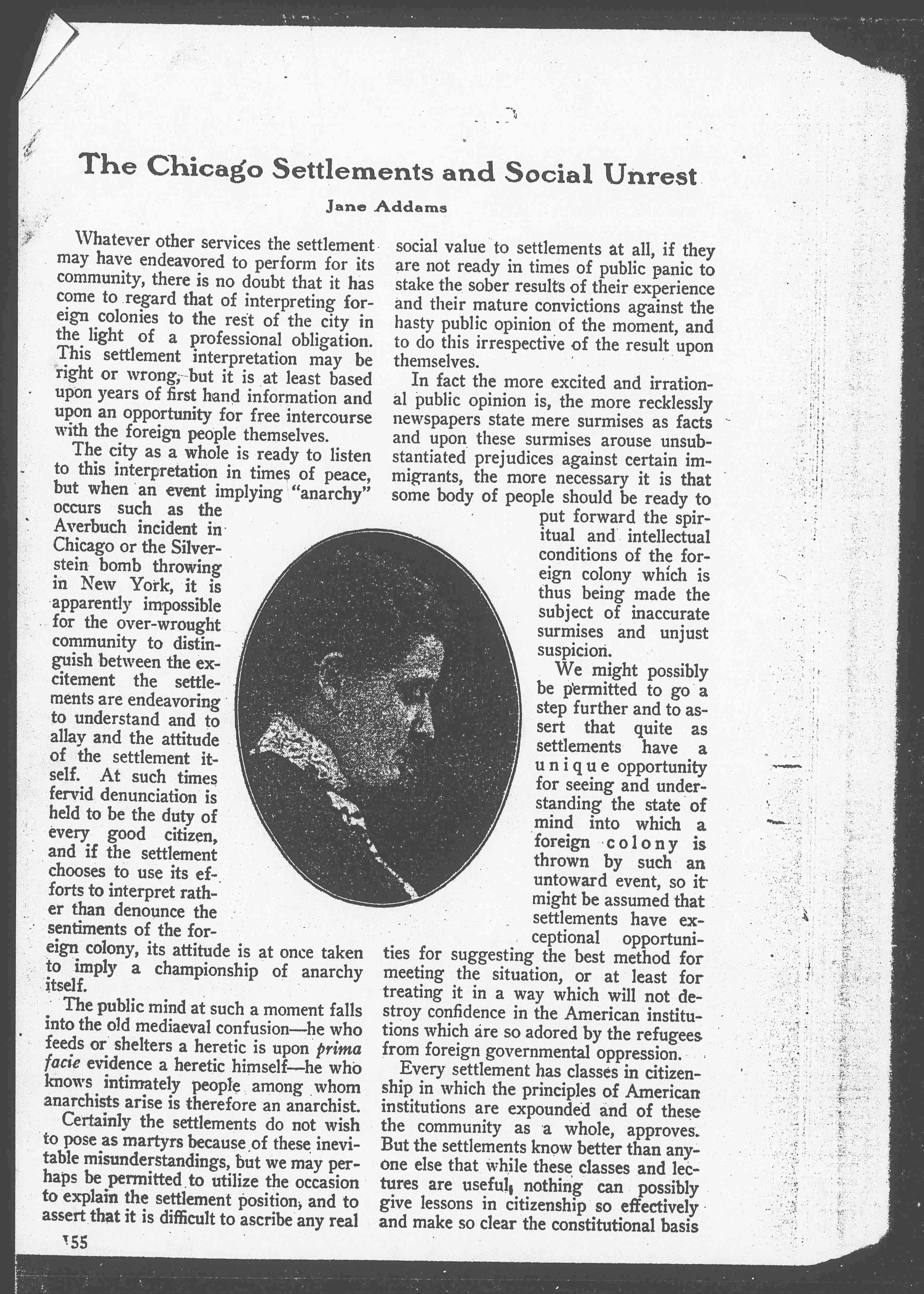 At the end of twenty years it seems absurd that the Chicago settlements should be explaining their position to the public upon these grave matters. They have received much generous support from Chicago; in many respects [page 10] they have been overestimated, but in a moment of great public excitement it is possible that they themselves are realizing for the first time that they have attained a professional standard of conduct and may perhaps begin to clear themselves of the charge of being amateur. This standard may demand that the newly arrived immigrant shall have his defense and his chance, in so far as the settlements can obtain it.