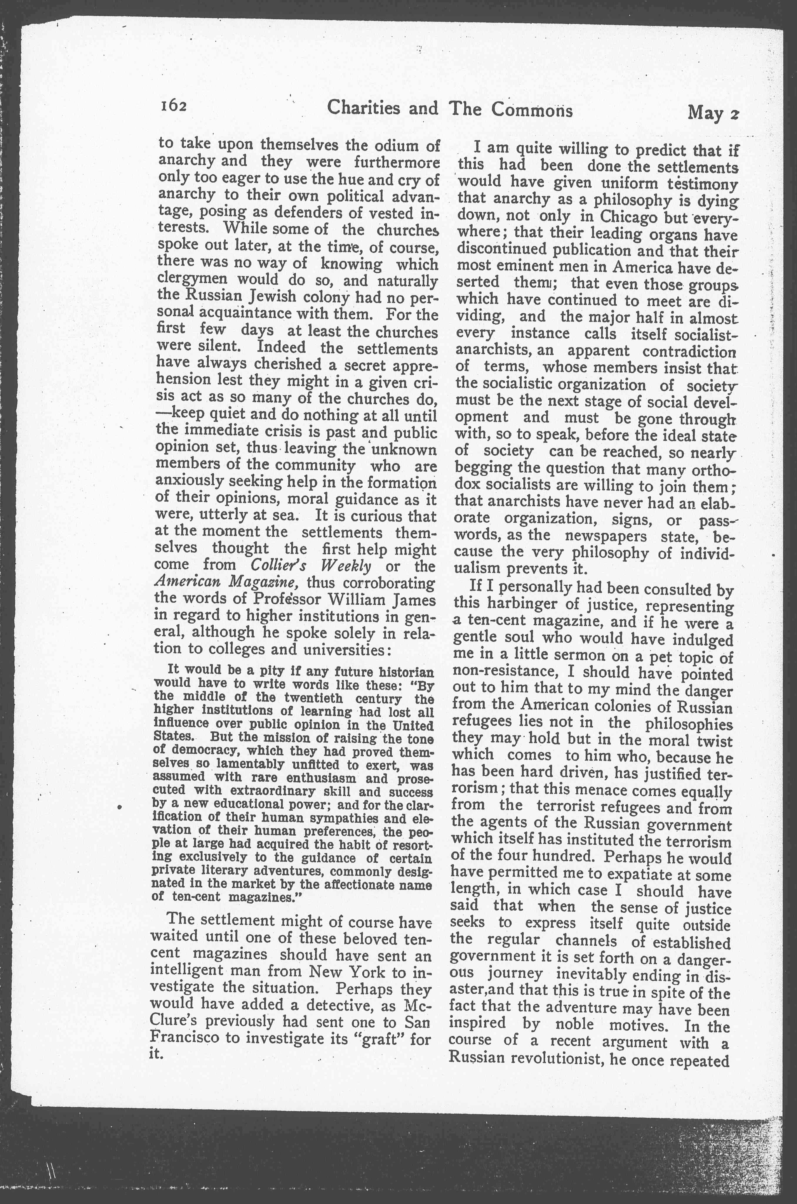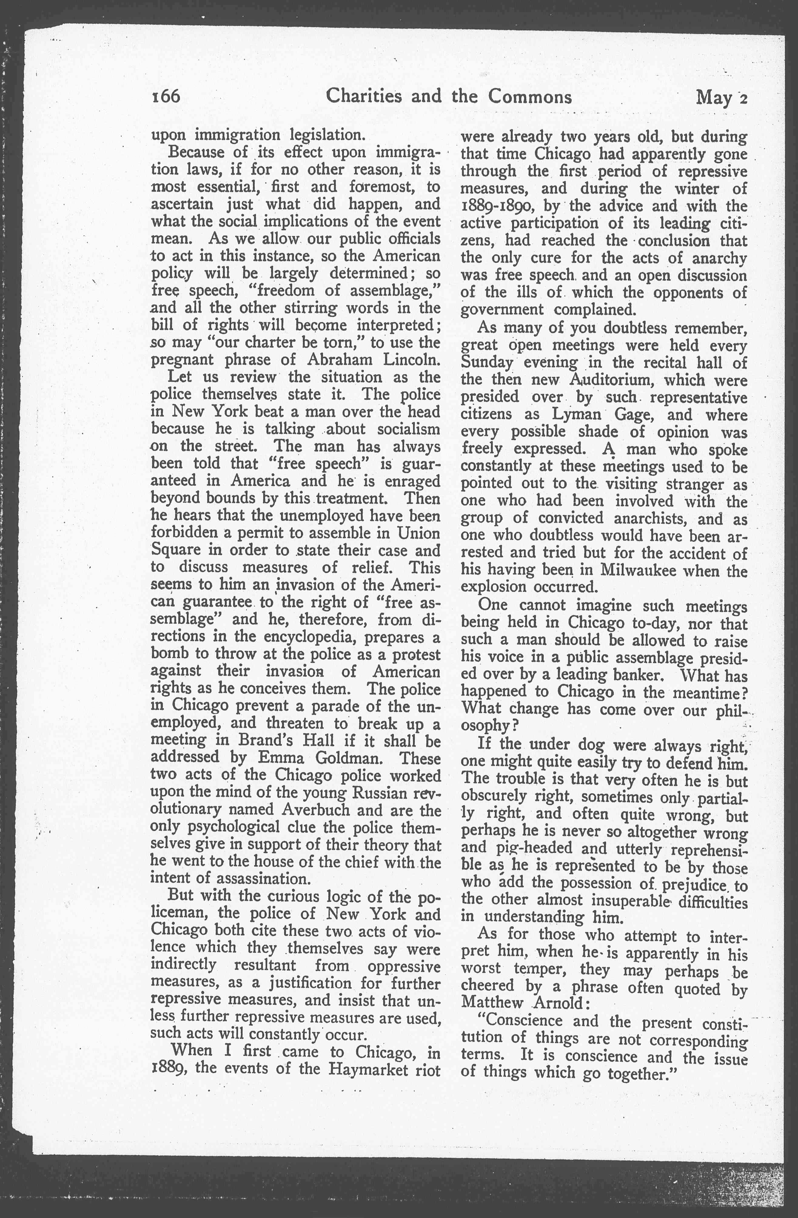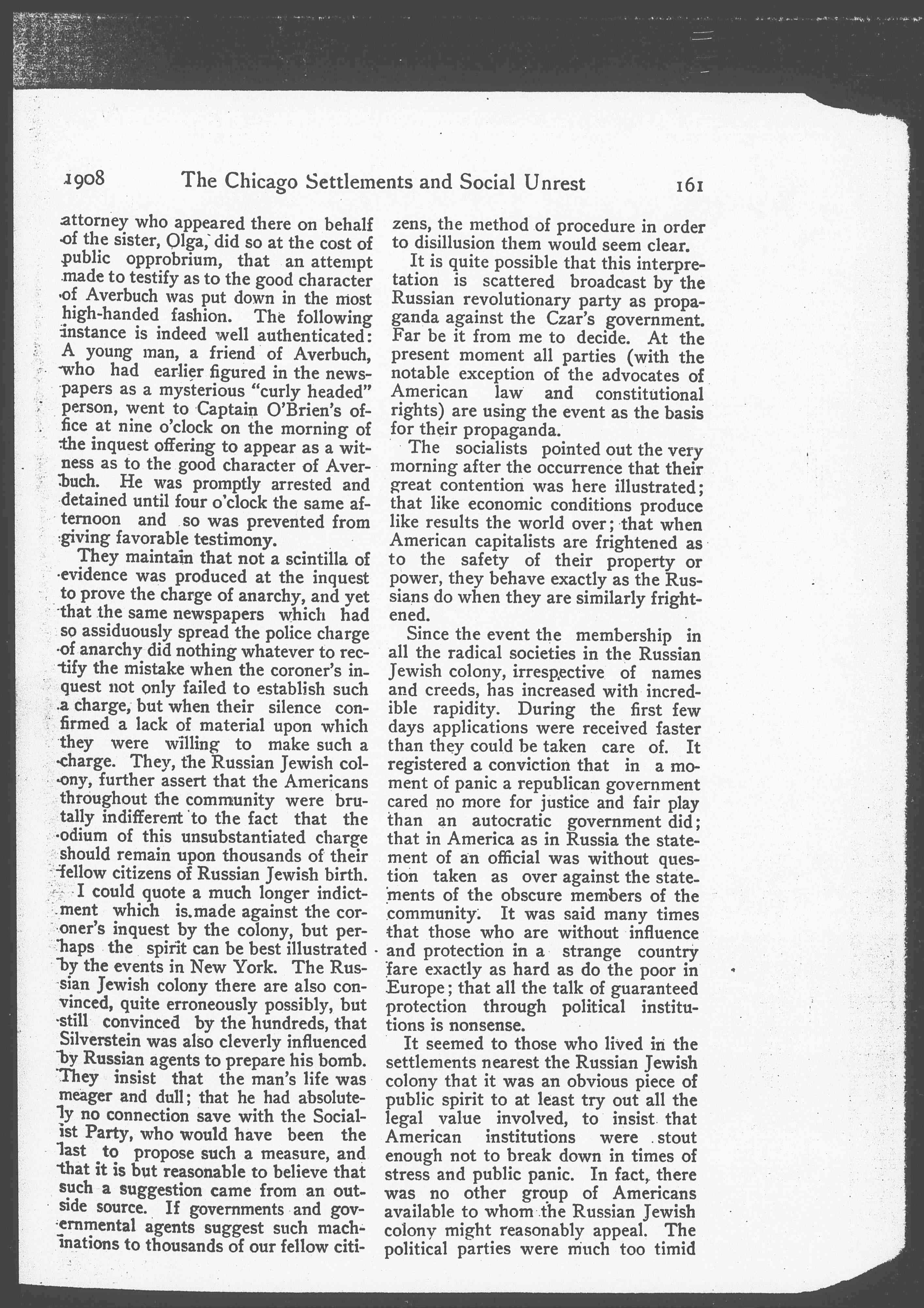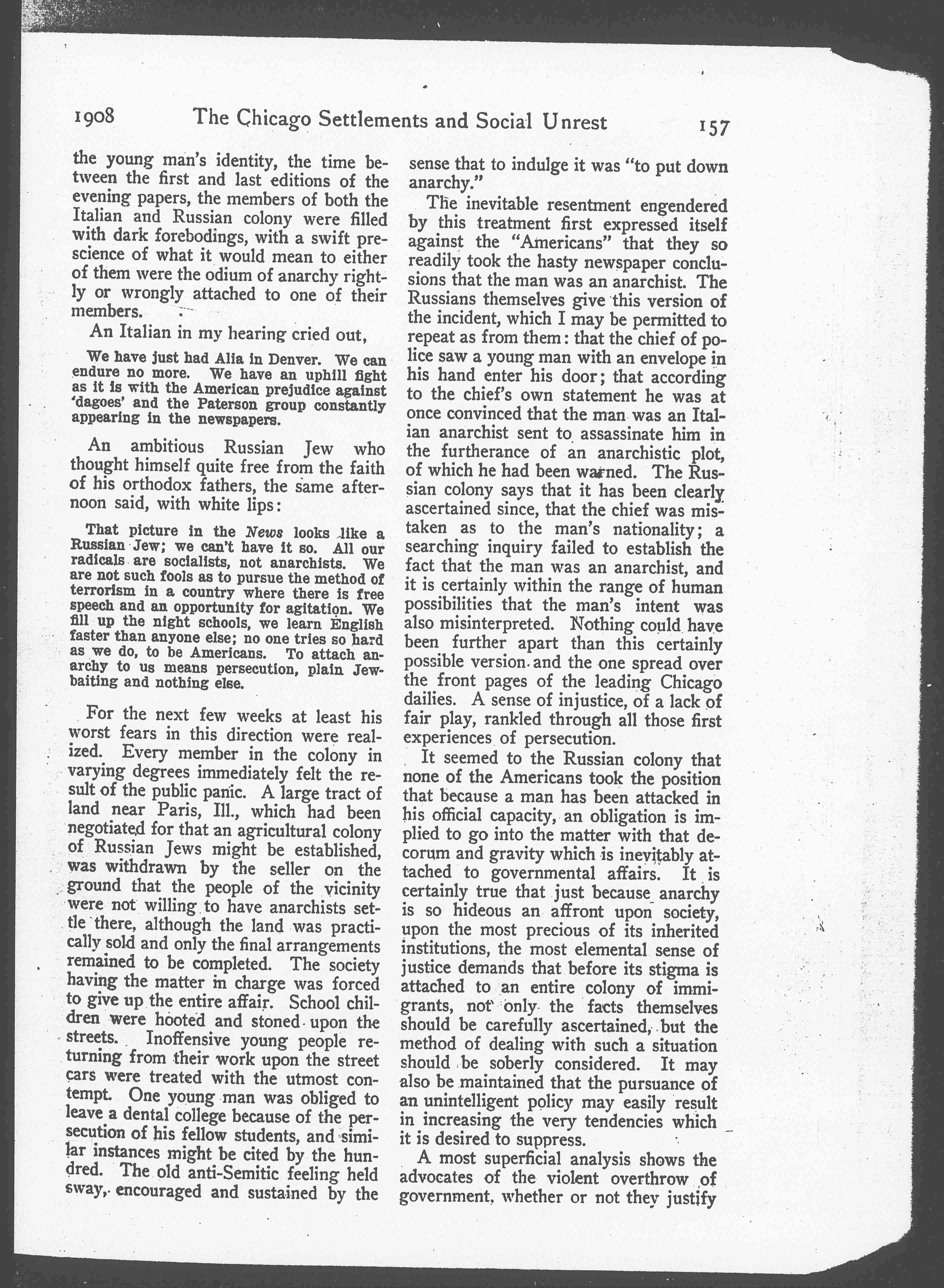 Certain books written by settlement residents are used in the department of social ethics in several American universities. Any value such books may have arises from the fact that they present a first hand study of social and ethical conditions in the immigrant quarters and represent convictions upon which settlement residents are willing to act. That these convictions lead them to advise a different treatment for "anarchy" from that pursued by the Chicago police department may possibly mean that they are advocating an effective treatment instead of a stupid treatment.