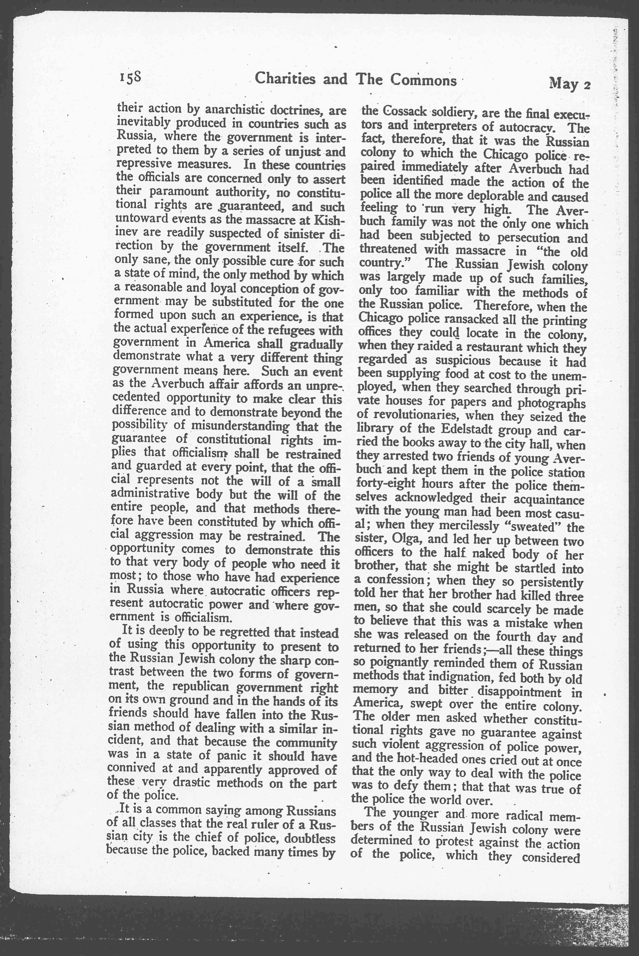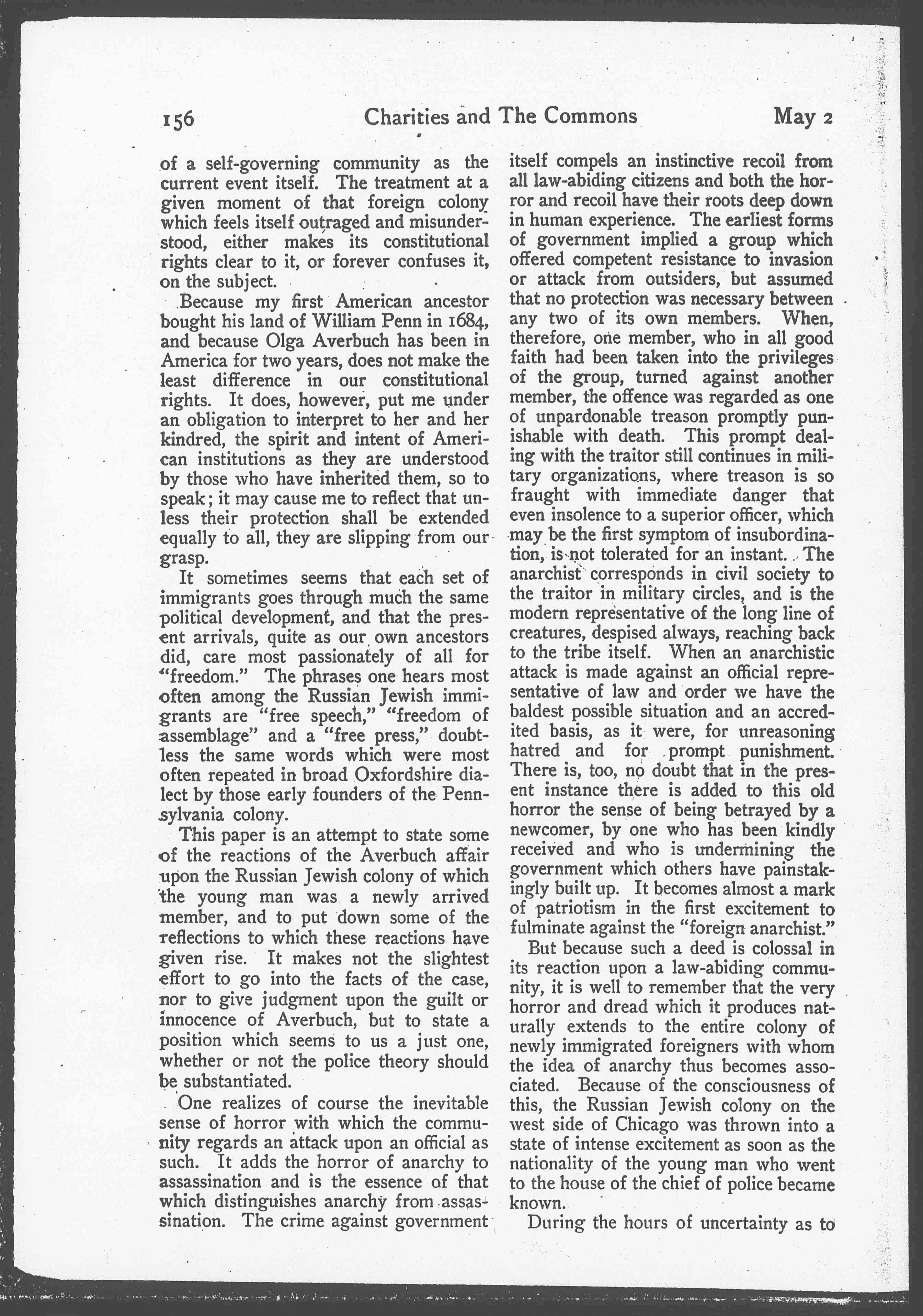 A most superficial analysis shows the advocates of the violent overthrow of government, whether or not they justify [page 4] their action by anarchistic doctrines, are inevitably produced in countries such as Russia, where the government is interpreted to them by a series of unjust and repressive measures. In these countries the officials are concerned only to assert their paramount authority, no constitutional rights are guaranteed, and such untoward events as the massacre at Kishinev are readily suspected of sinister direction by the government itself. The only sane, the only possible cure for such a state of mind, the only method by which a reasonable and loyal conception of government may be substituted for the one formed upon such an experience, is that the actual experience of the refugees with government in America shall gradually demonstrate what a very different thing government means here. Such an event as the Averbuch affair affords an unprecedented opportunity to make clear this difference and to demonstrate beyond the possibility of misunderstanding that the guarantee of constitutional rights implies that officialism shall be restrained and guarded at every point, that the official represents not the will of a small administrative body but the will of the entire people, and that methods therefore have been constituted by which official aggression may be restrained. The opportunity comes to demonstrate this to that very body of people who need it most; to those who have had experience in Russia where autocratic officers represent autocratic power and where government is officialism.