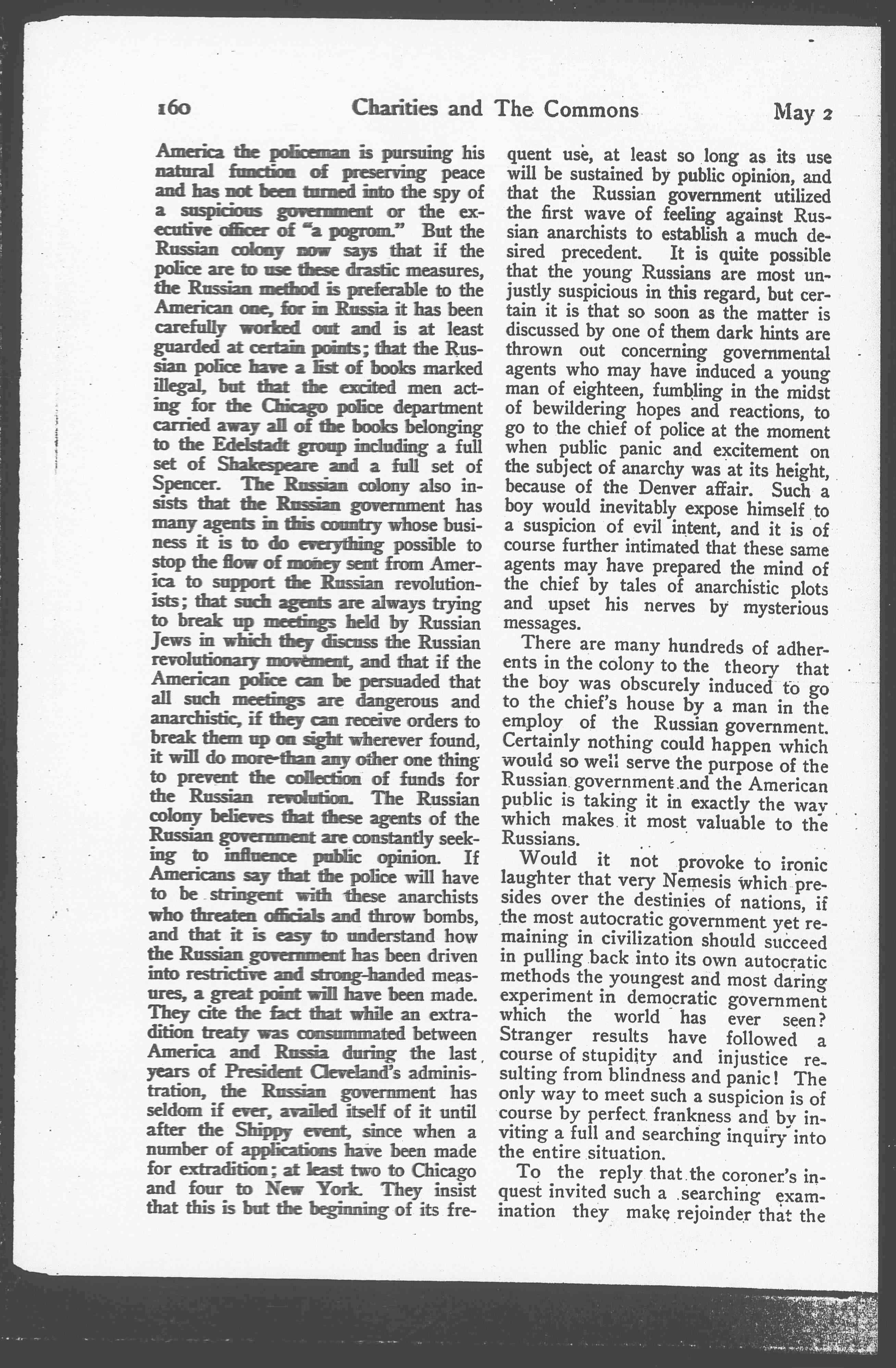 This attitude toward the police on the part of the young Russian revolutionaries is in itself a new development. Their normal attitude has been that in [page 6] America the policeman is pursuing his natural function of preserving peace and has not been turned into the spy of a suspicious government or the executive officer of "a pogrom." But the Russian colony now says that if the police are to use these drastic measures, the Russian method is preferable to the American one, for in Russia it has been carefully worked out and is at least guarded at certain points; that the Russian police have a list of books marked illegal, but that the excited men acting for the Chicago police department carried away all of the books belonging to the Edelstadt group including a full set of Shakespeare and a full set of Spencer. The Russian colony also insists that the Russian government has many agents in this country whose business it is to do everything possible to stop the flow of money sent from America to support the Russian revolutionists; that such agents are always trying to break up meetings held by Russian Jews in which they discuss the Russian revolutionary movement, and that if the American police can be persuaded that all such meetings are dangerous and anarchistic, if they can receive orders to break them up on sight wherever found, it will do more than any other one thing to prevent the collection of funds for the Russian revolution. The Russian colony believes that these agents of the Russian government are constantly seeking to influence public opinion. If Americans say that the police will have to be stringent with these anarchists who threaten officials and throw bombs, and that it is easy to understand how the Russian government has been driven into restrictive and strong-handed measures, a great point will have been made. They cite the fact that while an extradition treaty was consummated between America and Russia during the last years of President Cleveland's administration, the Russian government has seldom if ever, availed itself of it until after the Shippy event, since when a number of applications have been made for extradition; at least two to Chicago and four to New York. They insist that this is but the beginning of its frequent use, at least so long as its use will be sustained by public opinion, and that the Russian government utilized the first wave of feeling against Russian anarchists to establish a much desired precedent. It is quite possible that the young Russians are most unjustly suspicious in this regard, but certain it is that so soon as the matter is discussed by one of them dark hints are thrown out concerning governmental agents who may have induced a young man of eighteen, fumbling in the midst of bewildering hopes and reactions, to go to the chief of police at the moment when public panic and excitement on the subject of anarchy was at its height, because of the Denver affair. Such a boy would inevitably expose himself to a suspicion of evil intent, and it is of course further intimated that these same agents may have prepared the mind of the chief by tales of anarchistic plots and upset his nerves by mysterious messages.