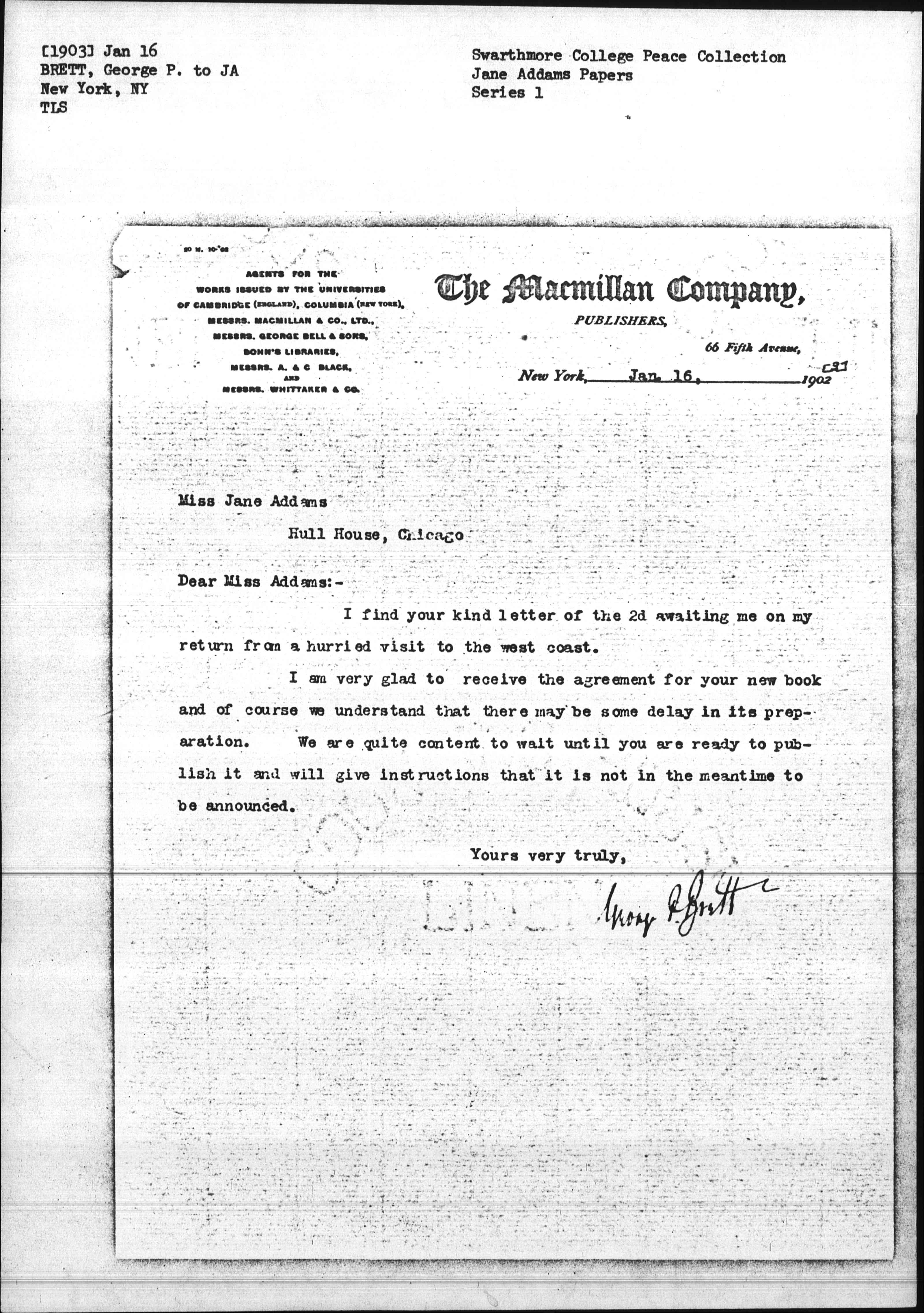I am very glad to receive the agreement for your new book and of course we understand that there may be some delay in its preparation. We are quite content to wait until you are ready to publish it and will give instructions that it is not in the meantime to be announced.
