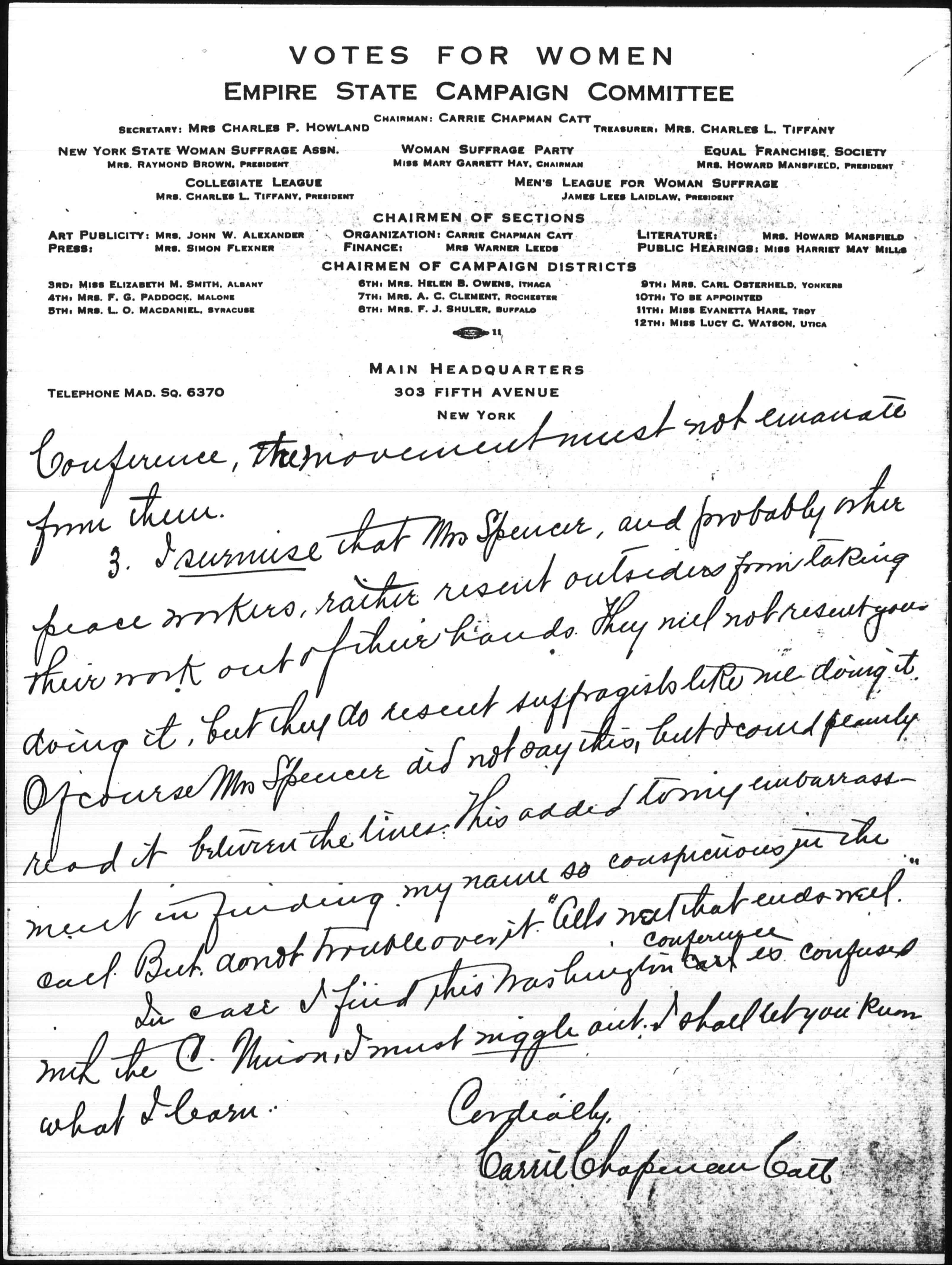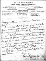 Of course, as Chairman of the suffrage campaign in NY. I must not be caught in any connection with the Congressional Union, not on account of any Washington conditions, nor the feud between them and the National but on account of their anti-democratic policy