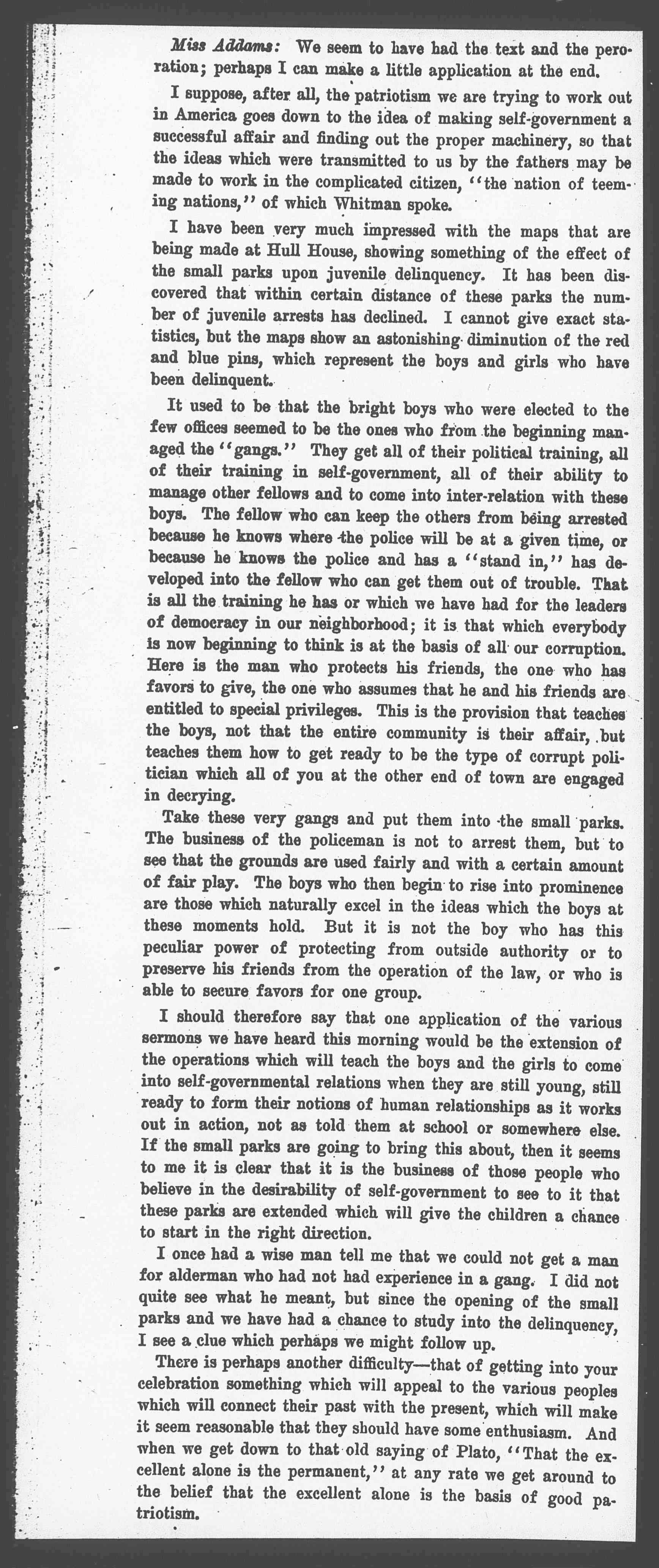 I once had a wise man tell me that we could not get a man for alderman who had not had experience in a gang. I did not quite see what he meant, but since the opening of the small parks and we have had the chance to study into the delinquency, I see a clue which perhaps we might follow up.