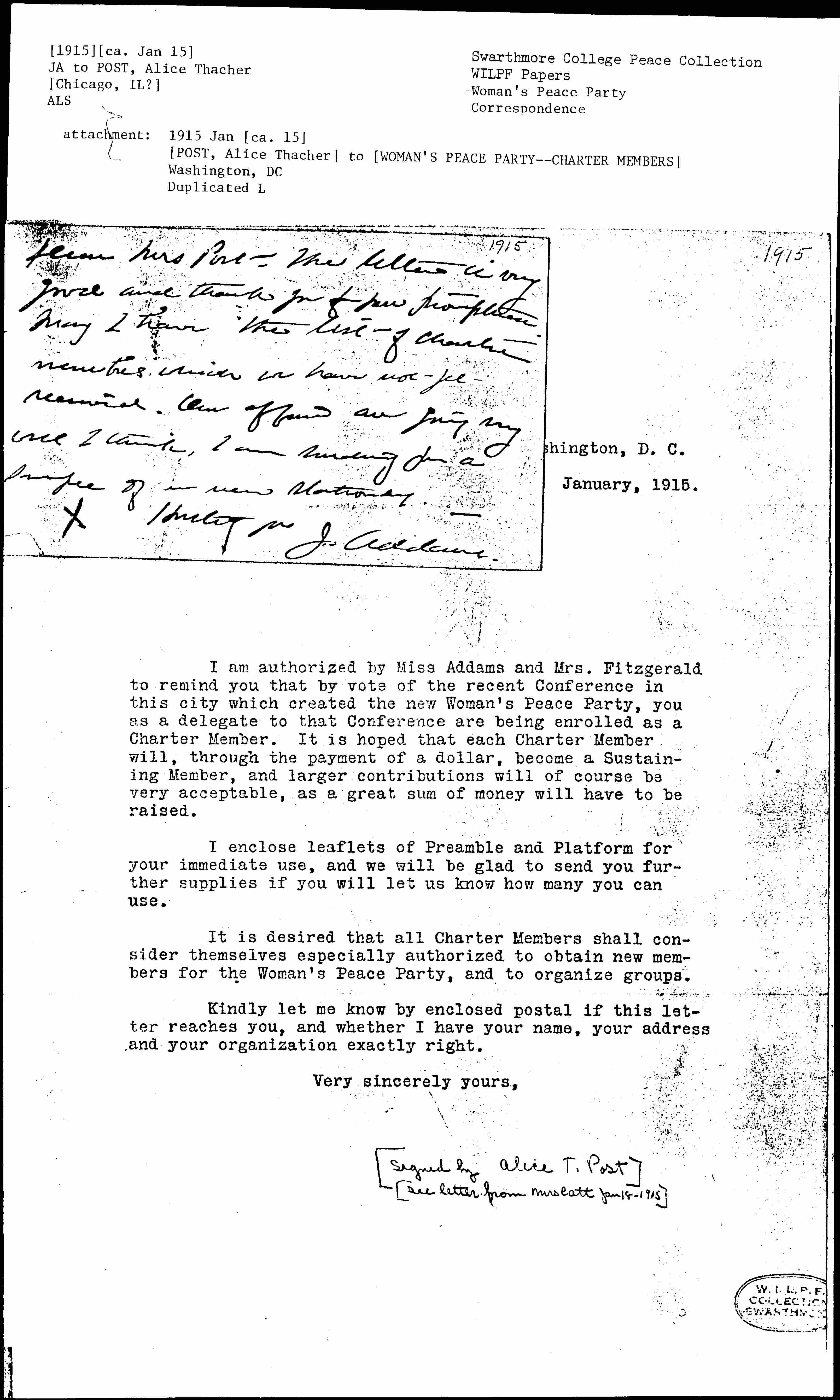 I am authorized by Miss Addams and Mrs. Fitzgerald to remind you that by vote of the recent Conference in this city which created the new Woman's Peace Party, you as a delegate to that Conference are being enrolled as a Charter Member. It is hoped that each Charter Member will, through the payment of a dollar, become a Sustaining Member, and larger contributions will of course be very acceptable, as a great sum of money will have to be raised.