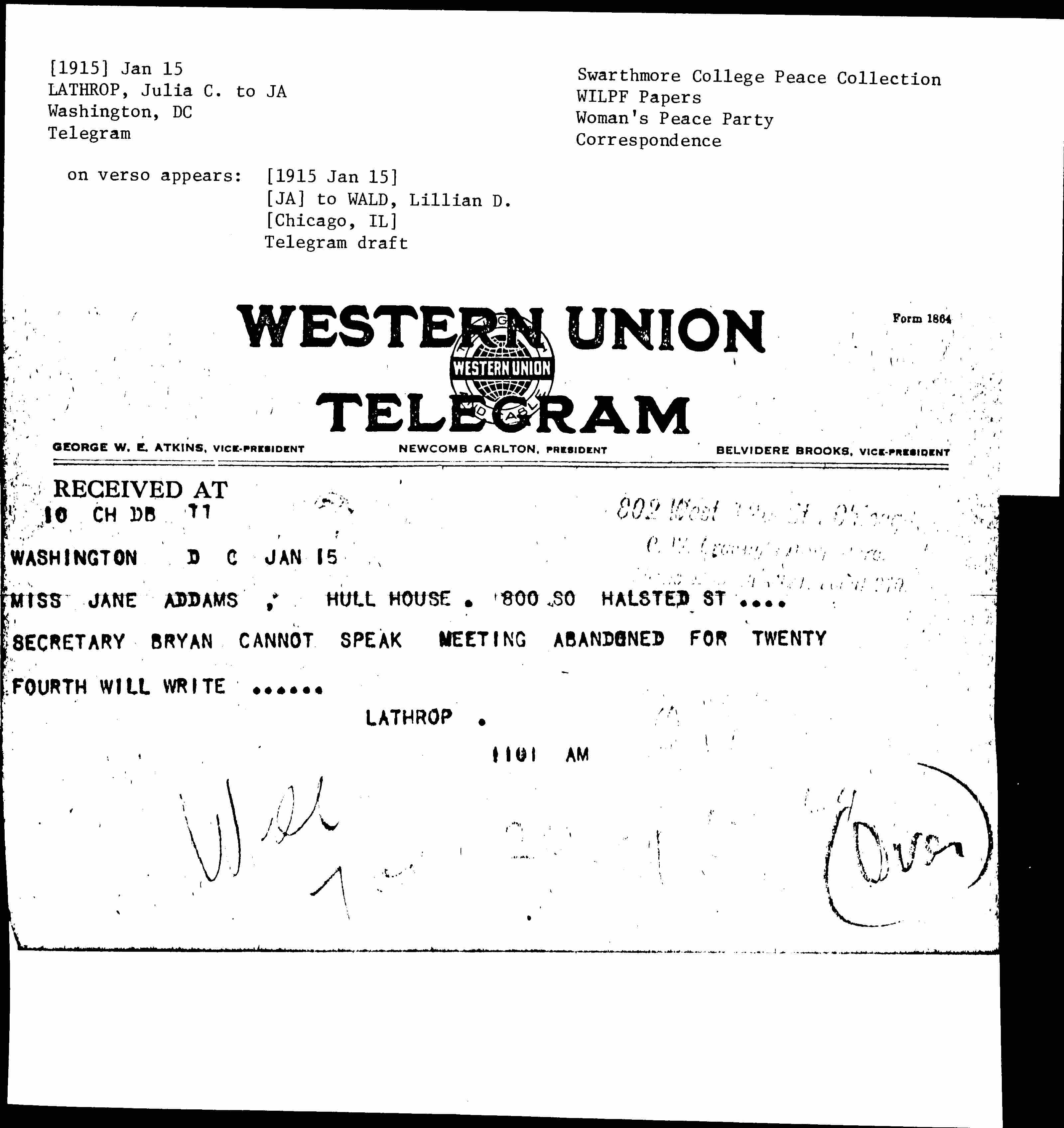 SECRETARY BRYAN CANNOT SPEAK MEETING ABANDONED FOR TWENTY FOURTH WILL WRITE.