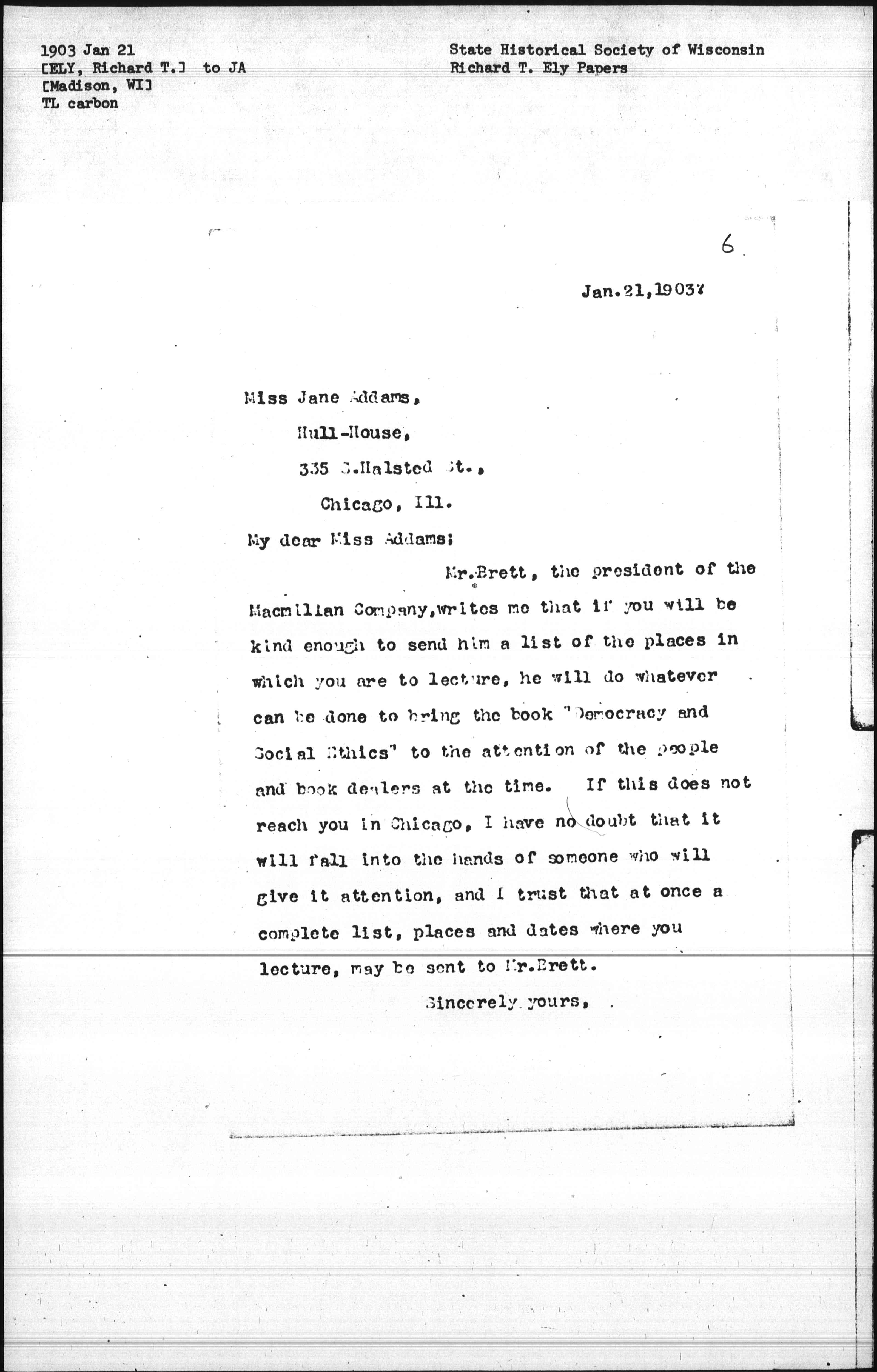 Mr. Brett, the president of the Macmillan Company, writes me that if you will be kind enough to send him a list of the places in which you are to lecture, he will do whatever can be done to bring the book "Democracy and Social Ethics" to the attention of the people and book dealers at the time. If this does not reach you in Chicago, I have no doubt that it will fall into the hands of someone who will give it attention, and I trust that at once a complete list, places and dates where you lecture, may be sent to Mr. Brett.