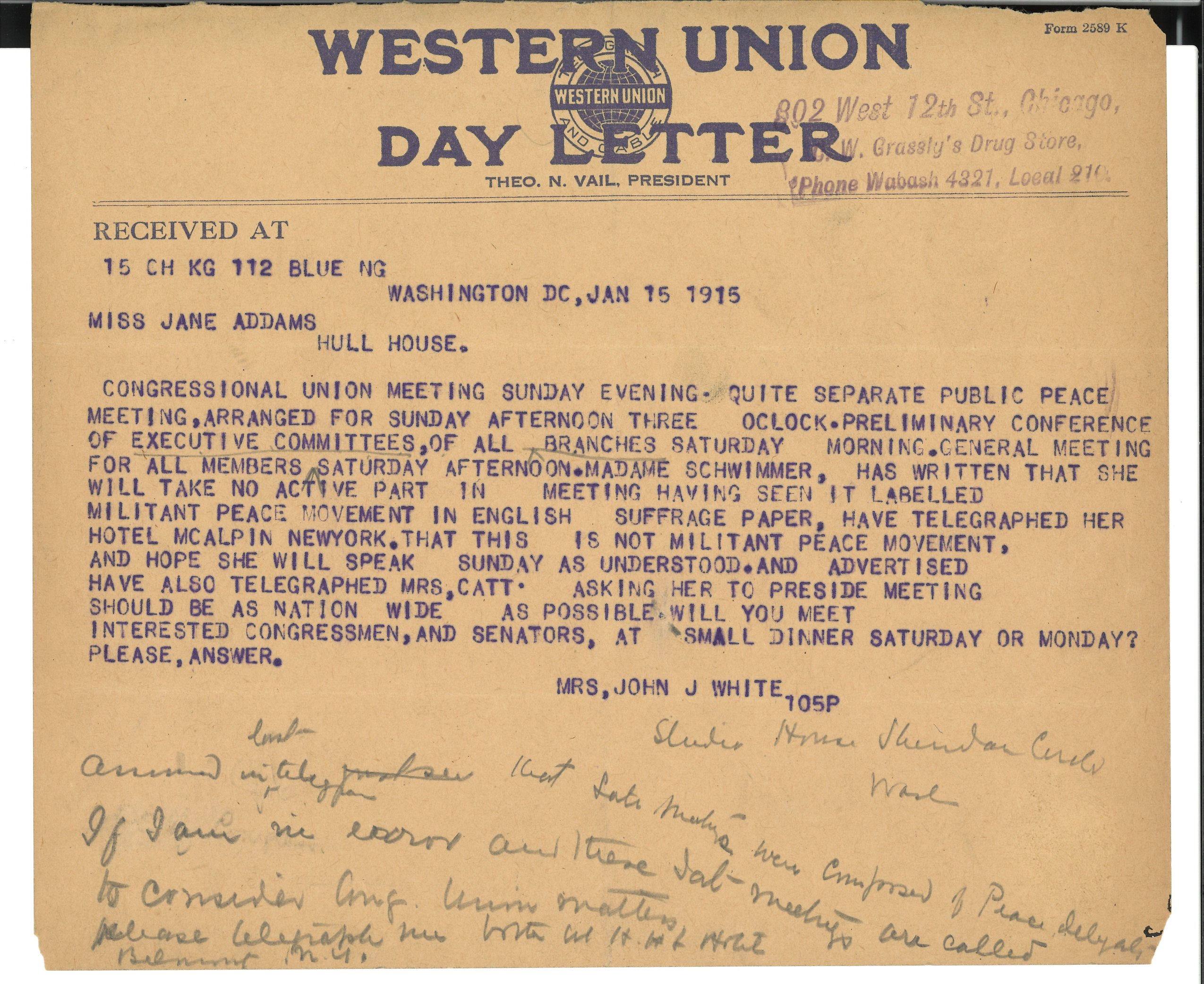 CONGRESSIONAL UNION MEETING SUNDAY EVENING. QUITE SEPARATE PUBLIC PEACE MEETING, ARRANGED FOR SUNDAY AFTERNOON THREE O'CLOCK. PRELIMINARY CONFERENCE OF EXECUTIVE COMMITTEES, OF ALL BRANCHES SATURDAY MORNING. GENERAL MEETING FOR ALL MEMBERS SATURDAY AFTERNOON. MADAME SCHWIMMER, HAS WRITTEN THAT SHE WILL TAKE NO ACTIVE PART IN MEETING HAVING SEEN IT [LABELED] MILITANT PEACE MOVEMENT IN ENGLISH SUFFRAGE PAPER, HAVE TELEGRAPHED HER HOTEL MCALPIN NEW YORK. THAT THIS IS NOT MILITANT PEACE MOVEMENT, AND HOPE SHE WILL SPEAK SUNDAY AS UNDERSTOOD. AND ADVERTISED HAVE ALSO TELEGRAPHED MRS. CATT. ASKING HER TO PRESIDE MEETING SHOULD BE AS NATION WIDE AS POSSIBLE. WILL YOU MEET INTERESTED CONGRESSMEN, AND SENATORS, AT SMALL DINNER SATURDAY OR MONDAY? PLEASE, ANSWER.