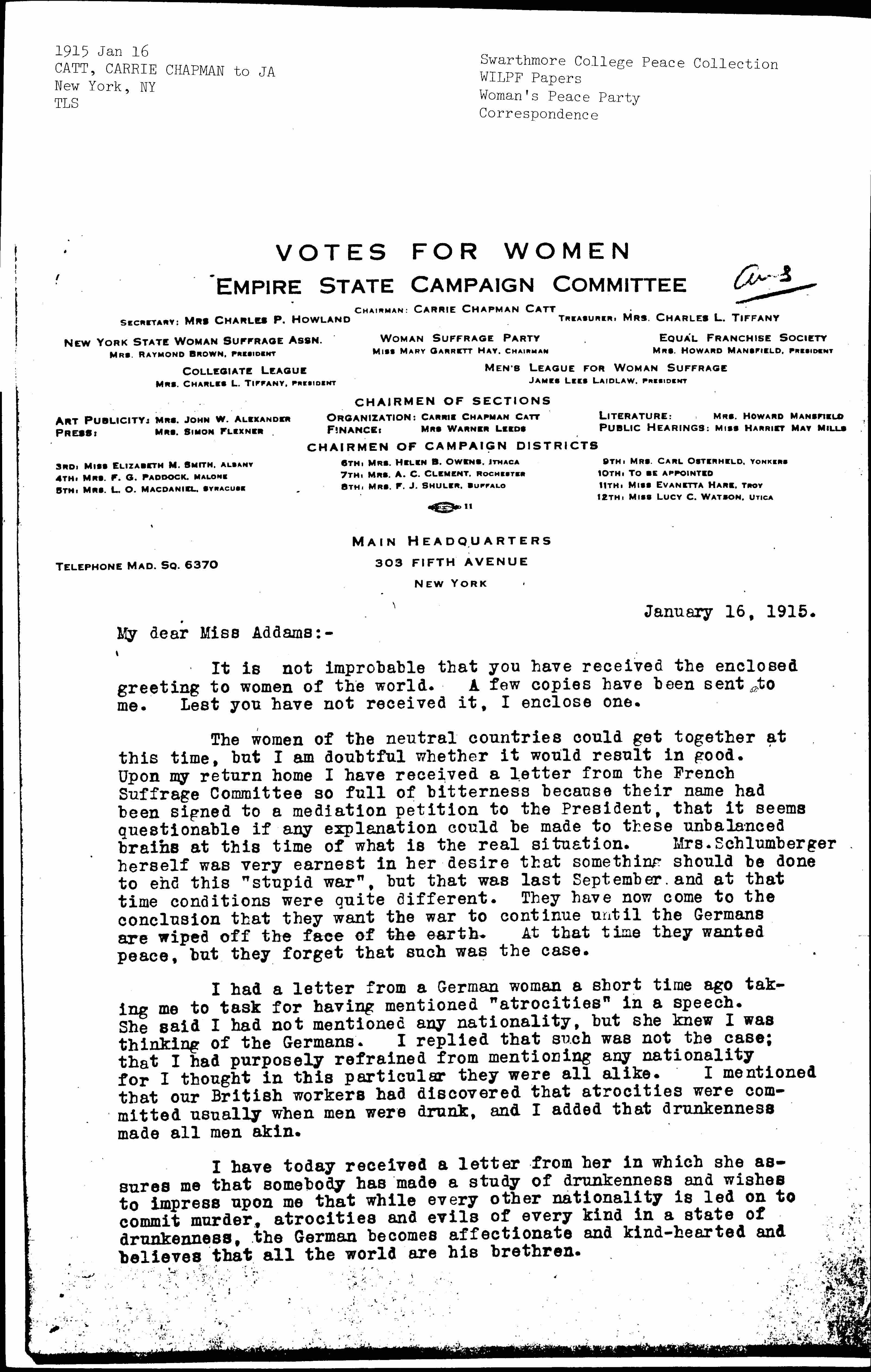 The women of the neutral countries could get together at this time, but I am doubtful whether it would result in good. Upon my return home I have received a letter from the French Suffrage Committee so full of bitterness because their name had been signed to a mediation petition to the President, that it seems questionable if any explanation could be made to these unbalanced brains at this time of what is the real situation. Mrs. Schlumberger herself was very earnest in her desire that something should be done to end this "stupid war", but that was last September and at that time conditions were quite different. They have now come to the conclusion that they want the war to continue until the Germans are wiped off the face of the earth. At that time they wanted peace, but they forget that such was the case.