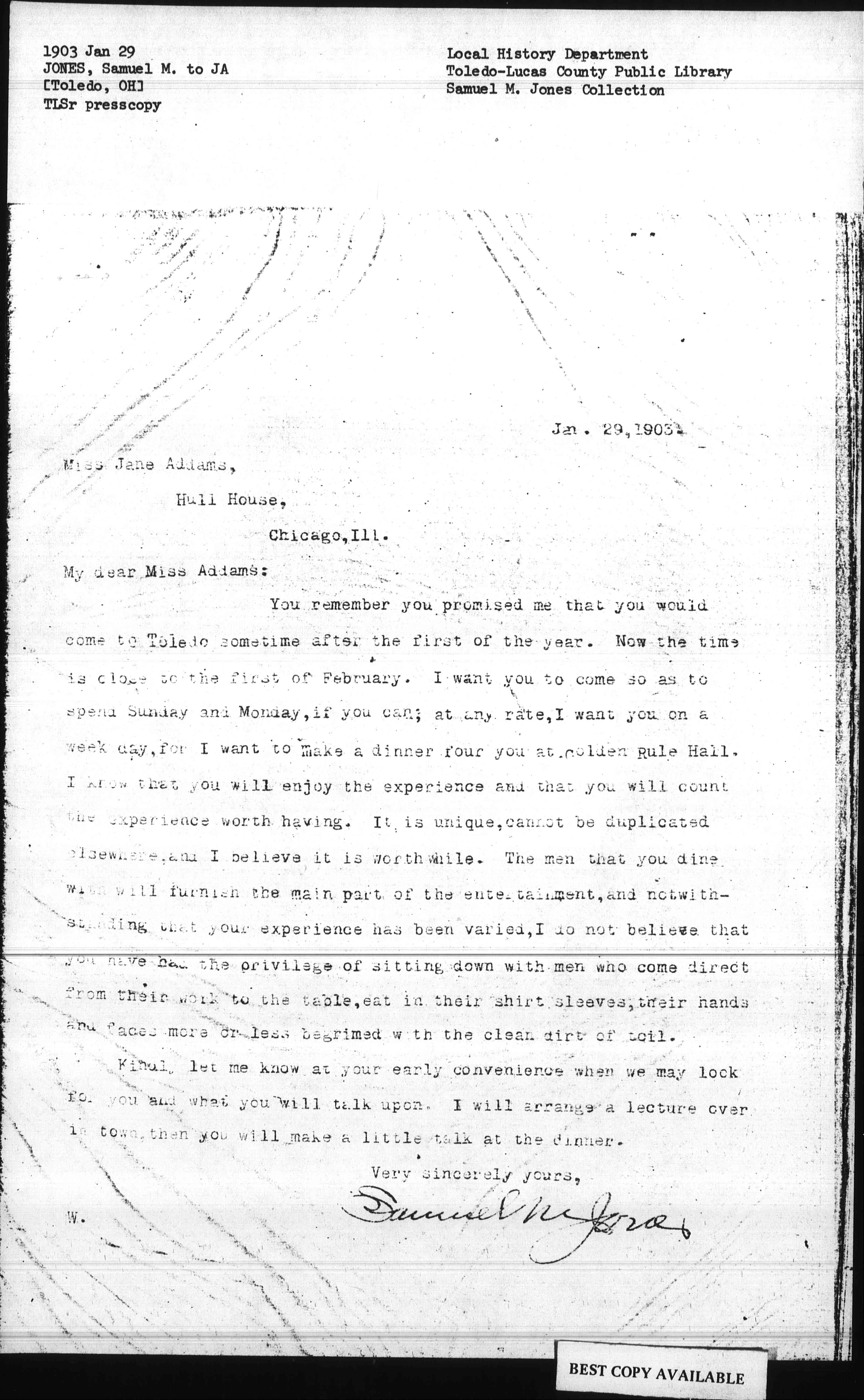 You remember you promised me that you would come to Toledo sometime after the first of the year. Now the time is close to the first of February. I want you to come so as to spend Sunday and Monday, if you can; at any rate, I want you on a week day, for I want to make a dinner [for] you at Golden Rule Hall. I [know] that you will enjoy the experience and that you will count the experience worth having. It is unique, cannot be duplicated [elsewhere], and I believe it is worthwhile. The men that you dine with will furnish the main part of the entertainment, and notwithstanding that your experience has been varied, I do not believe that you have had the privilege of sitting down with men who come direct from their work to the table, eat in their shirt sleeves, their hands and faces more or less begrimed with the clean dirt of toil.