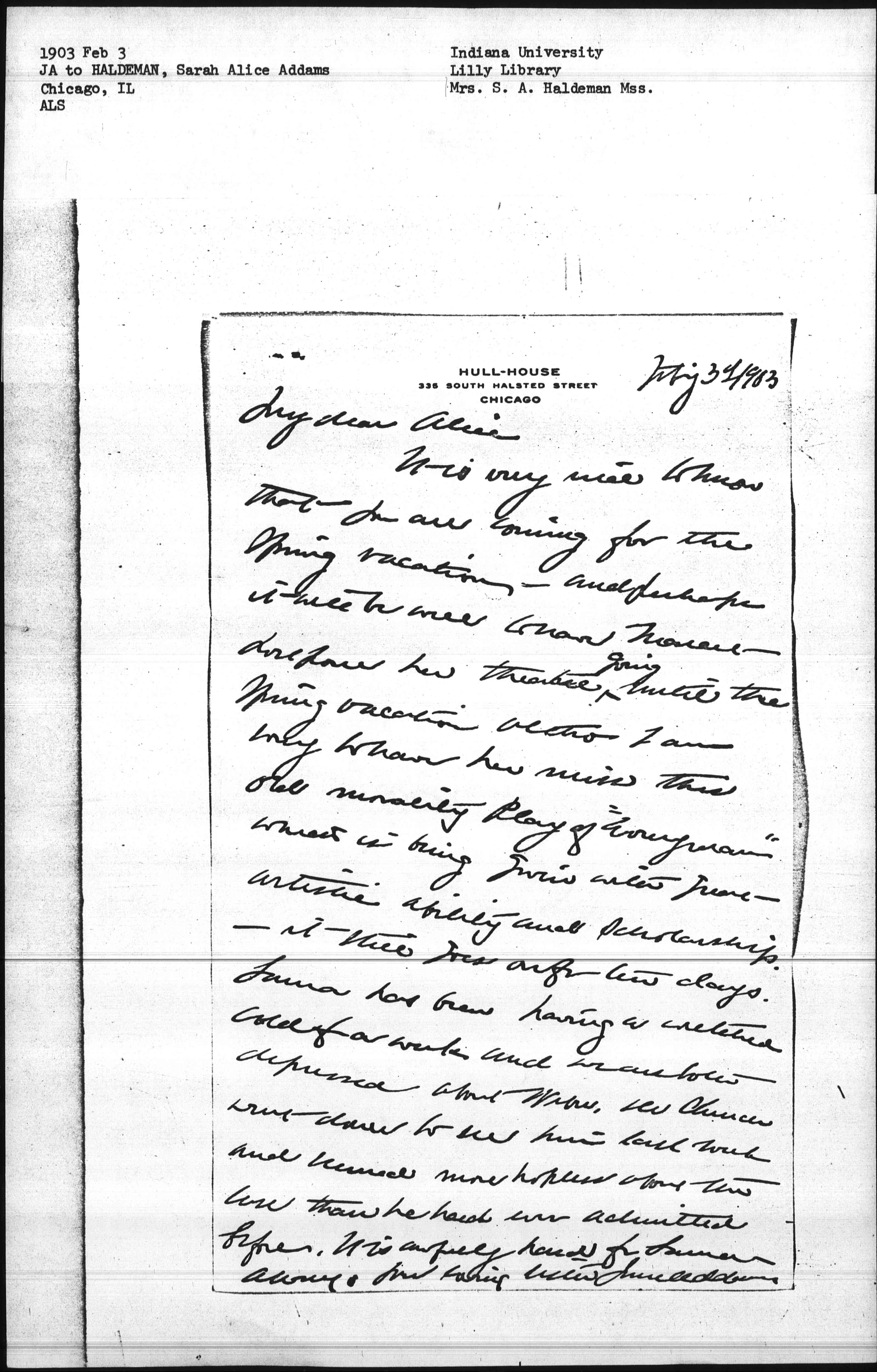 Always your loving sister Jane Addams