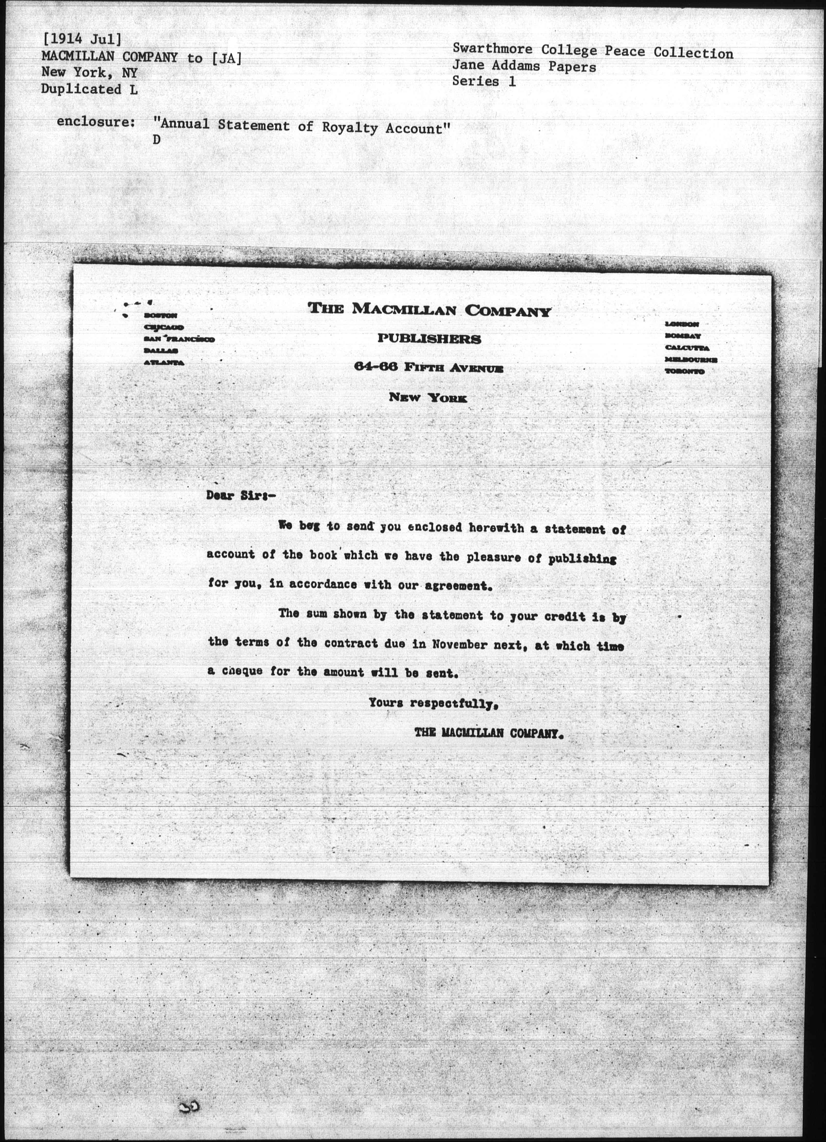 The sum shown by the statement to your credit is by the terms of the contract due in November next, at which time a [check] for the amount will be sent.