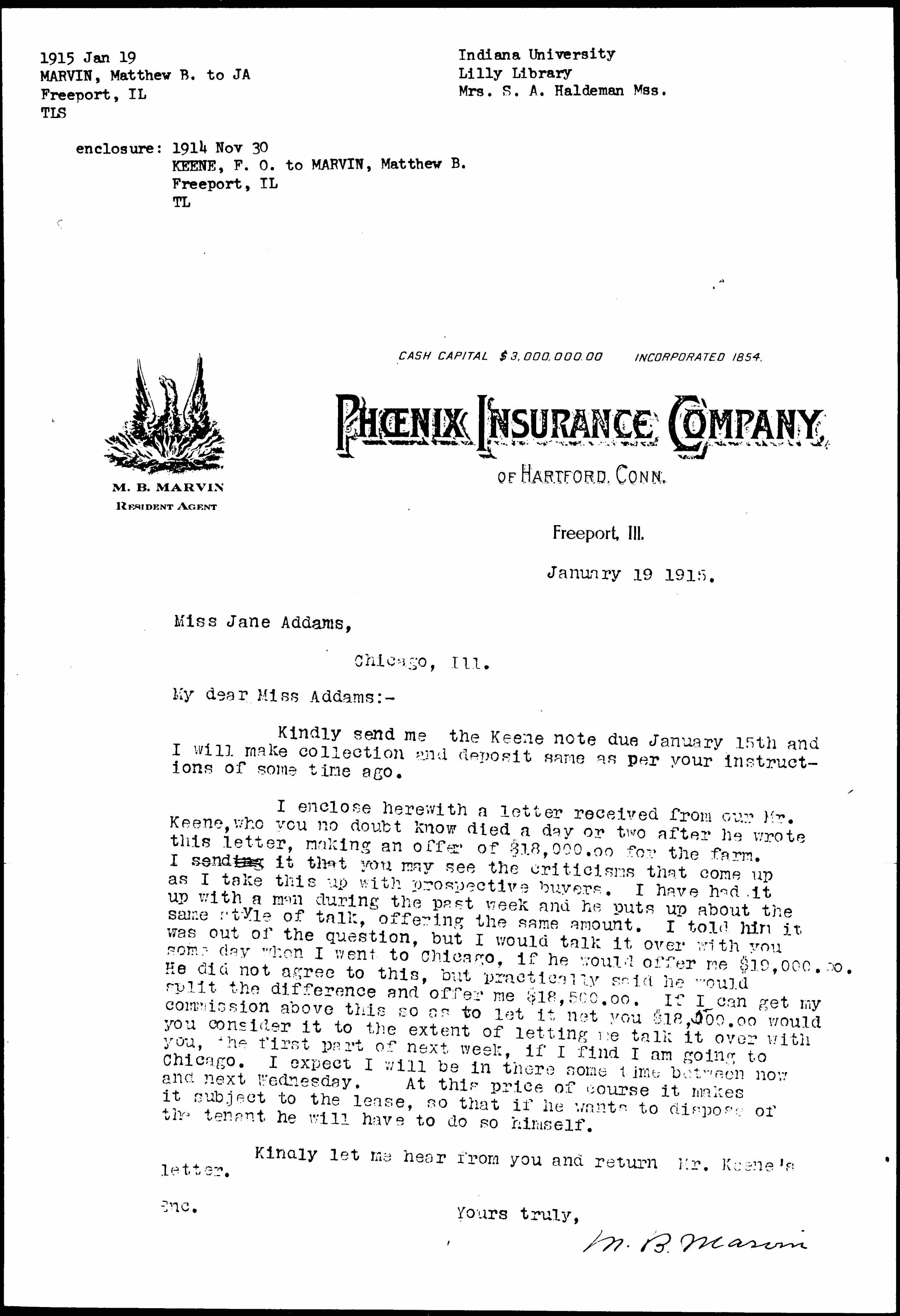 I enclose herewith a letter received from our Mr. Keene, who you no doubt know died a day or two after he wrote this letter, making an offer of $18,000.00 for the farm. I sending it that you may see the criticisms that come up as I take this up with prospective buyers. I have had it up with a man during the past week and he puts up about the same style of talk, offering the same amount. I told him it was out of the question, but I would talk it over with you some day when I went to Chicago, if he would offer me $19,000.00. He did not agree to this, but practically said he would split the difference and offer me $18,500.00. If I can get my commission above this so as to let it net you $18,500.00 would you consider it to the extent of letting me talk it over with you, the first part of next week, if I find I am going to Chicago. I expect I will be in there some time between now and next Wednesday. At this price of course it makes it subject to the lease, so that if he wants to dispose of the tenant he will have to do so himself.