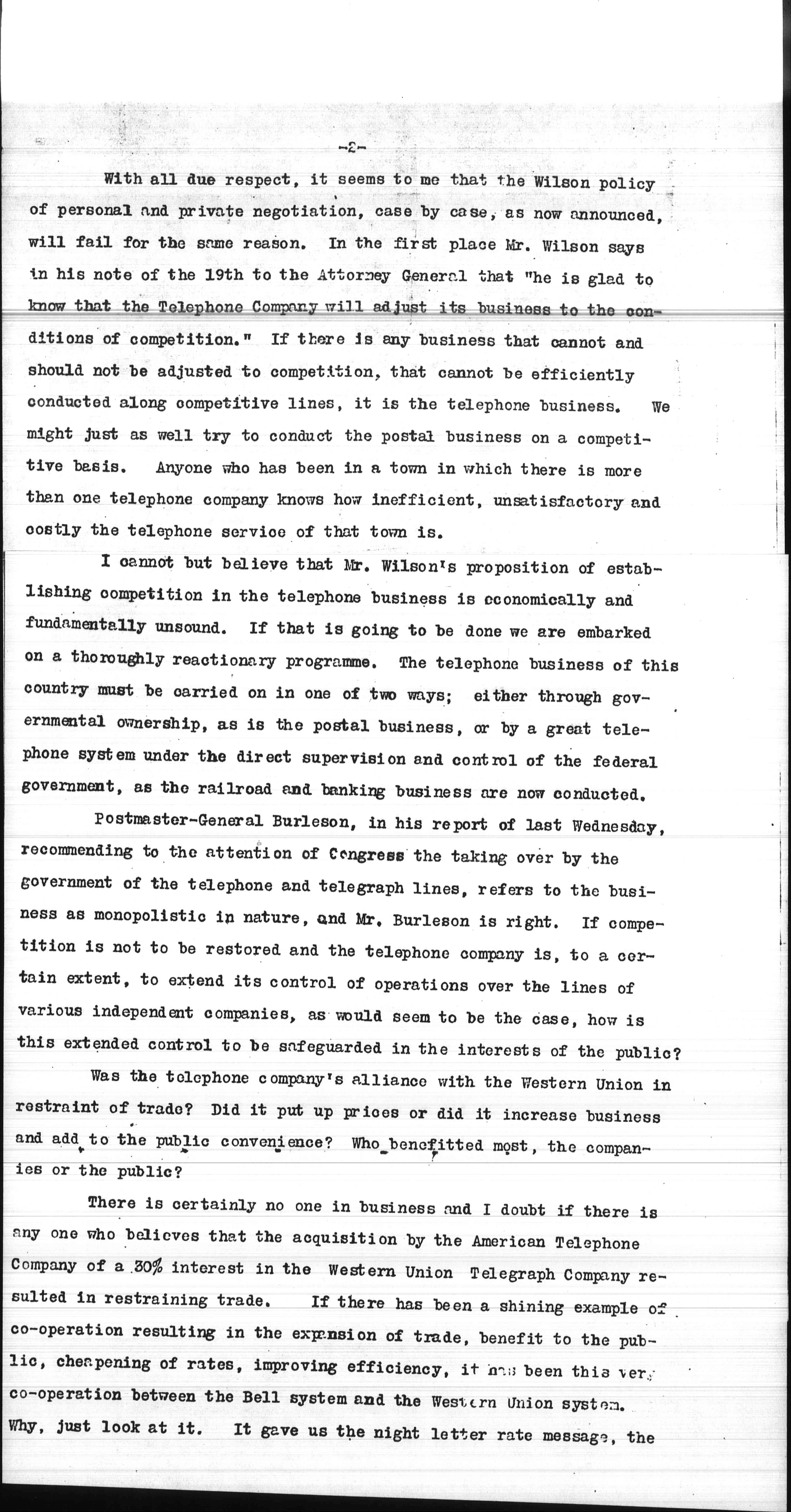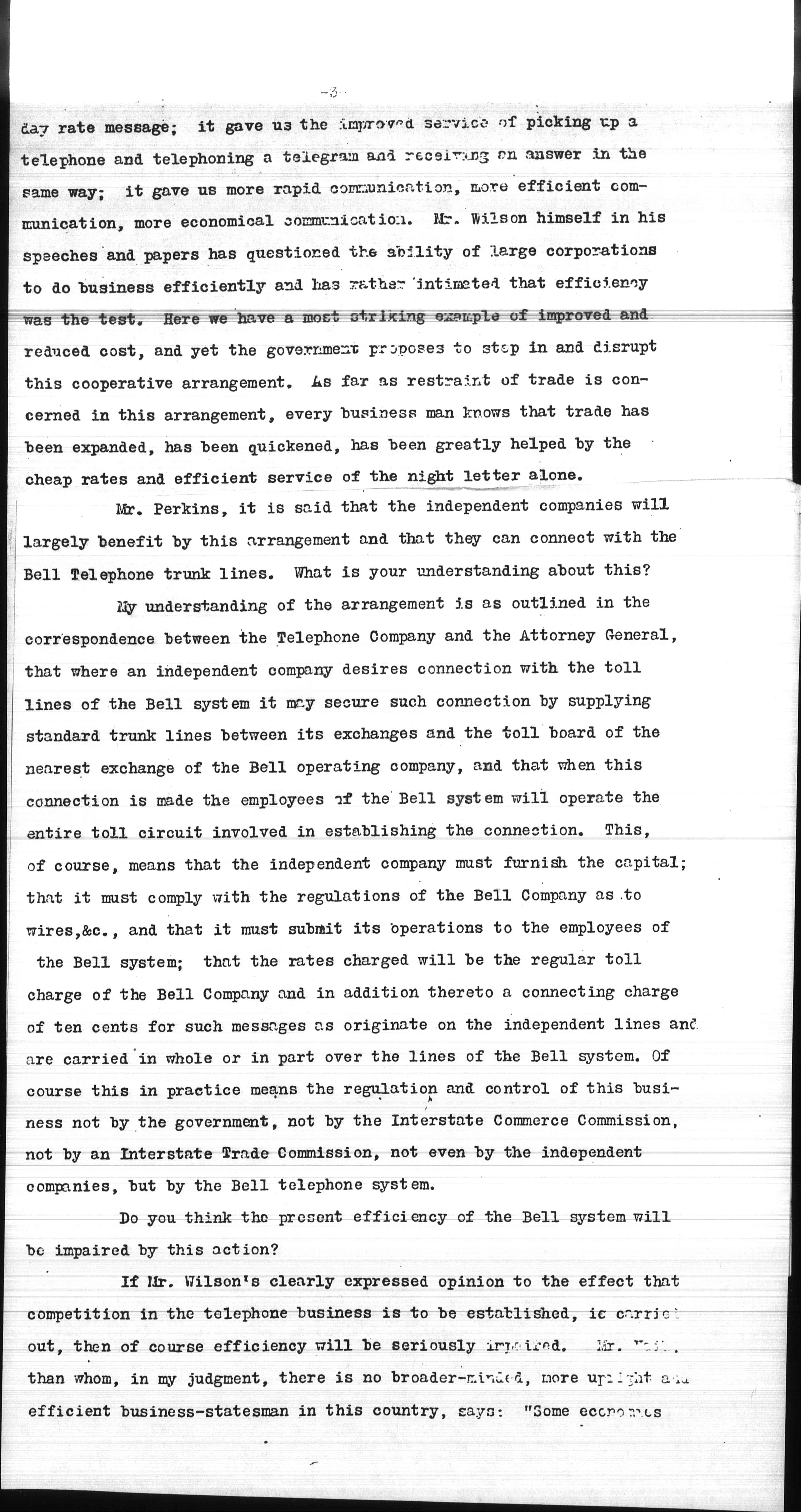There is certainly no one in business and I doubt if there is [anyone] who believes that the acquisition by the American Telephone Company of a 30% interest in the Western Union Telegraph Company resulted in restraining trade. If there has been a shining example of [cooperation] resulting in the expansion of trade, benefit to the public, cheapening of rates, improving efficiency, it has been this very [cooperation] between the Bell system and the Western Union system. Why, just look at it. It gave us the night letter rate message, the [page 3] day rate message; it gave us the improved service of picking up a telephone and telephoning a telegram and receiving an answer in the same way; it gave us more rapid communication, more efficient communication, more economical communication. Mr. Wilson himself in his speeches and papers has questioned the ability of large corporations to do business efficiently and has rather intimated that efficiency was the test. Here we have a most striking example of improved and reduced cost, and yet the government proposes to step in and disrupt this cooperative arrangement. As far as restraint of trade is concerned in this arrangement, every business man knows that trade has been expanded, has been quickened, has been greatly helped by the cheap rates and efficient service of the night letter alone.