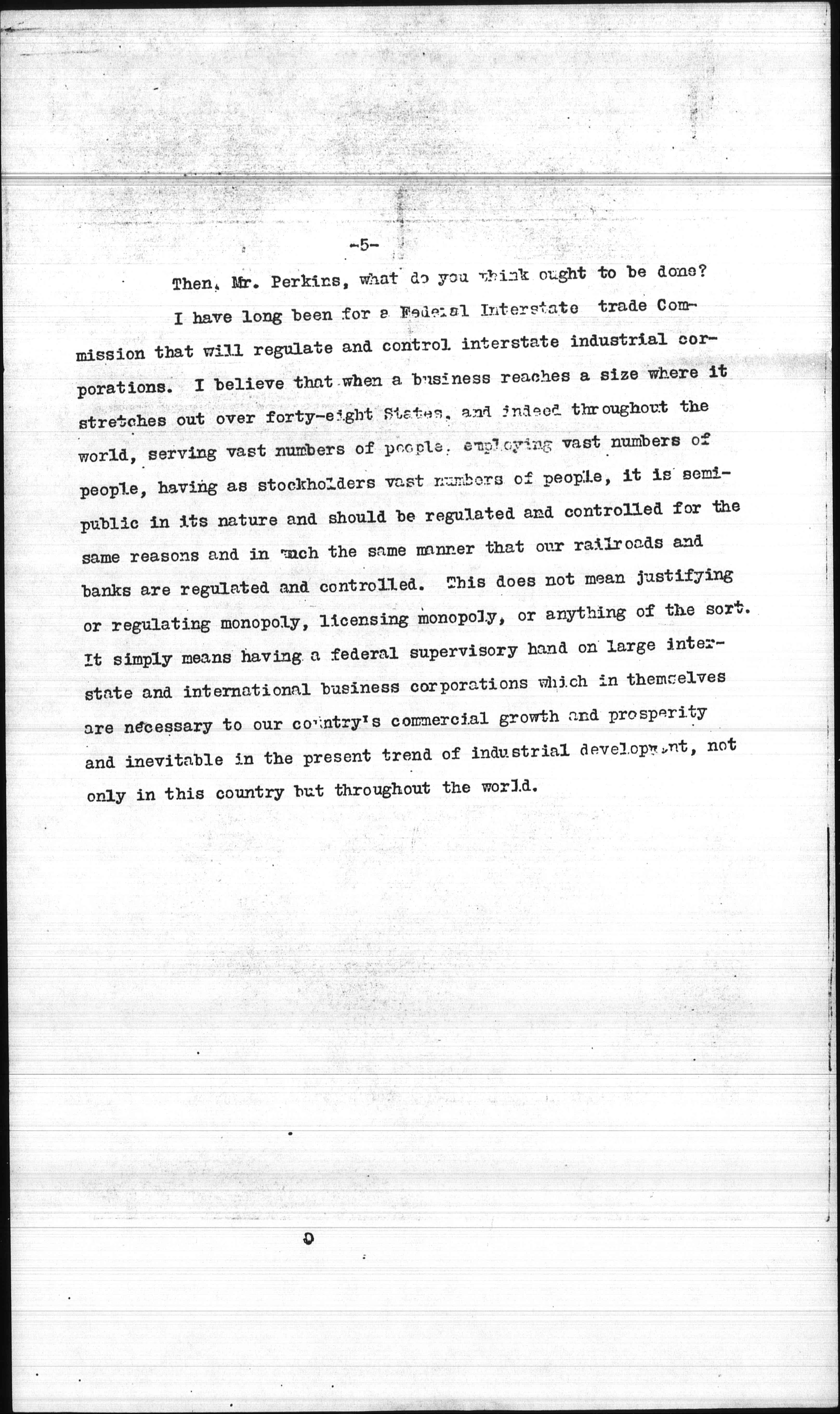 I have long been for a Federal Interstate trade Commission that will regulate and control interstate industrial corporations. I believe that when a business reaches a size where it stretches out over forty-eight States, and indeed throughout the world, serving vast numbers of people, employing vast numbers of people, having as stockholders vast numbers of people, it is semi-public in its nature and should be regulated and controlled for the same reasons and in much the same manner that our railroads and banks are regulated and controlled. This does not mean justifying or regulating monopoly, licensing monopoly, or anything of the sort. It simply means having a federal supervisory hand on large interstate and international business corporations which in themselves are necessary to our country's commercial growth and prosperity and inevitable in the present trend of industrial development, not only in this country but throughout the world.