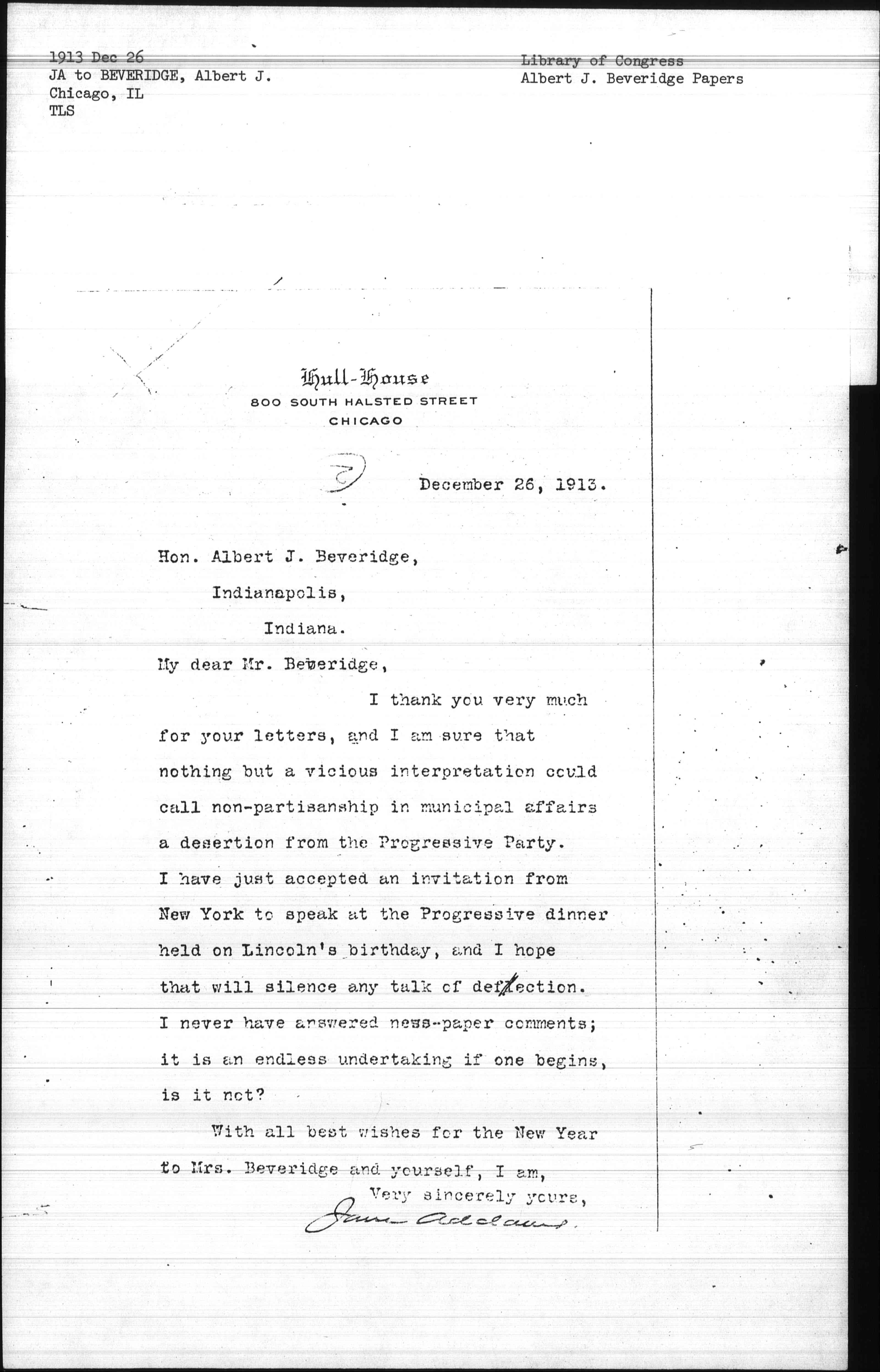 I thank you very much for your letters, and I am sure that nothing but a vicious interpretation could call non-partisanship in municipal affairs a desertion from the Progressive Party. I have just accepted an invitation from New York to speak at the Progressive dinner held on Lincoln's birthday, and I hope that will silence any talk of defection. I never have answered [newspaper] comments; it is an endless undertaking if one begins, is it not?