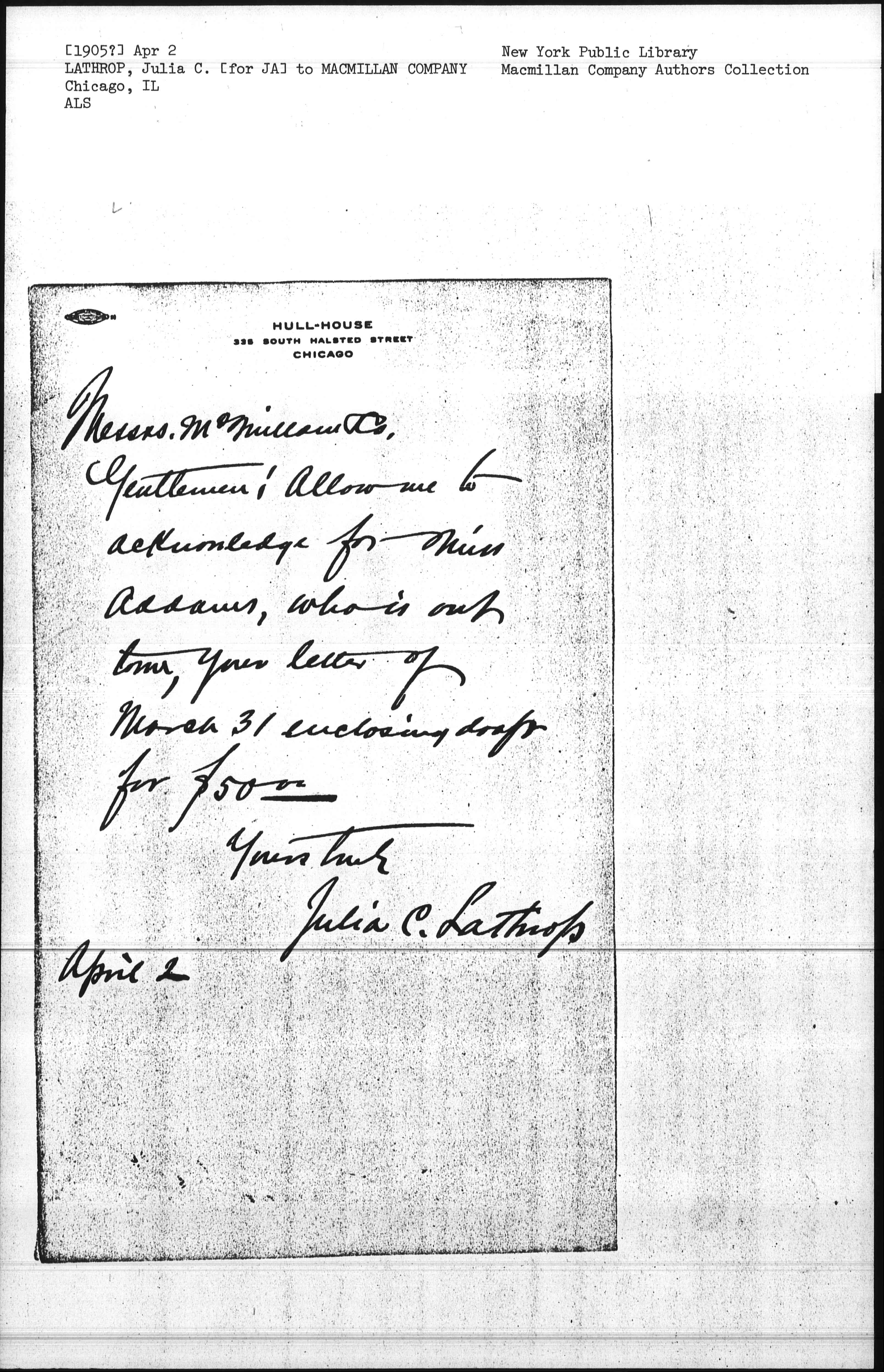 Gentlemen: Allow me to acknowledge for Miss Addams, who is out town, your letter of March 31 enclosing draft for $5000.