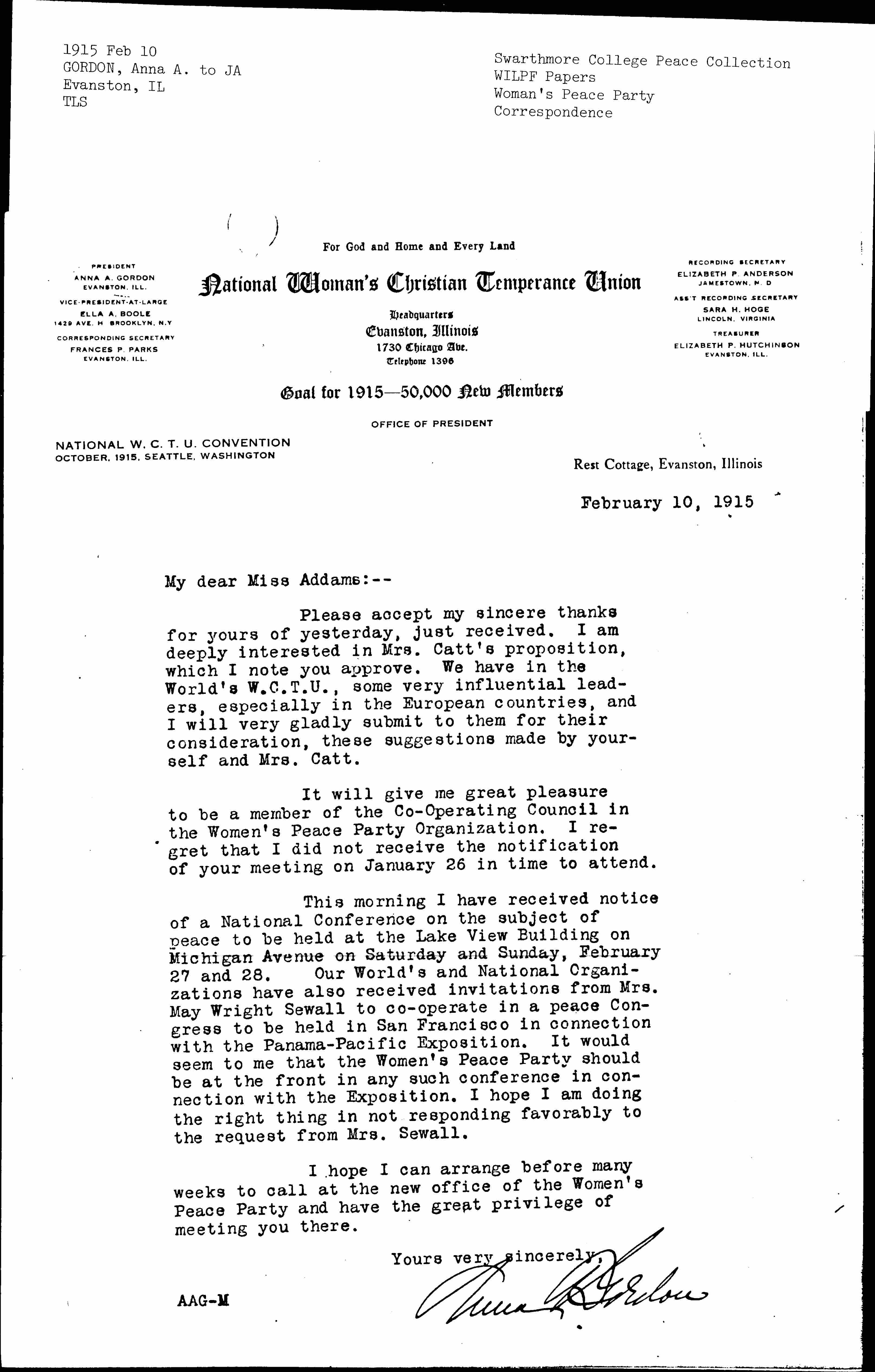 This morning I have received notice of a National Conference on the subject of peace to be held at the Lake View Building on Michigan Avenue on Saturday and Sunday, February 27 and 28. Our World's and National Organizations have also received invitations from Mrs. May Wright Sewall to [cooperate] in a peace Congress to be held in San Francisco in connection with the Panama-Pacific Exposition. It would seem to me that the [Woman's] Peace Party should be at the front in any such conference in connection with the Exposition. I hope I am doing the right thing in not responding favorably to the request from Mrs. Sewall.