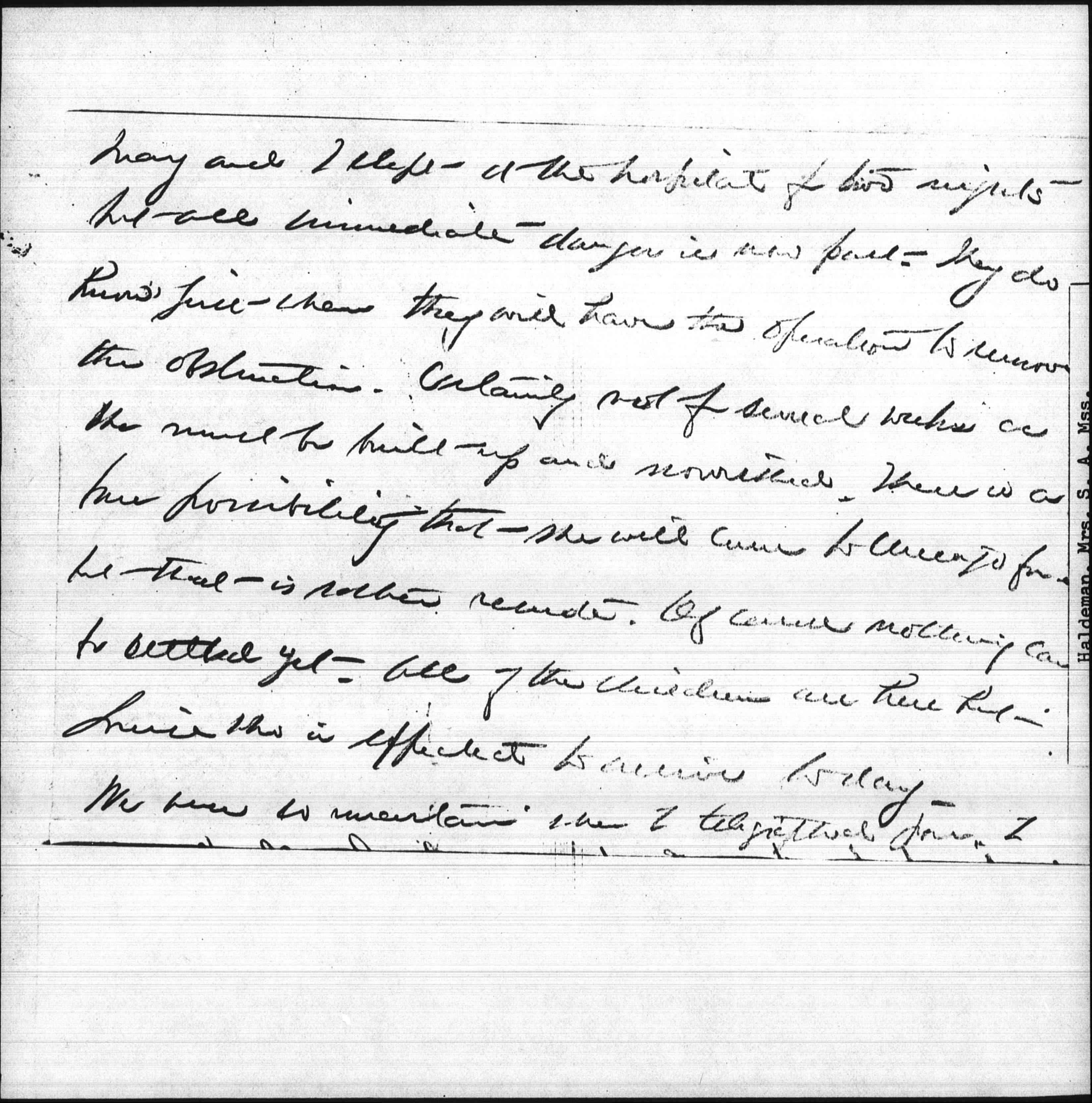 Mary and I slept at the hospital for two nights but all immediate danger is now past. They do know just when they will have the operation to remove the obstruction. Certainly not for several weeks as she must be built up and nourished. There is a fair possibility that she will come to Chicago for [it] but that is rather remote. Of course nothing can be settled yet. All of the children are here but Louise who is expected to arrive today.