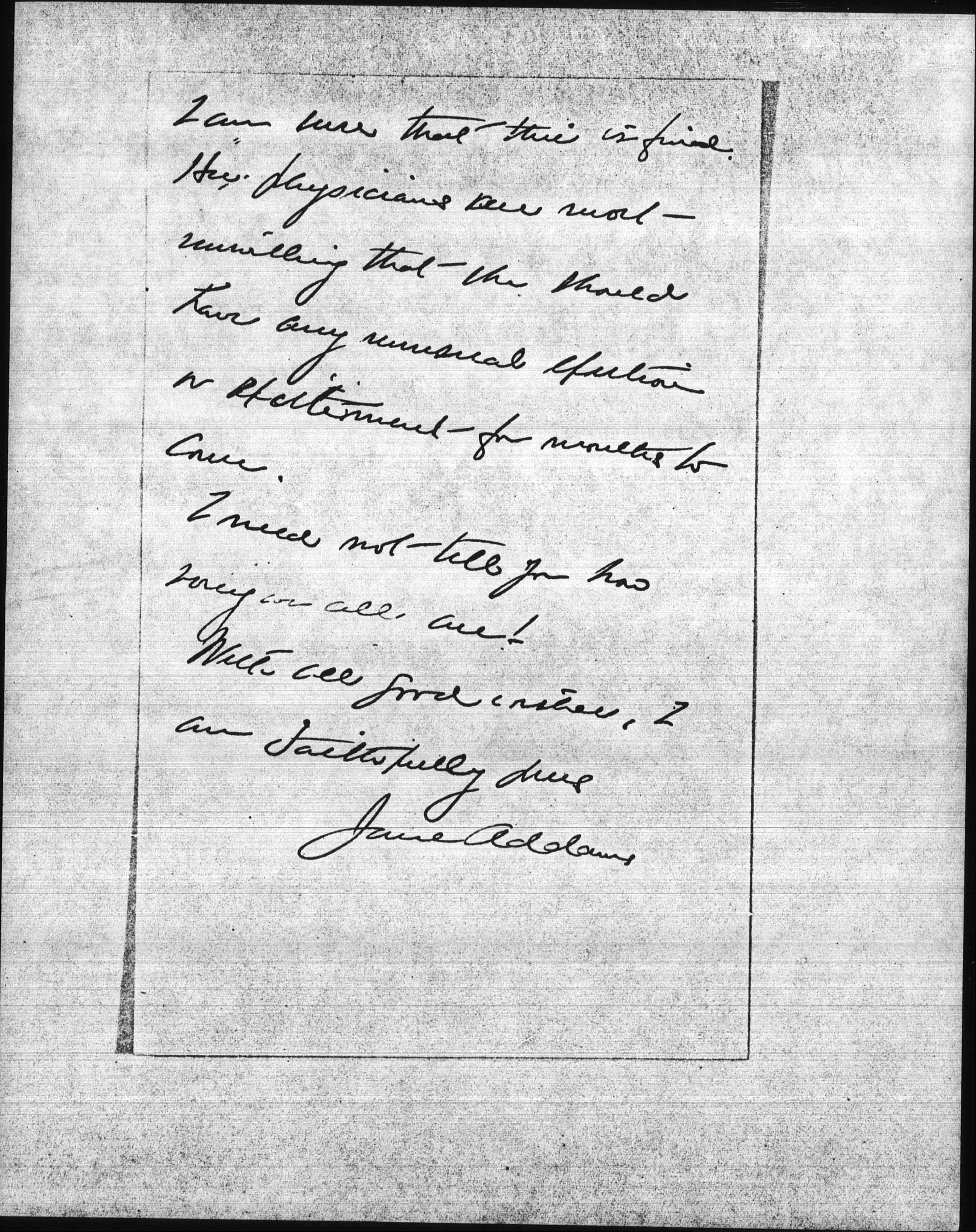 I am sure that this is final. Her physicians are not unwilling that she should have any unusual exertion or excitement for months to come.