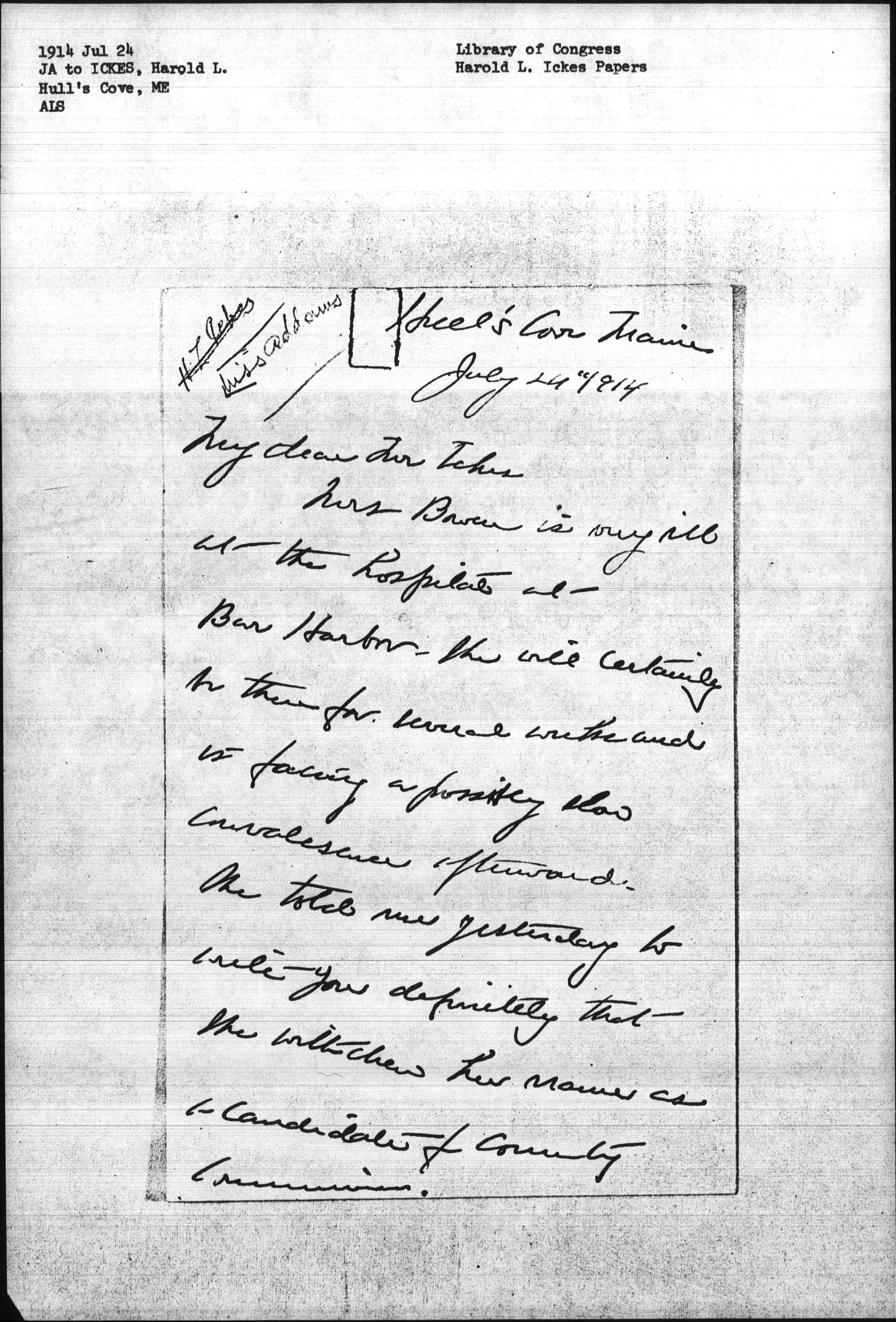 Mrs Bowen is very ill at the hospitals at Bar Harbor. She will certainly be there for several weeks and is facing a possibly slow convalescence afterward. She told me yesterday to write you definitely that she withdrew her name as a candidate for county commissioner. [page 2]