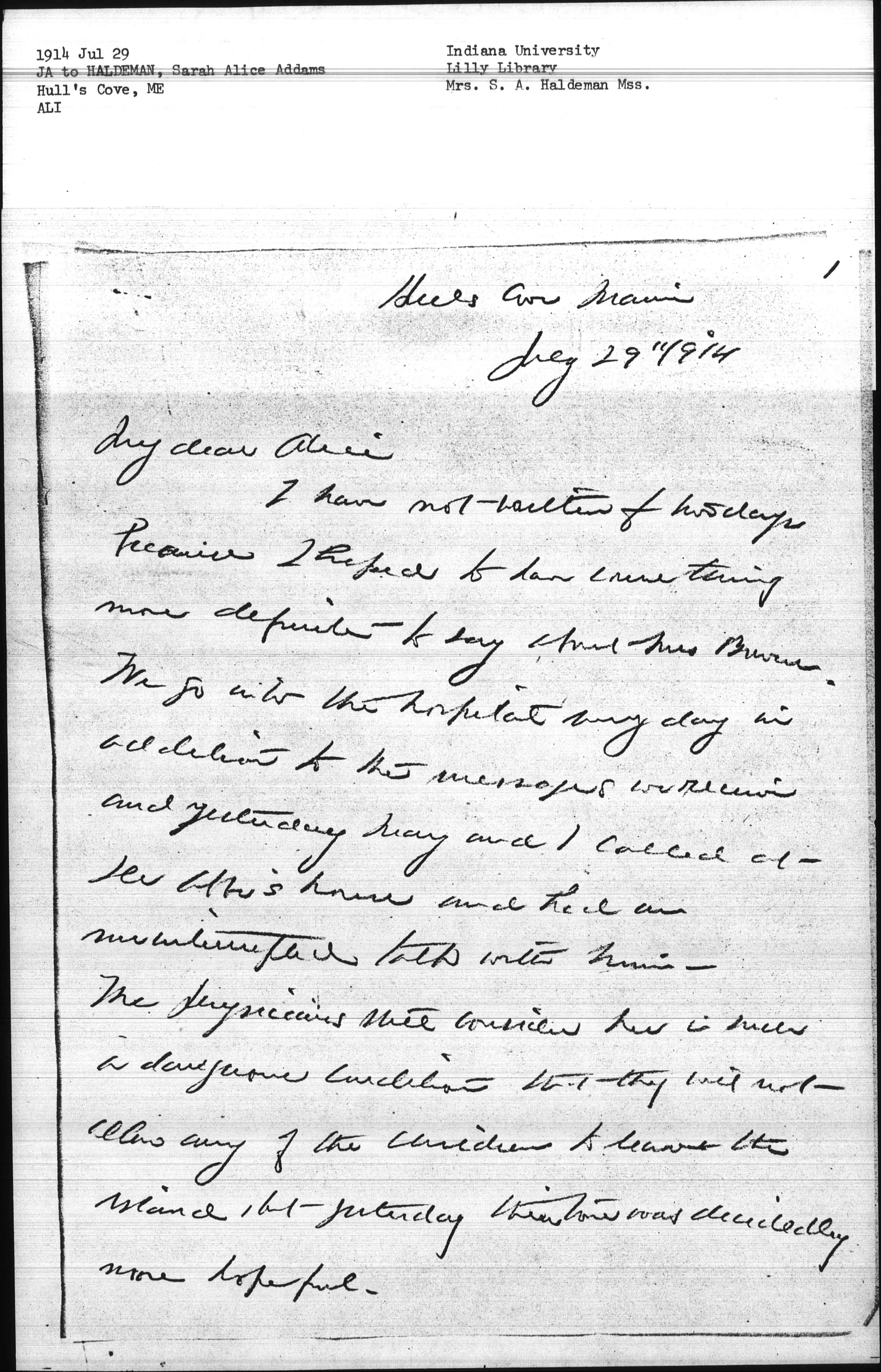 I have not written for two days because I hoped to have something more definite to say about Mrs Bowen. We go into the hospital every day in addition to the messages we receive and yesterday Mary and I called at Dr Abbe's house and had an uninterrupted talk with him. The physicians still consider her in such a dangerous condition that they will not allow any of the children to leave the island, but yesterday their tone was decidedly more hopeful. [page 2]