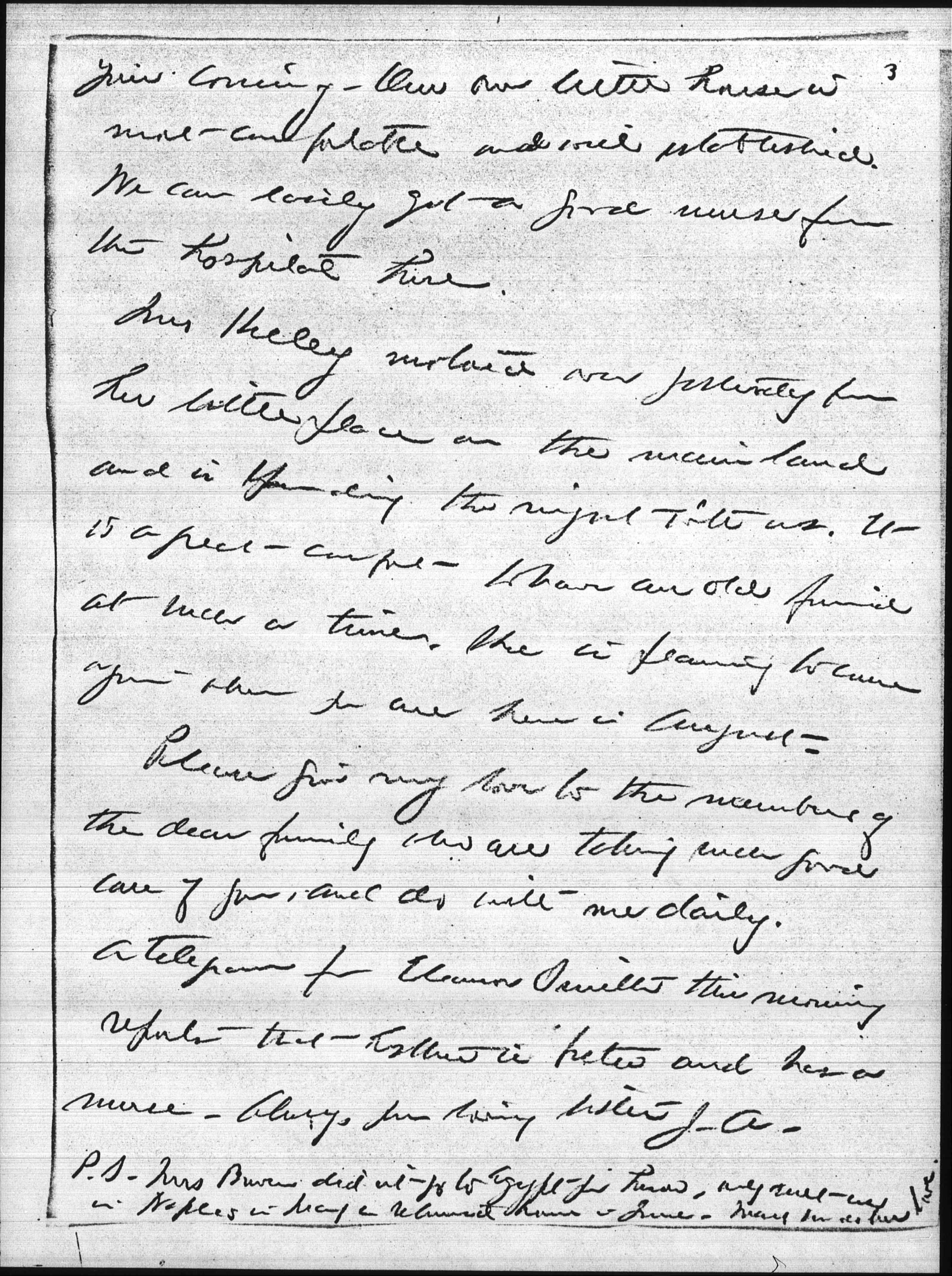 We have been fearfully anxious and cannot know for some time that the dear patient is "out of the woods" but I do hope that nothing; will prevent [page 3] your coming. Our own little house is more comfortable and well established. We can easily get a good nurse from the hospital here.