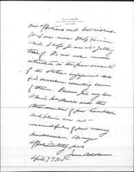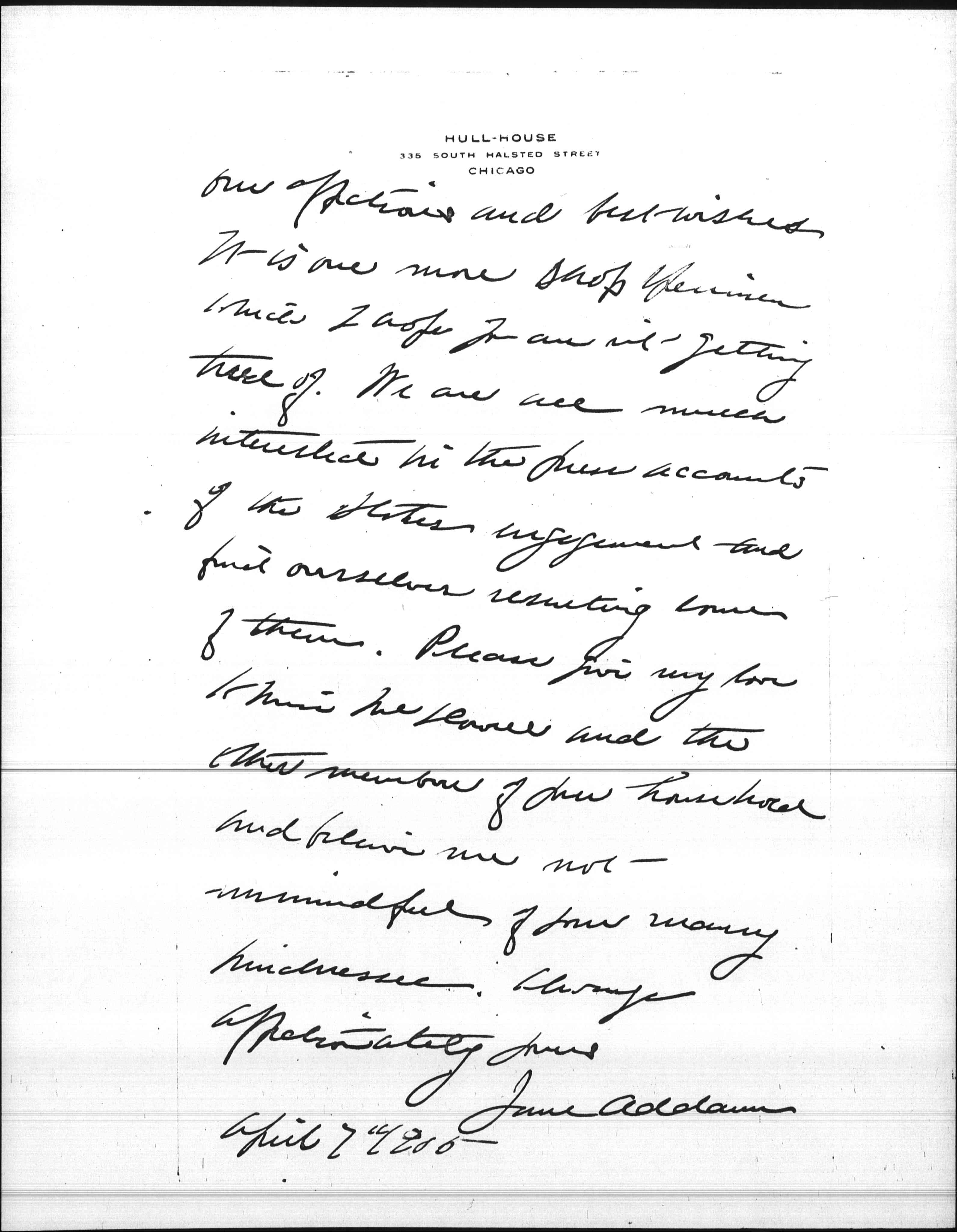 Mary Smith and I have [united on] one of Miss Starr's books which we are sending with [page 2] our affections and best wishes. It is one more shop specimin which I hope you aren't getting tired of. We are all much interested in the press accounts of the Stokes engagement and find ourselves [resenting] some of them. Please give my love to Miss McDowell and the other members of your household and believe me not unmindful of your many kindnesses. Always affectionately yours