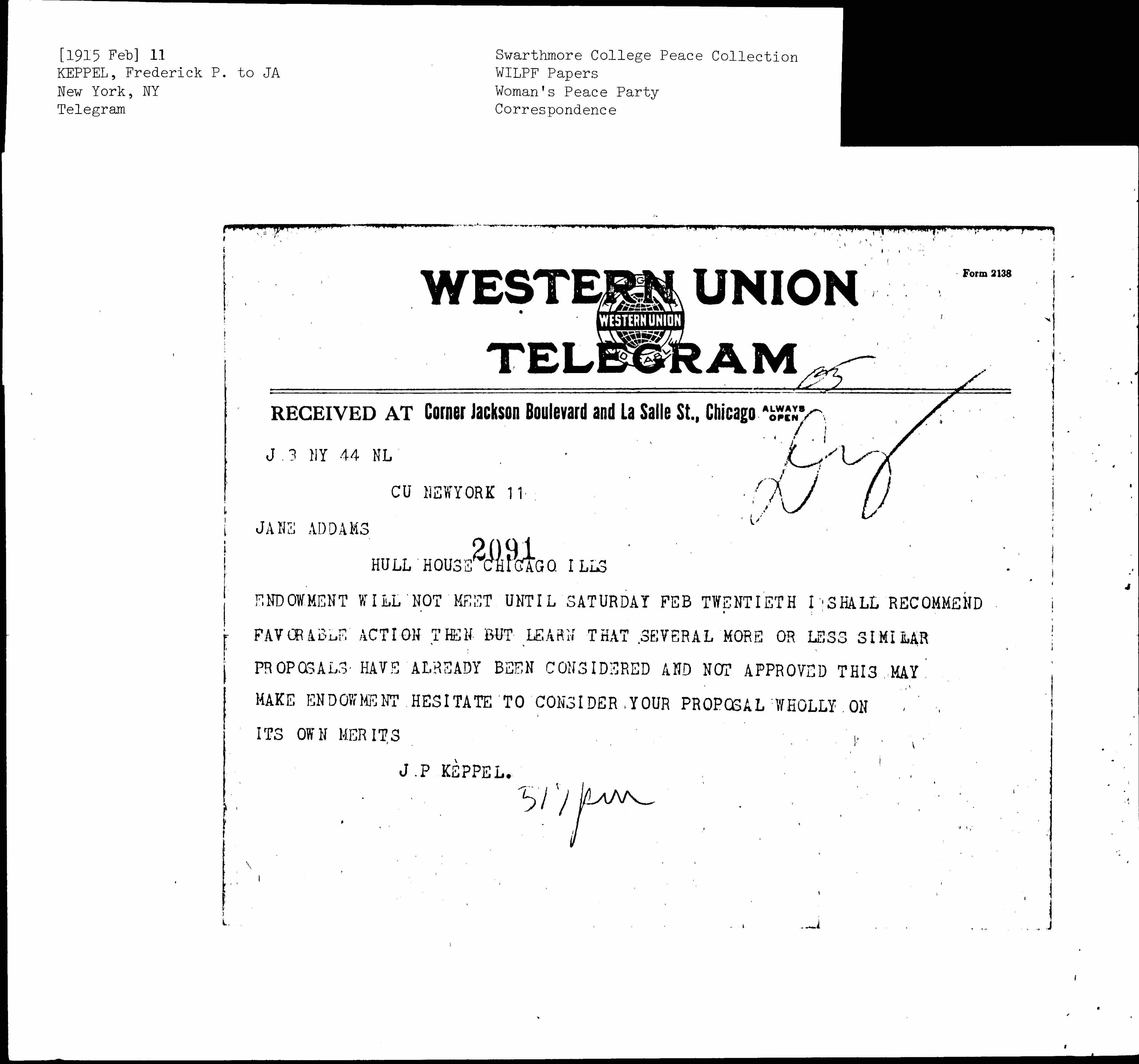 RECEIVED AT Corner Jackson Boulevard and La Salle St. Chicago