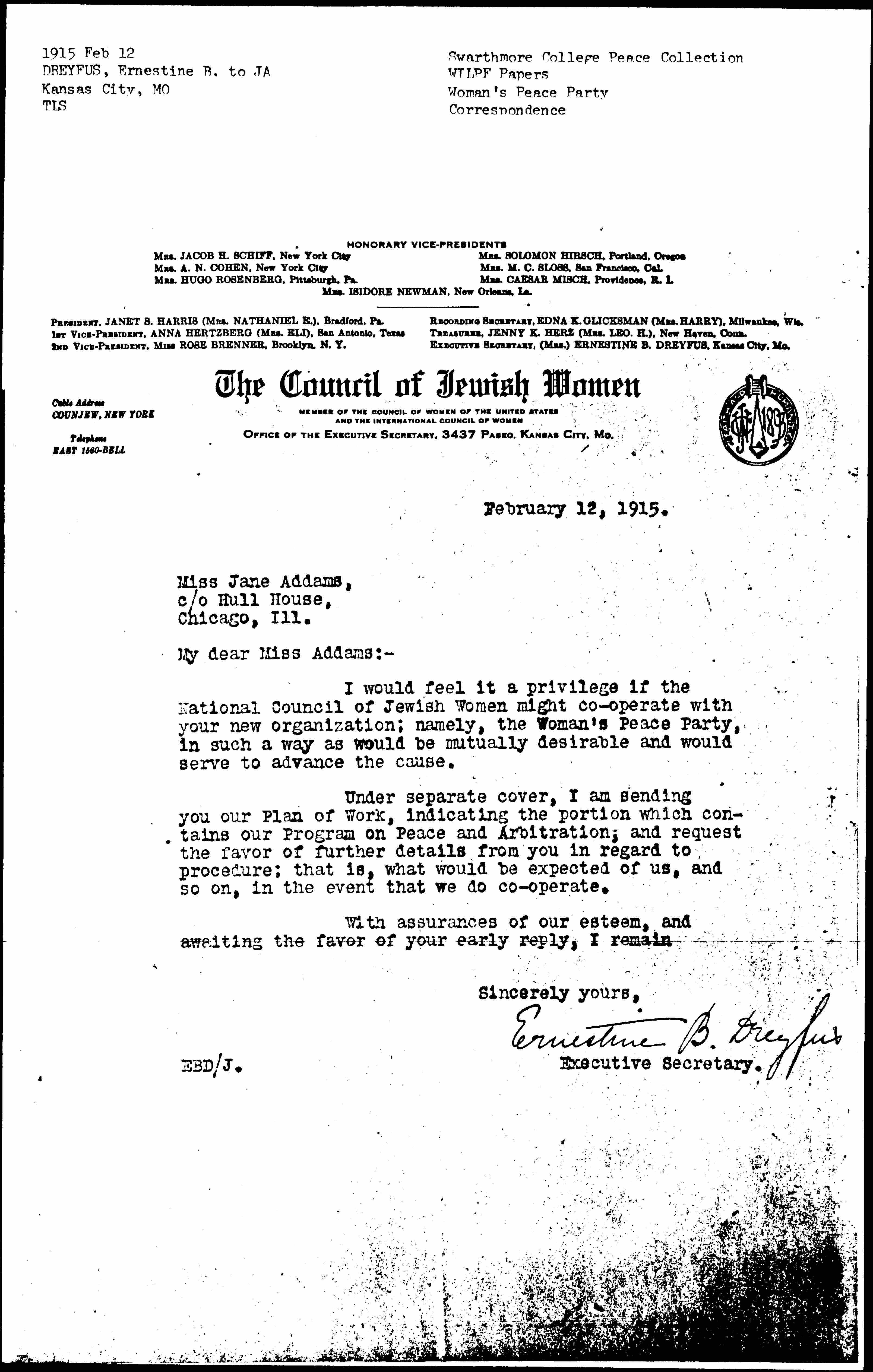 I would feel it a privilege if the National Council of Jewish Women might [cooperate] with your new organization; namely, the Woman's Peace Party, in such a way as would be mutually desirable and would serve to advance the cause.