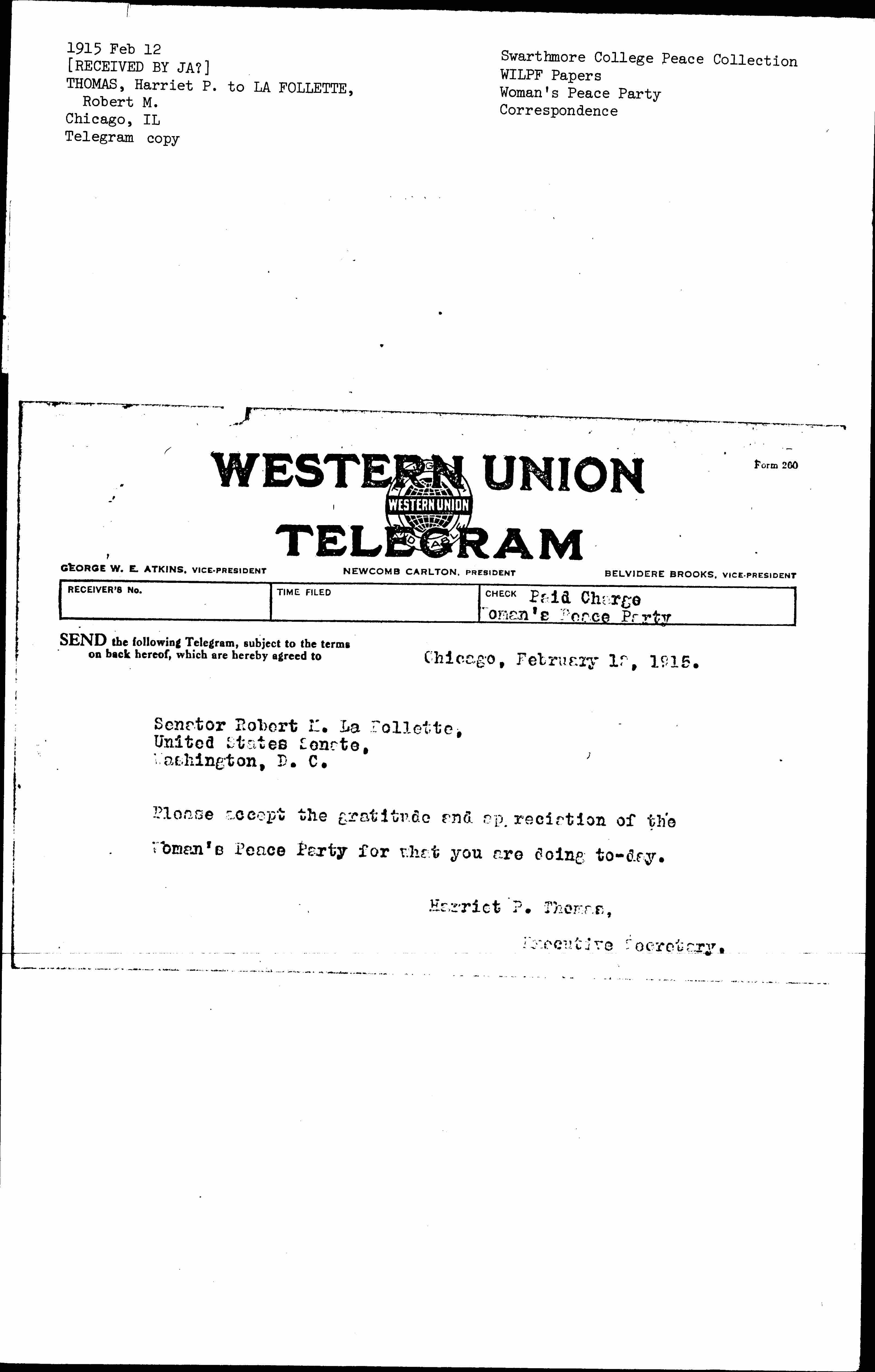 Please accept the gratitude and appreciation of the Woman's Peace Party for what you are doing [today].