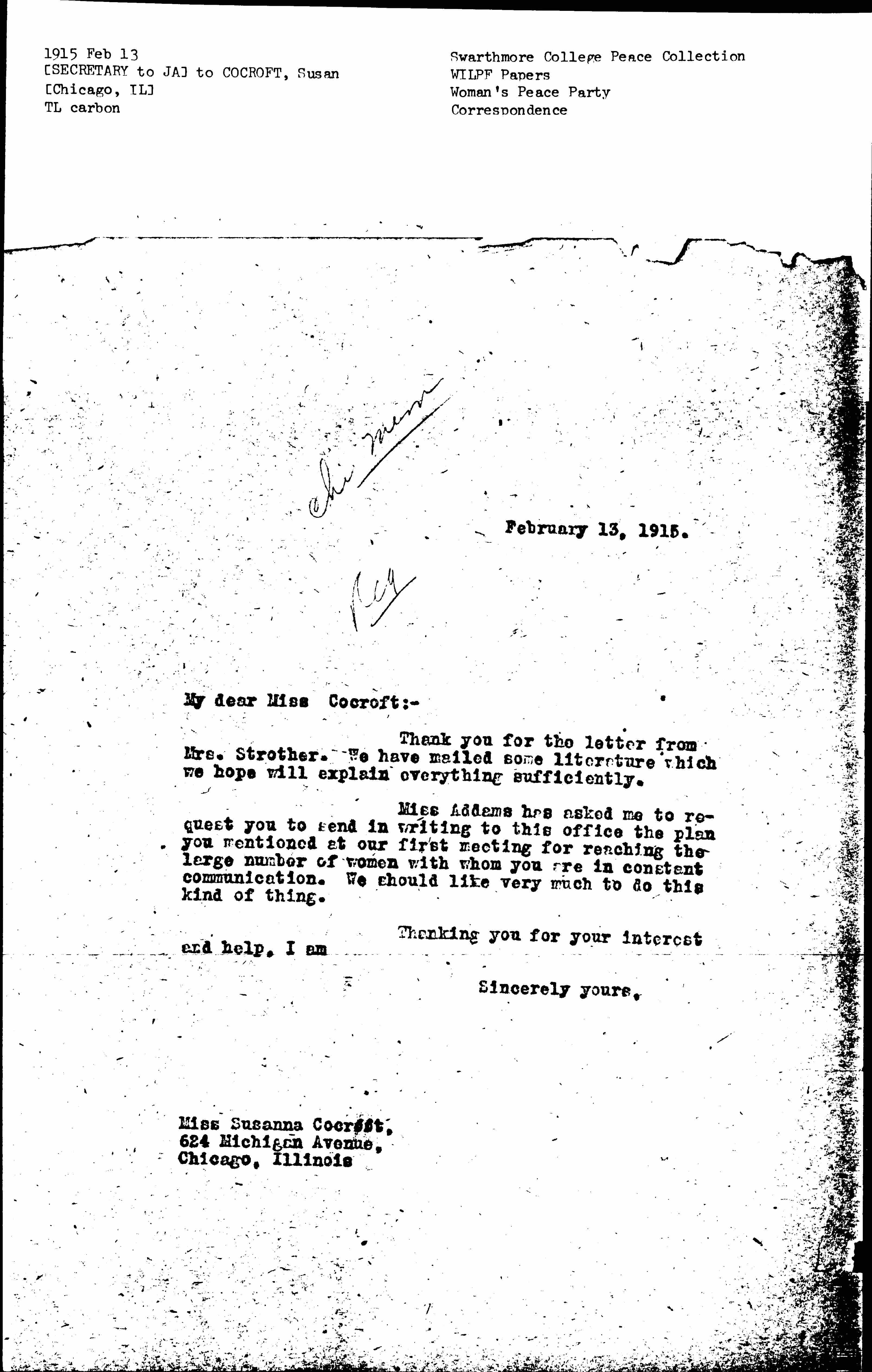 Miss Addams has asked me to request you to send in writing to this office the plan you mentioned at our first meeting for reaching the large number of women with whom you are in constant communication. We should like very much to do this kind of thing.