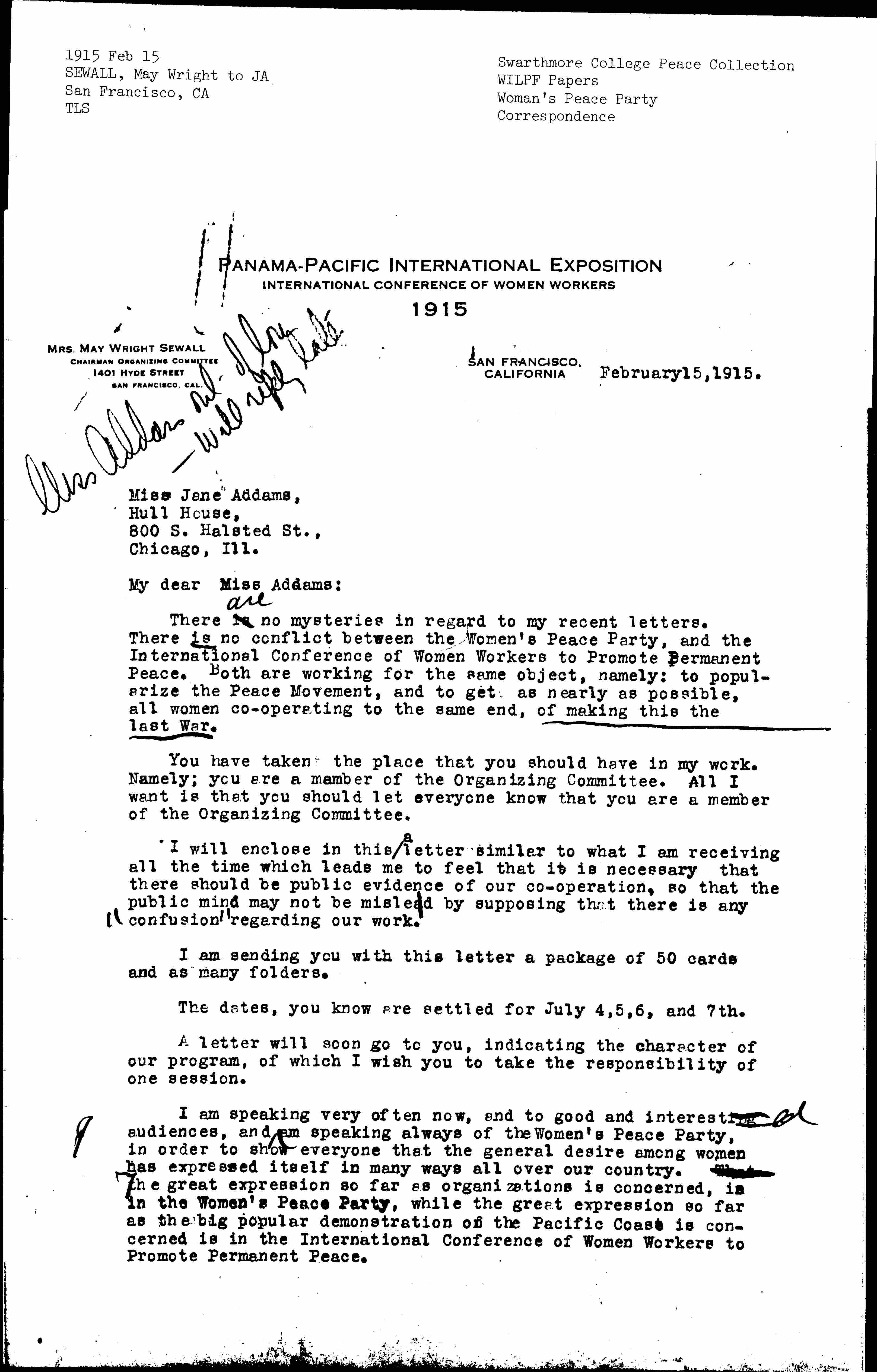 I am speaking very often now, and to good and interested audiences, and <I> am speaking always of the [Woman's] Peace Party, in order to show everyone that the general desire among women has expressed itself in many ways all over our country. [That] The great expression so far as organizations is concerned, is in the [Woman's] Peace Party, while the great expression so far as the big popular demonstration on the Pacific Coast is concerned is in the International Conference of Women Workers to Promote Permanent Peace. [page 2]