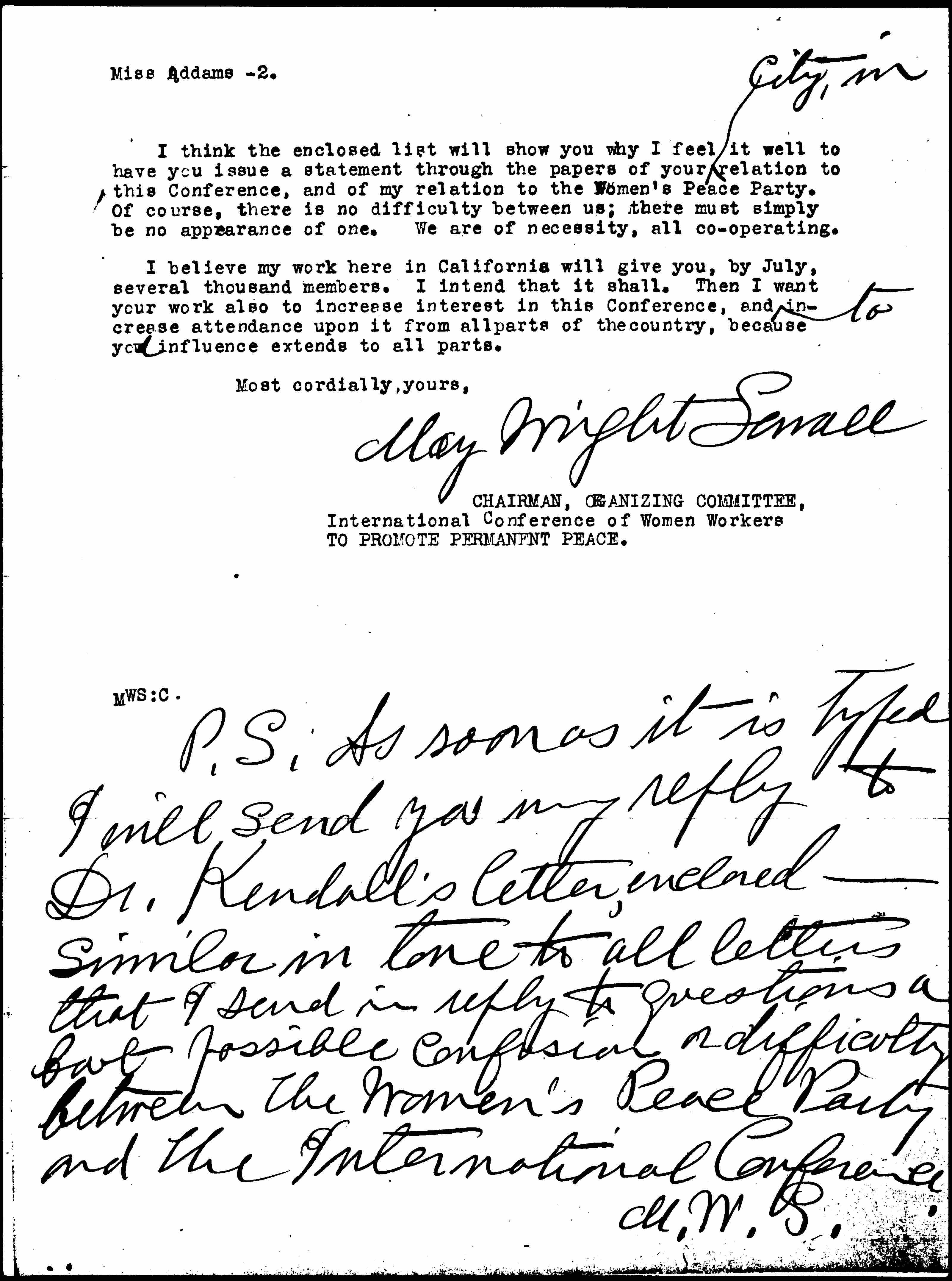 P.S. As soon as it is typed I will send you my reply to Dr. Kendall's letter, enclosed -- similar in tone to all letters that I send in reply to questions about possible confusion or difficulty between the [Woman's] Peace Party and the International Conference.