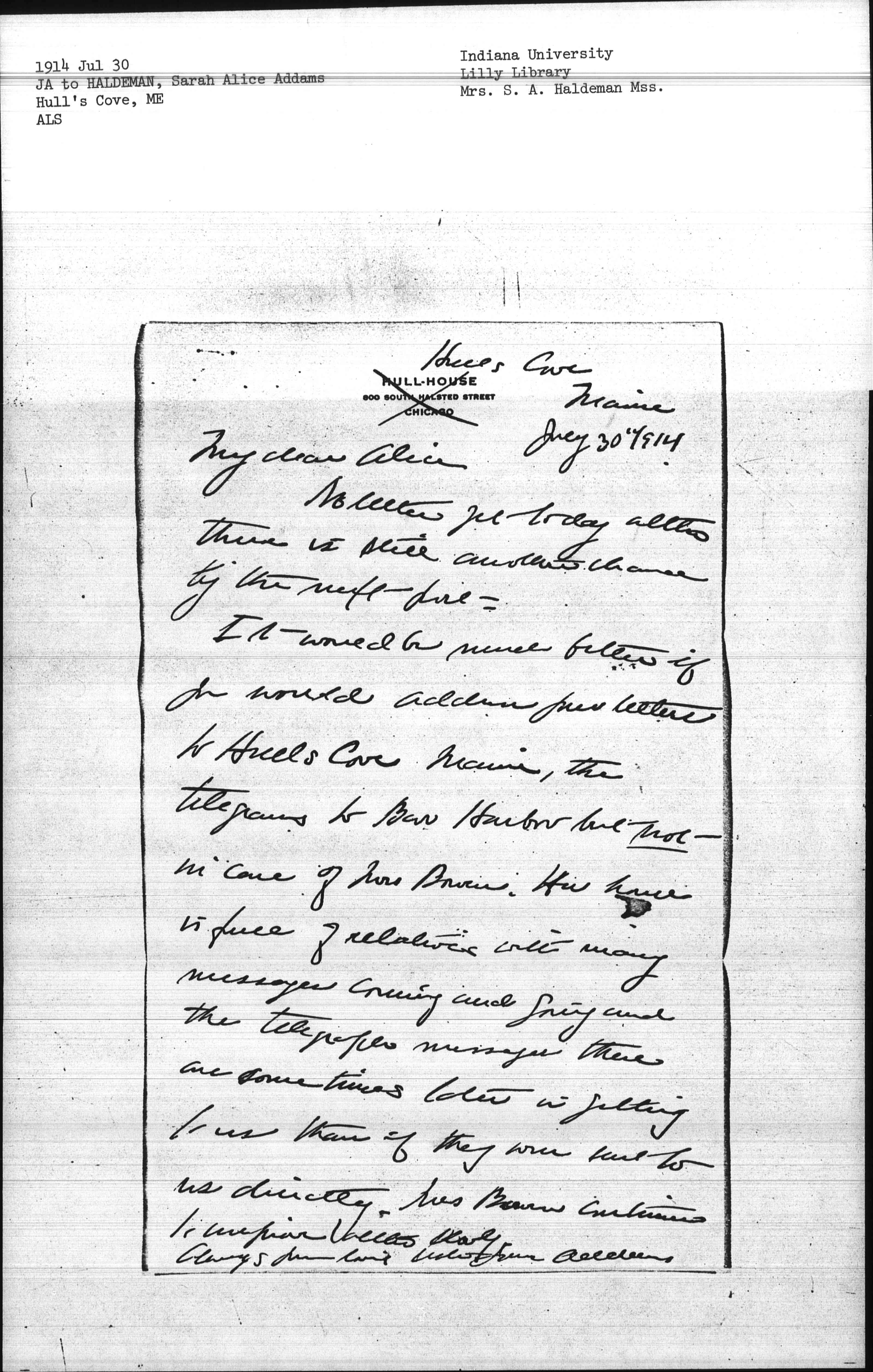 It would be much better if you would address your letters to Hulls Cove Maine, the telegrams to Bar Harbor but not in care of Mrs Bowen. Her house is full of relatives with many messages coming and going and the telegraph messages there are sometimes later in getting to us than if they were sent to us directly. Mrs Bowen continues to improve [although] slowly.