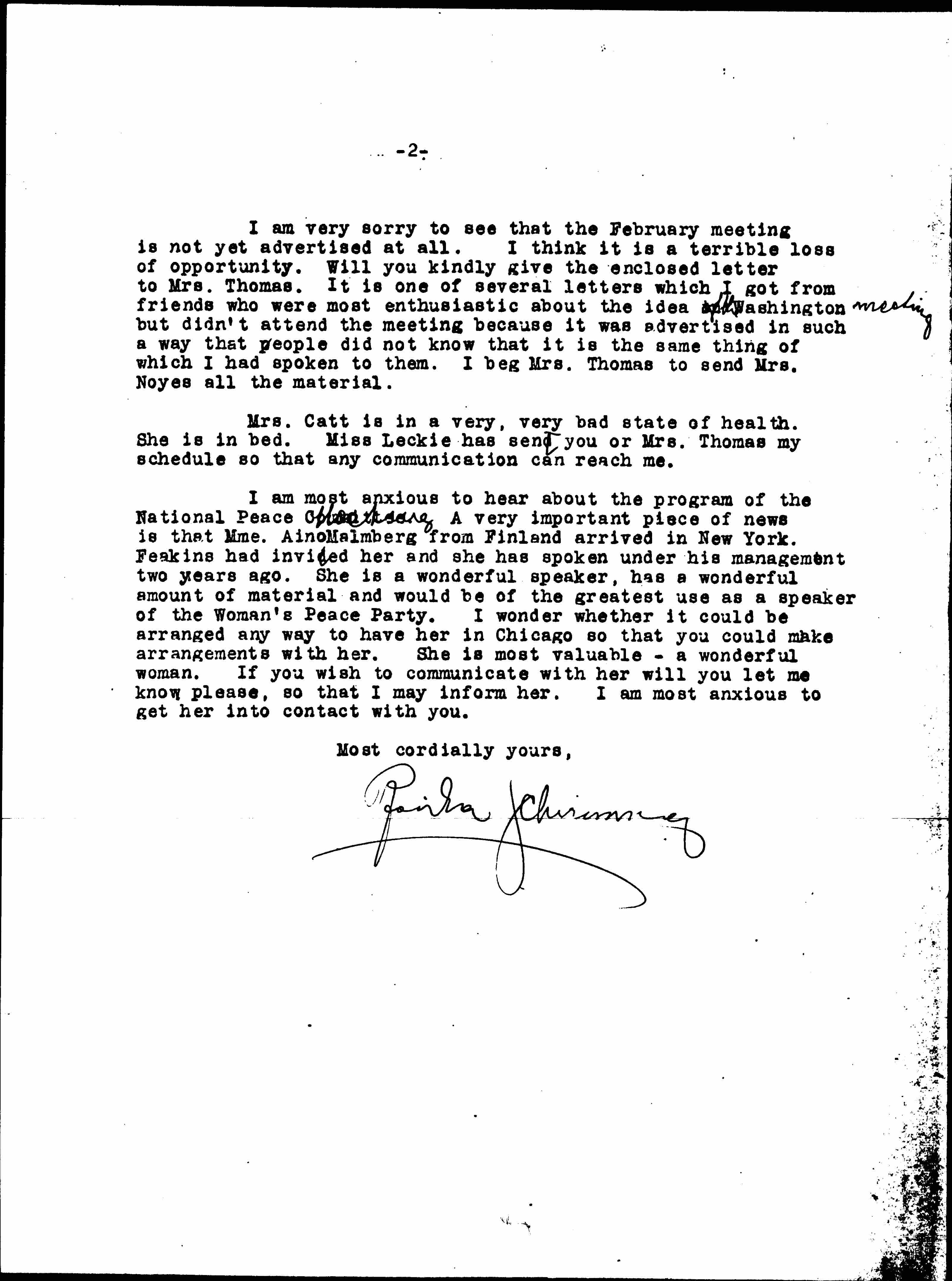 I am most anxious to hear about the program of the National Peace Meeting. A very important piece of news is that Mme. Aino Malmberg from Finland arrived in New York. Feakins had invited her and she has spoken under his management two years ago. She is a wonderful speaker, has a wonderful amount of material and would be of the greatest use as a speaker of the Woman's Peace Party. I wonder whether it could be arranged any way to have her in Chicago so that you could make arrangements with her. She is most valuable -- a wonderful woman. If you wish to communicate with her will you let me know please, so that I may inform her. I am most anxious to get her into contact with you.
