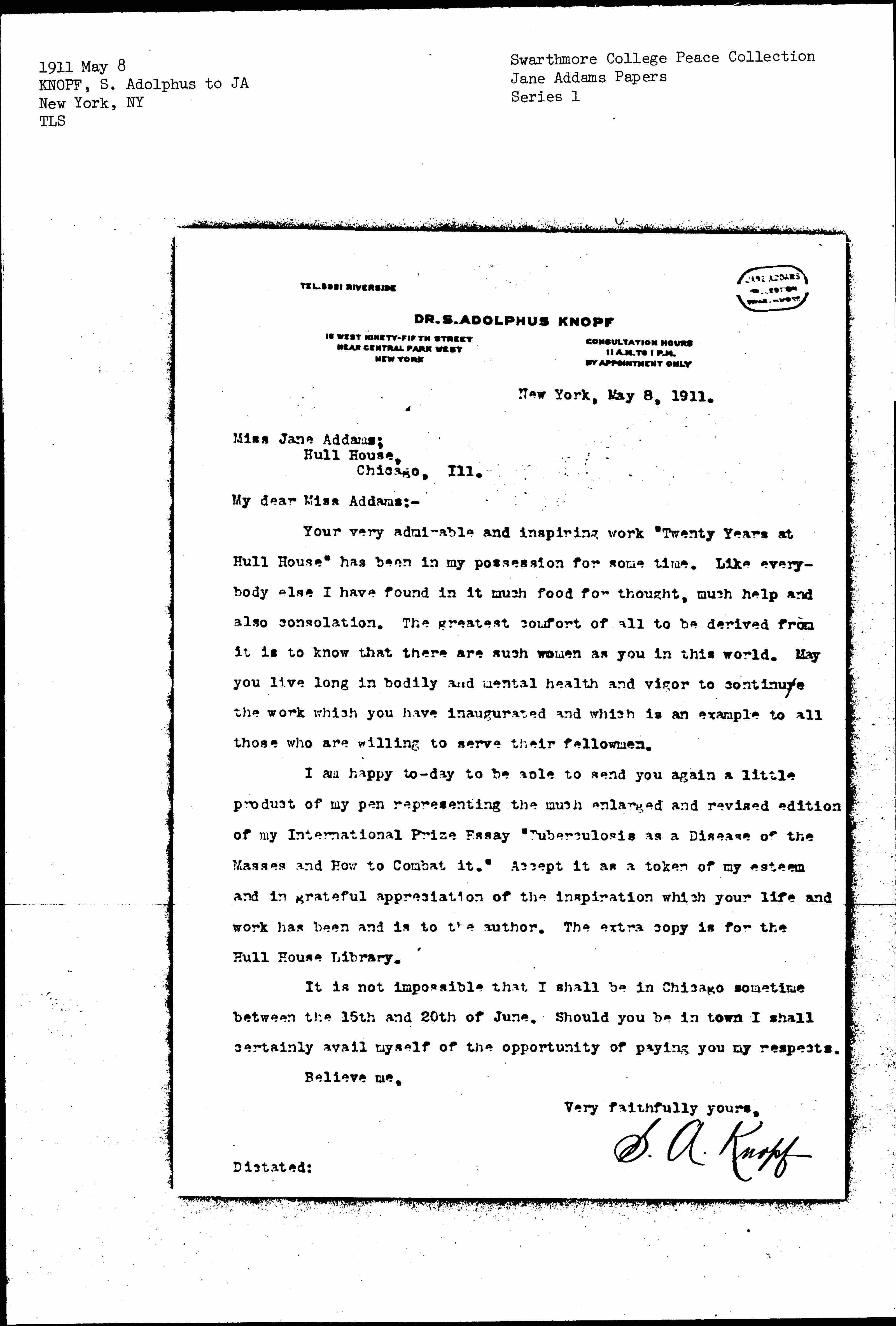 I am happy [today] to be able to send you again a little product of my pen representing the much enlarged and revised edition of my International Prize Essay "Tuberculosis as a Disease of the Masses and How to Combat it." Accept it as a token of my esteem and in grateful appreciation of the inspiration which your life and work has been and is to the author. The extra copy is for the Hull House Library.
