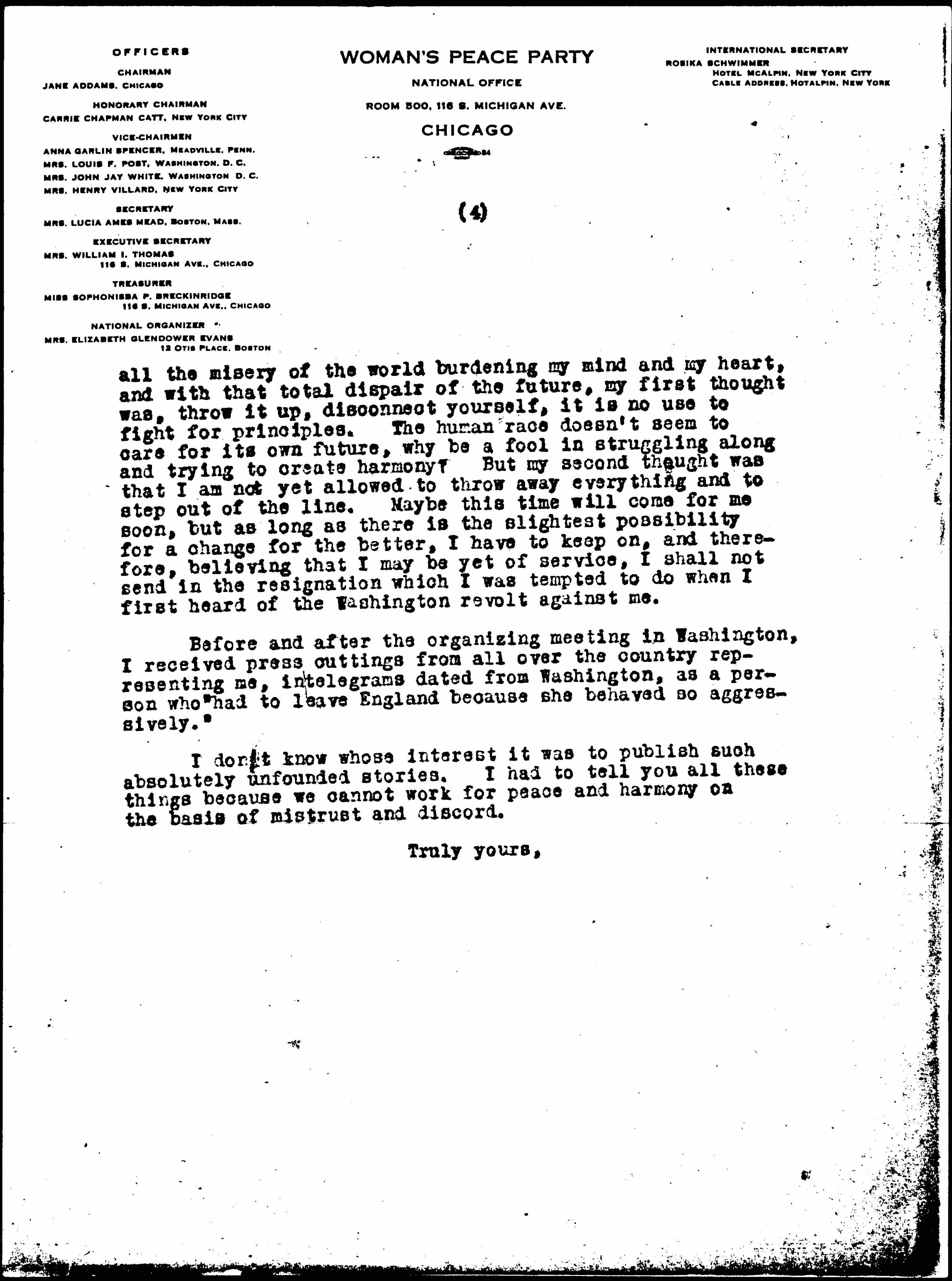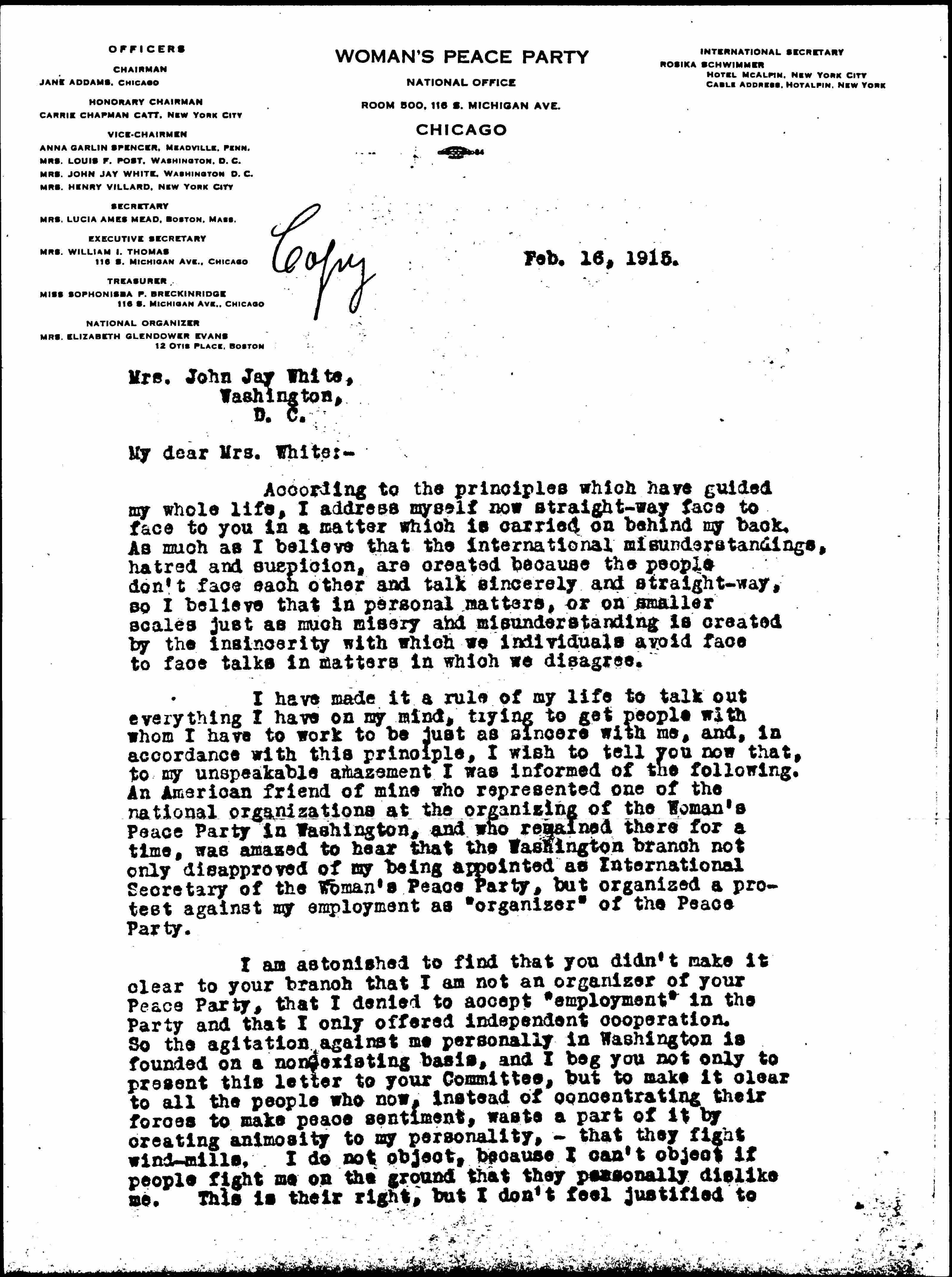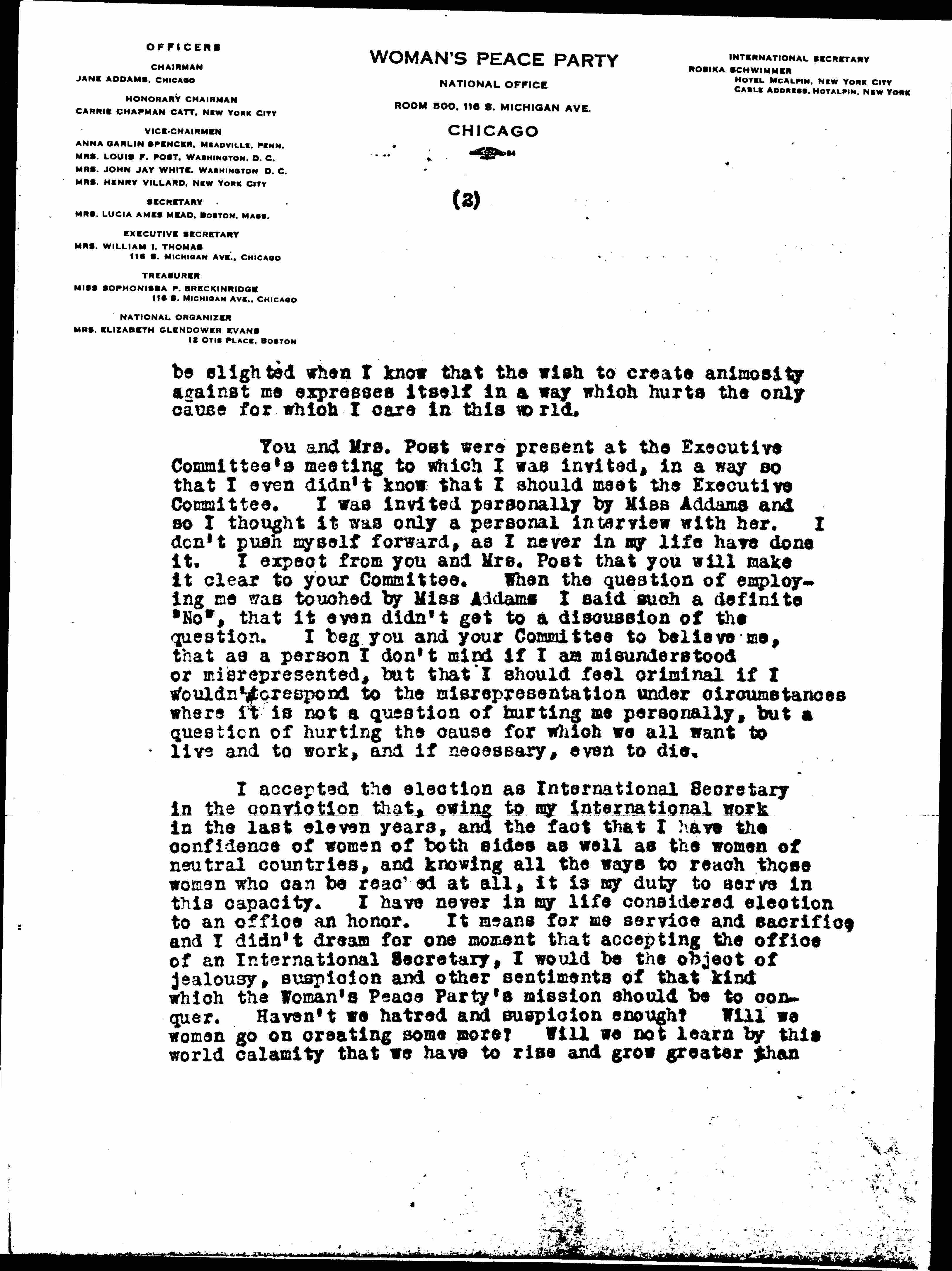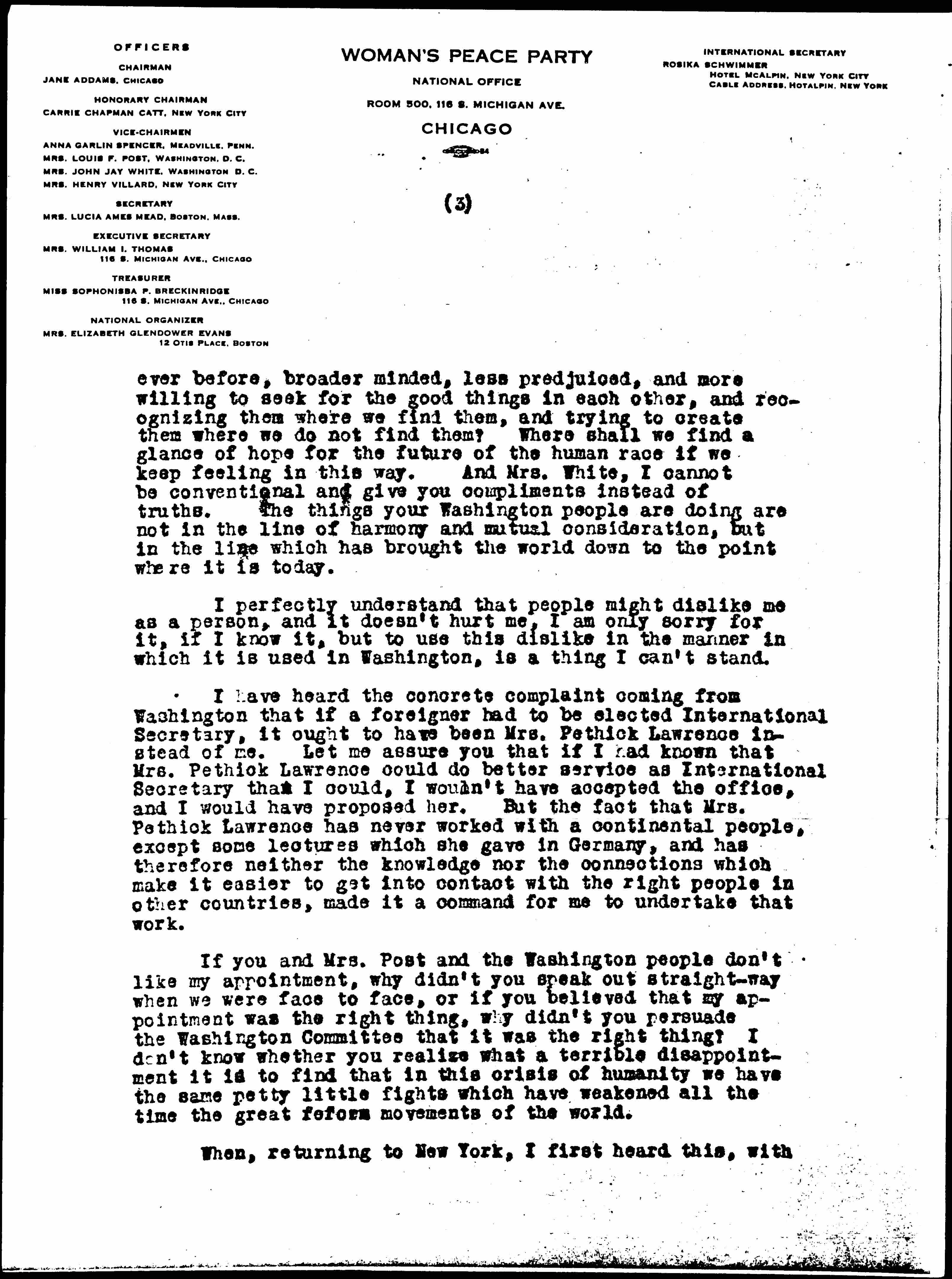 I accepted the election as International Secretary in the conviction that, owing to my international work in the last eleven years, and the fact that I have the confidence of women of both sides as well as the women of neutral countries, and knowing all the ways to reach those women who can be reached at all, it is my duty to serve in this capacity. I have never in my life considered election to an office an honor. It means for me service and sacrifice and I didn't dream for one moment that accepting the office of an International Secretary, I would be the object of jealousy, suspicion and other sentiments of that kind which the Woman's Peace Party's mission should be to conquer. Haven't we hatred and suspicion enough? Will we women go on creating some more? Will we not learn by this world calamity that we have to rise and grow greater than [page 3] ever before, broader minded, less [prejudiced], and more willing to seek for the good things in each other, and recognizing them where we find them, and trying to create them where we do not find them? Where shall we find a glance of hope for the future of the human race if we keep feeling in this way. And Mrs. White, I cannot be conventional and give you compliments instead of truths. The things your Washington people are doing are not in the line of harmony and mutual consideration, but in the line which has brought the world down to the point where it is today.