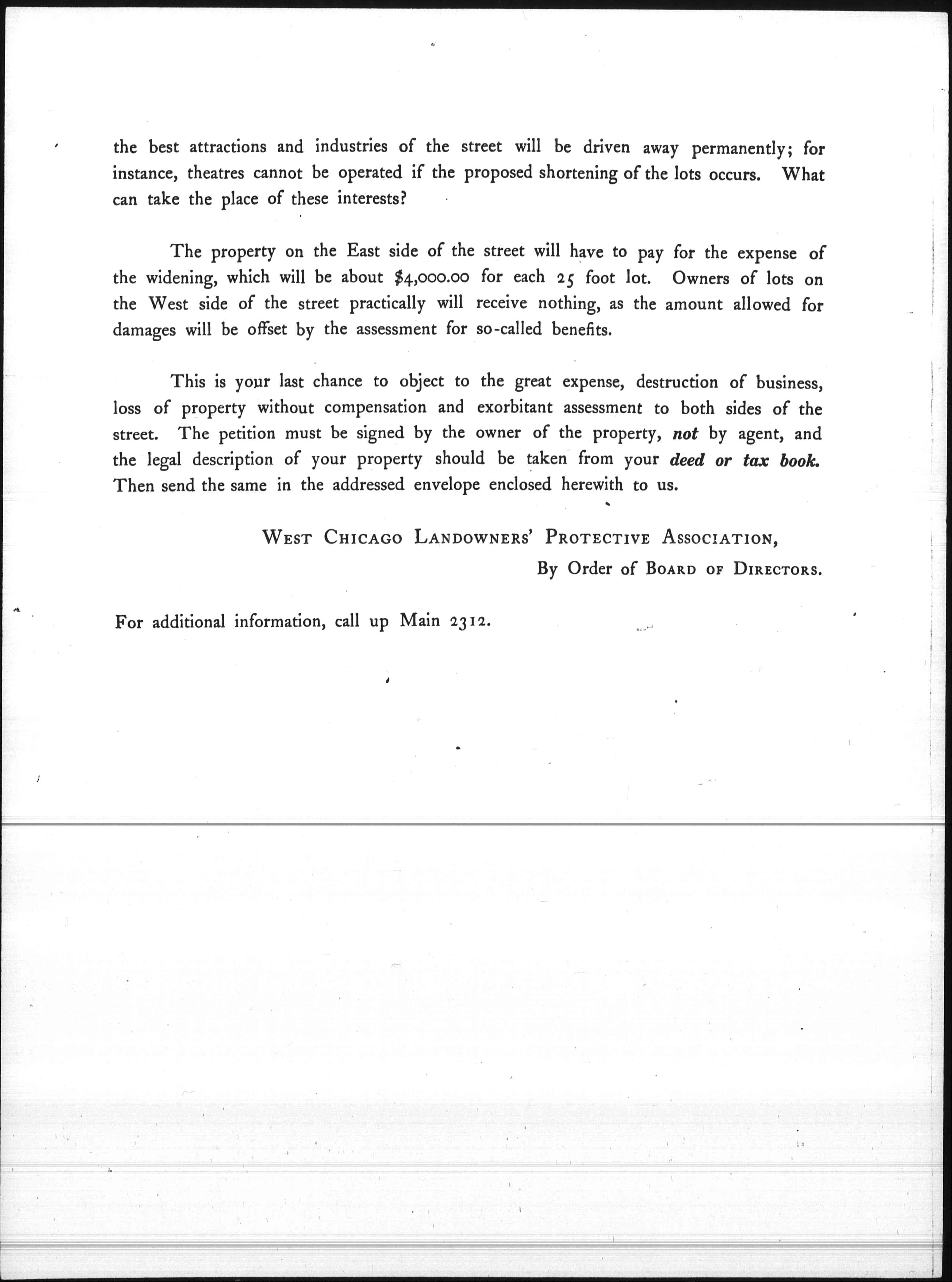 This scheme of widening Halsted Street is fathered by influential positions and contractors who have no real interest in Halsted Street and the association hears daily that these promoters are acting in the interests of an elevated railroad. That is why the parties interested are so anxious to widen Halsted Street. Can you afford to have this street ruined as Lake Street has been? A street encumbered by an elevated railroad and having its pavement demolished by heavy trucking does not improve. Besides, many of [page 2] the best attractions and industries of the street will be driven away permanently; for instance, theatres cannot be operated if the proposed shortening of the lots occurs. What can take the place of these interests?