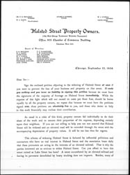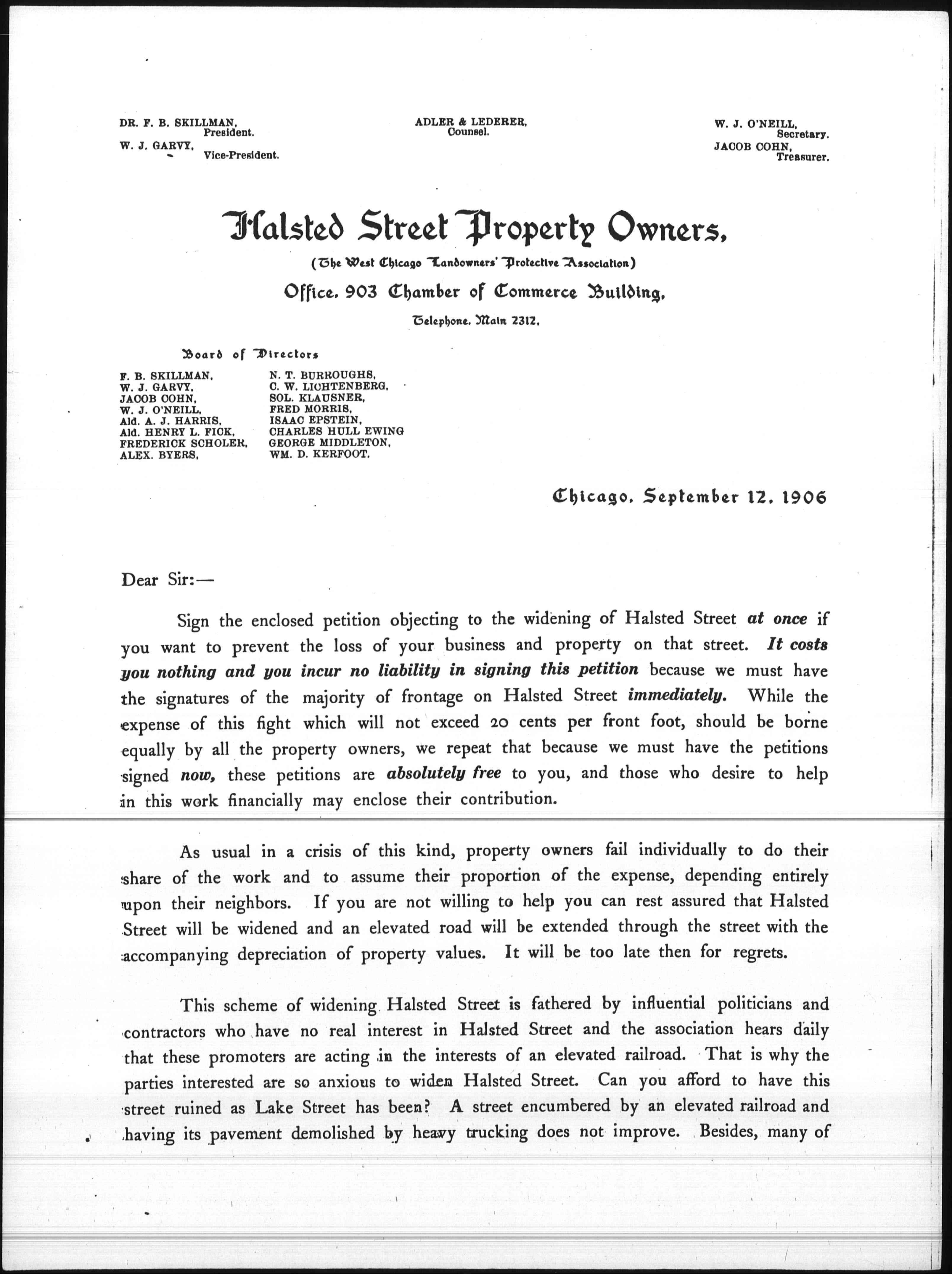 Sign the enclosed petition objecting to the widening of Halsted Street at once if you want to prevent the loss of your business and property on that street. It costs you nothing and you incur no liability in signing this petition because we must have the signatures of the majority of frontage on Halsted Street immediately. While the expense of this fight which will not exceed 20 cents per front foot, should be borne equally by all the property owners, we repeat that because we must have the petitions signed now, these petitions are absolutely free to you and those who desire to help in this work financially may enclose their contribution.