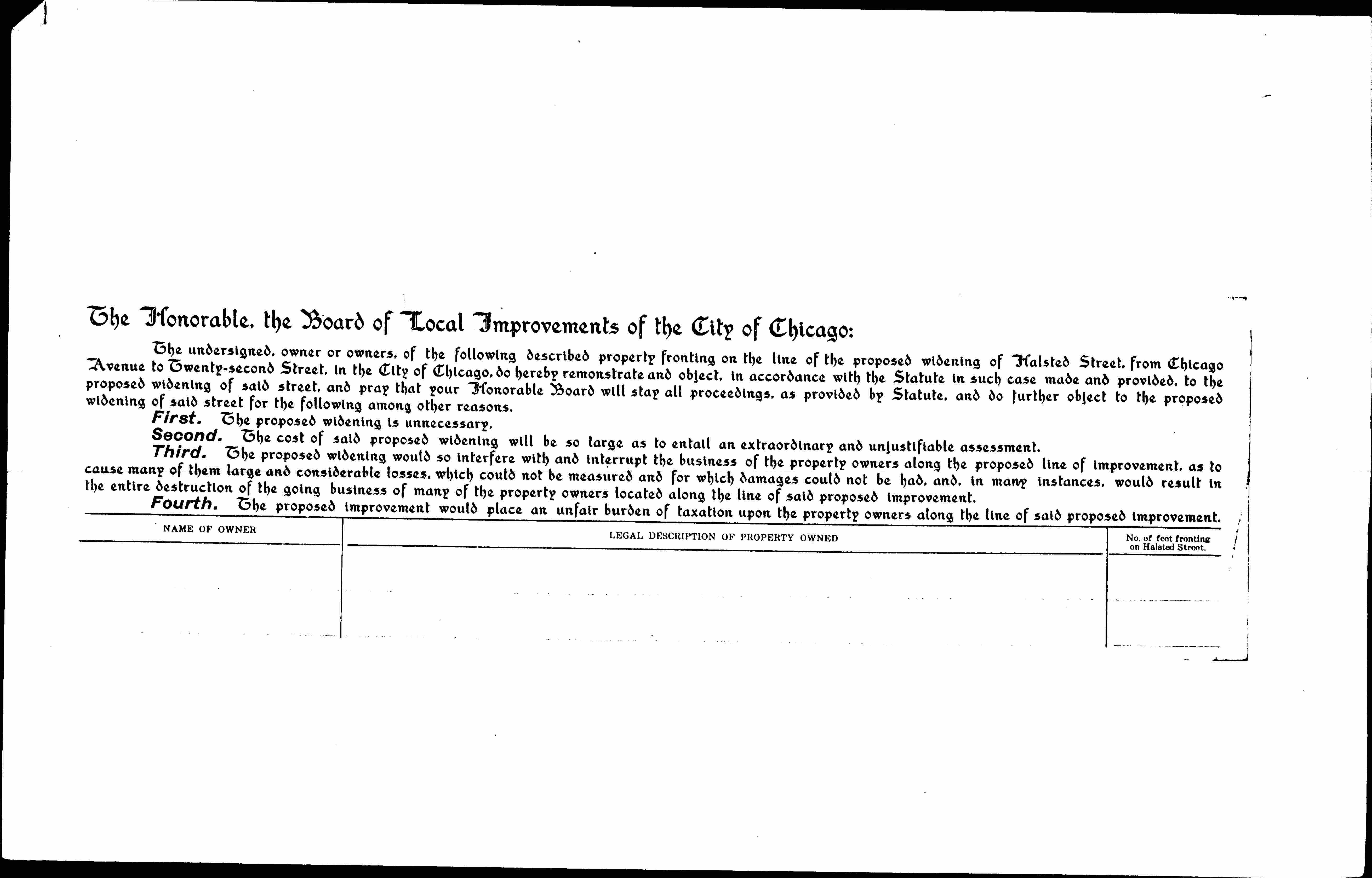 The undersigned, owner or owners, of the following described property fronting on the line of the proposed widening of Halsted Street, from Chicago Avenue to Twenty-second Street, in the City of Chicago, do hereby remonstrate and object in accordance with the Statute in such case made and provided, to the proposed widening of said street, and pray that your Honorable Board will stay all proceedings, as provided by Statute, and do further object to the proposed widening of said street for the following among other reasons.