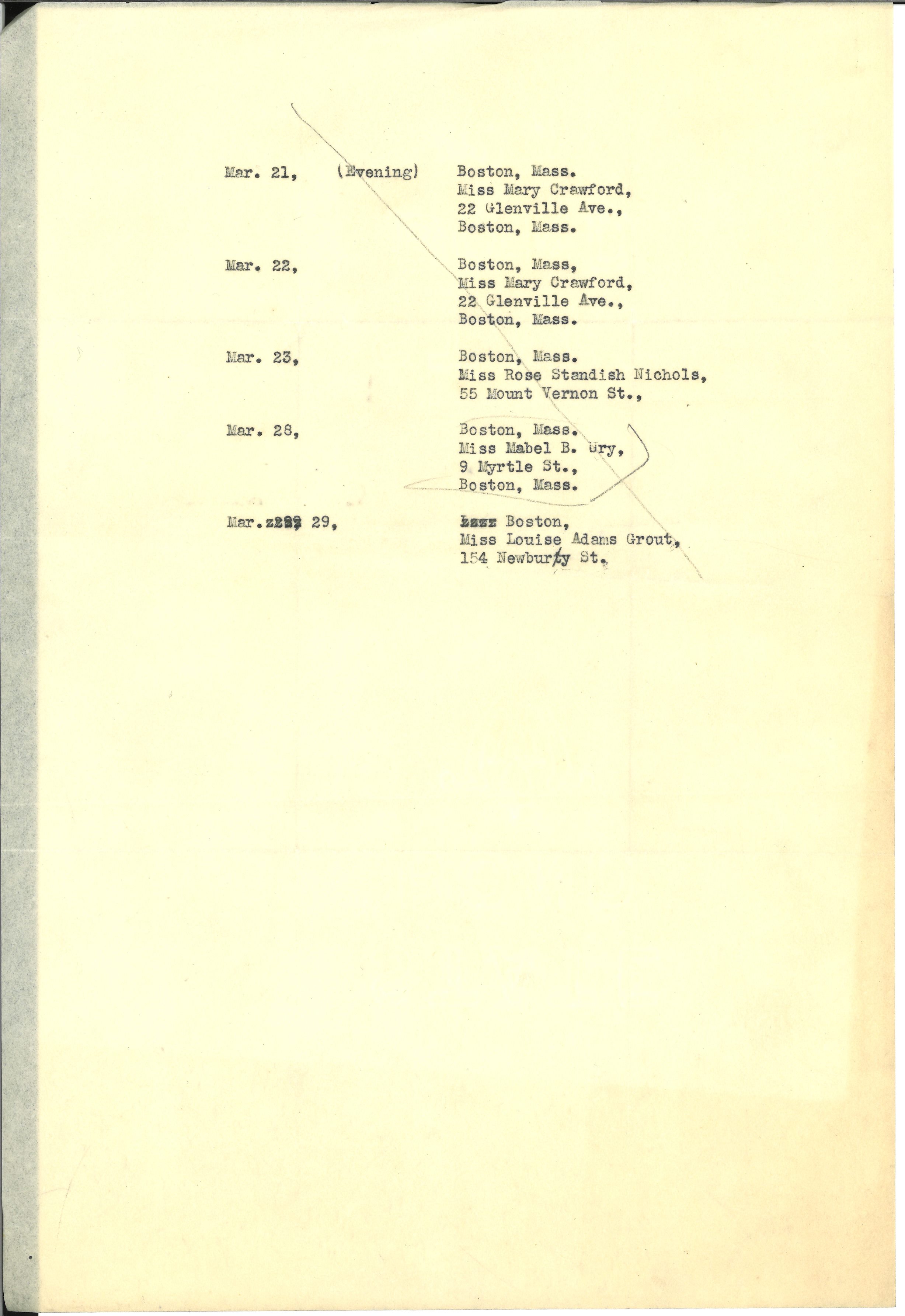| Mar. 22, | Boston, Mass. Miss Mary Crawford, 22 Glenville Ave., Boston, Mass. |
