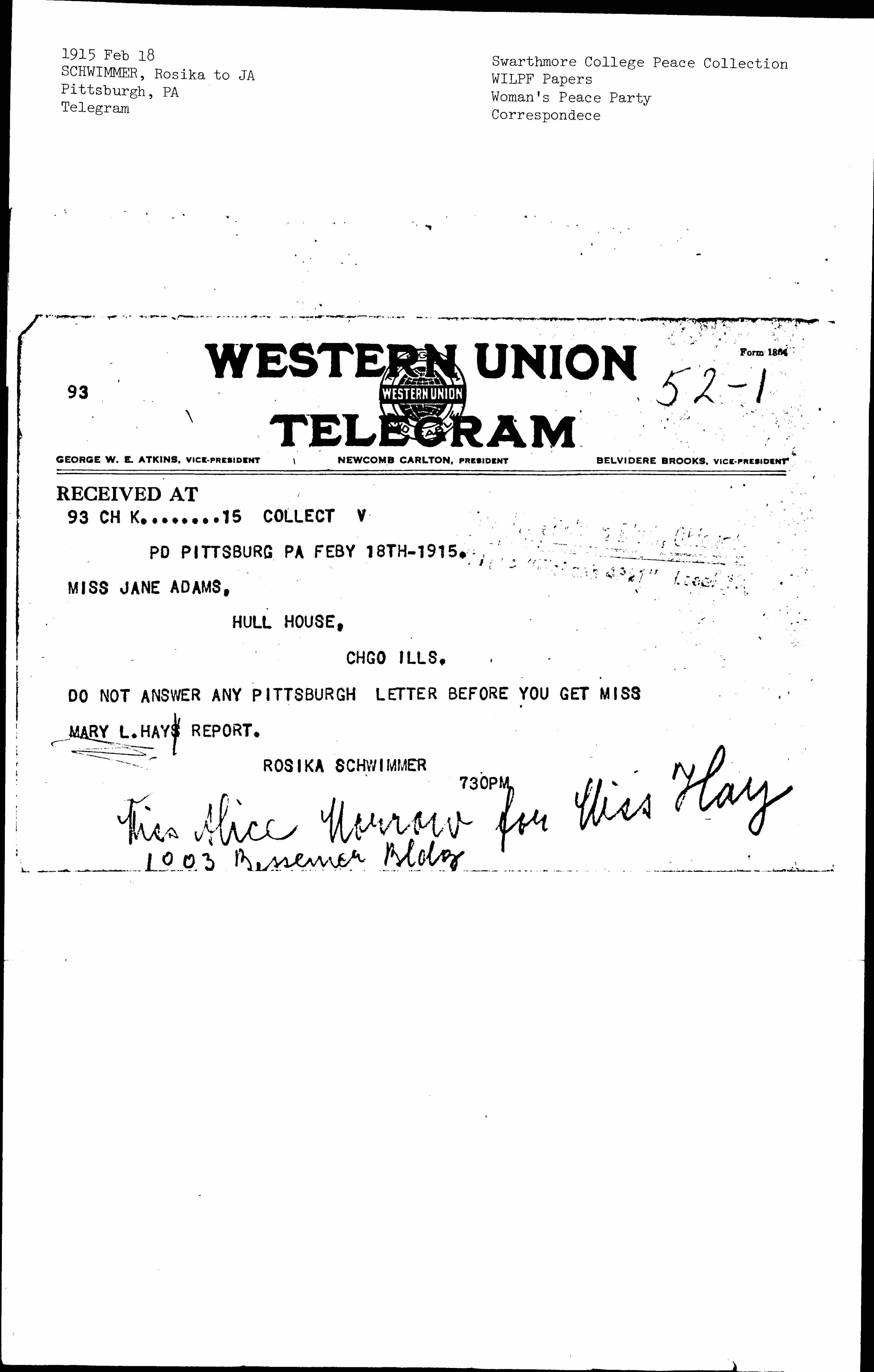 DO NOT ANSWER ANY PITTSBURGH LETTER BEFORE YOU GET MISS MARY L. HAYS REPORT.