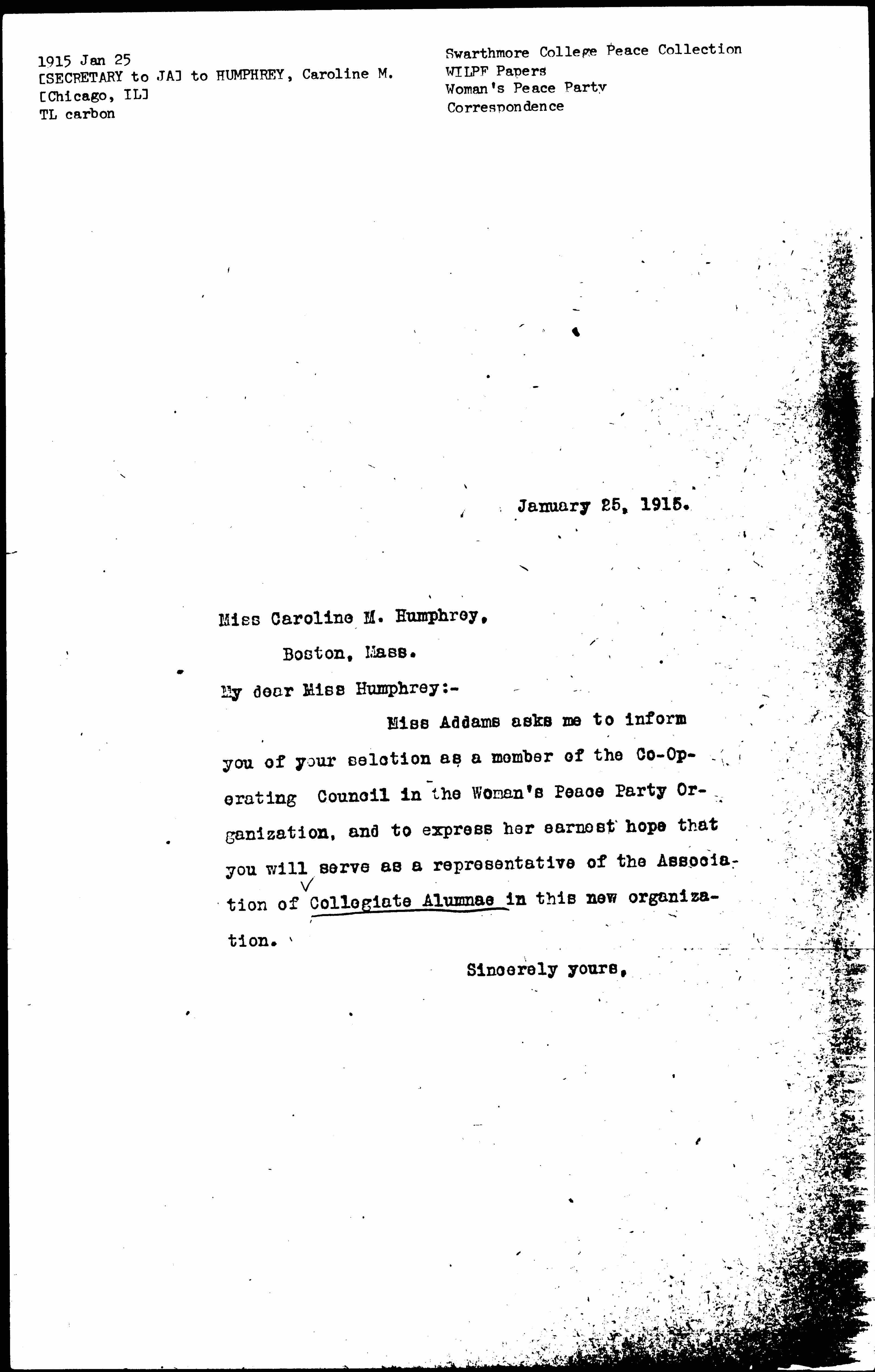 Miss Addams asks me to inform you of your selection as a member of the [Cooperating] Council in the Woman's Peace Party Organization, and to express her earnest hope that you will serve as a representative of the Association of Collegiate Alumnae in this new organization.