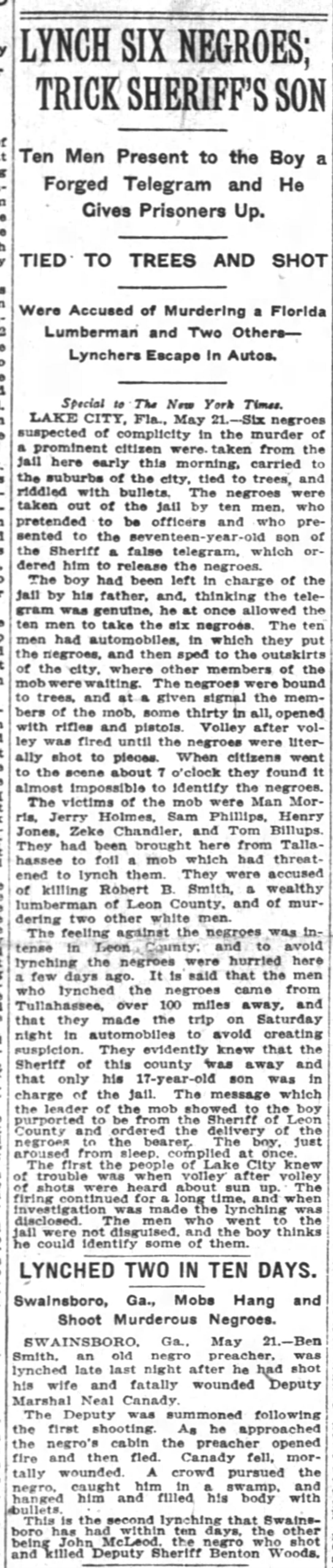 LAKE CITY, Fla., May 21. -- Six negroes suspected of complicity in the murder of a prominent citizen were taken from the jail here early this morning, carried to the suburbs of the city, tied to trees, and riddled with bullets. The negroes were taken out of jail by ten men, who pretended to be officers and who presented the seventeen-year-old son of the Sheriff a false telegram, which ordered him to release the negroes.