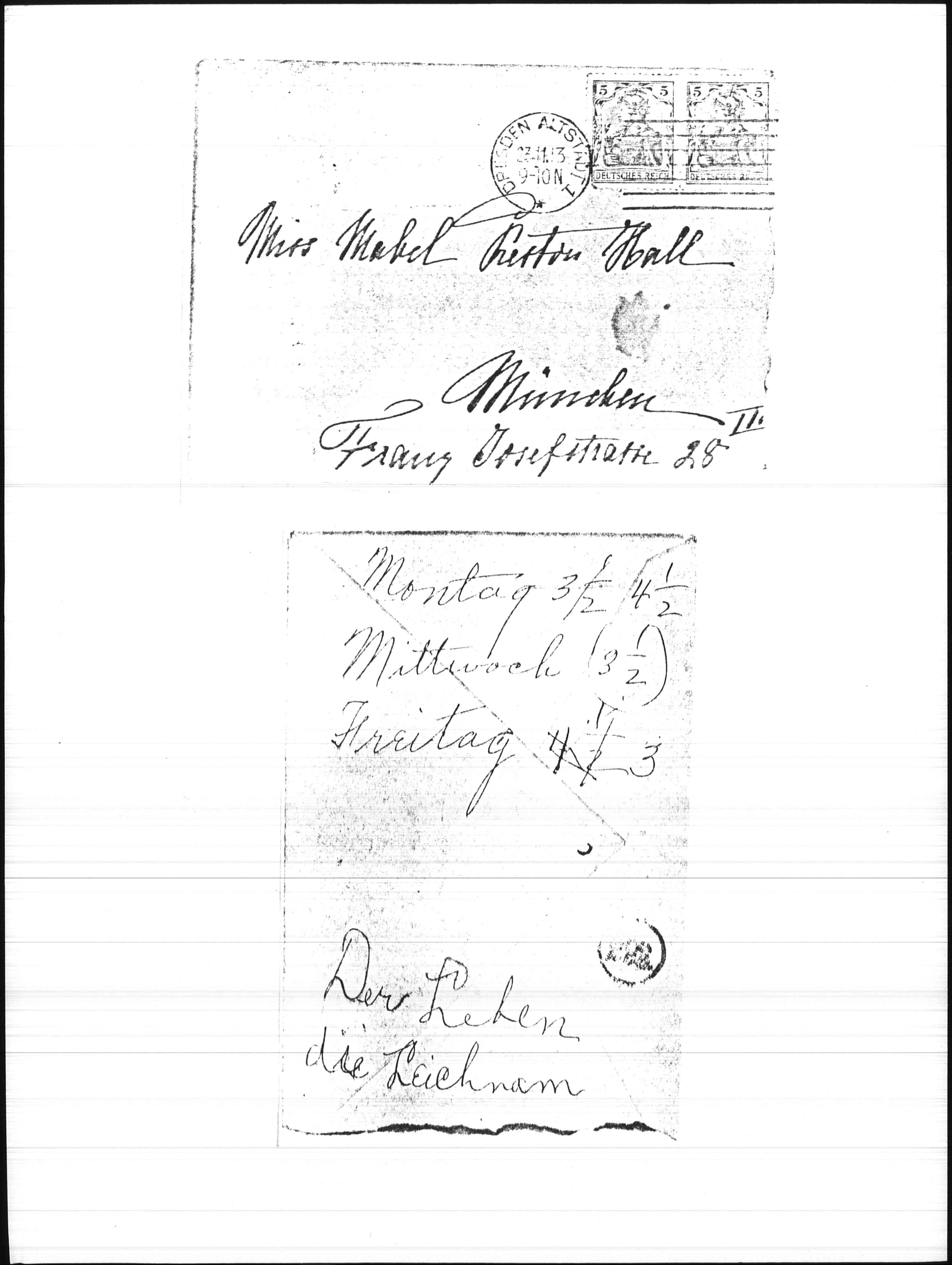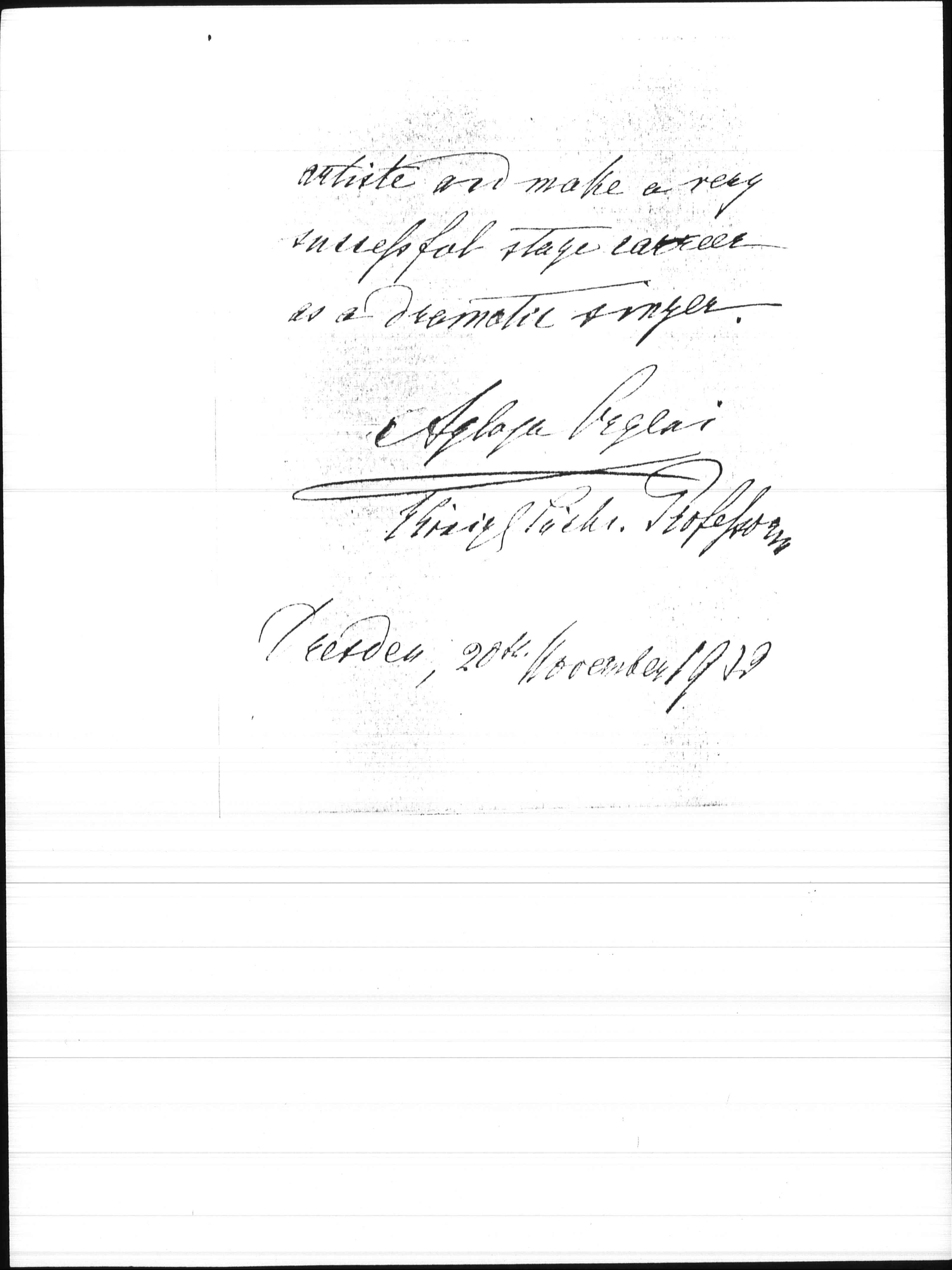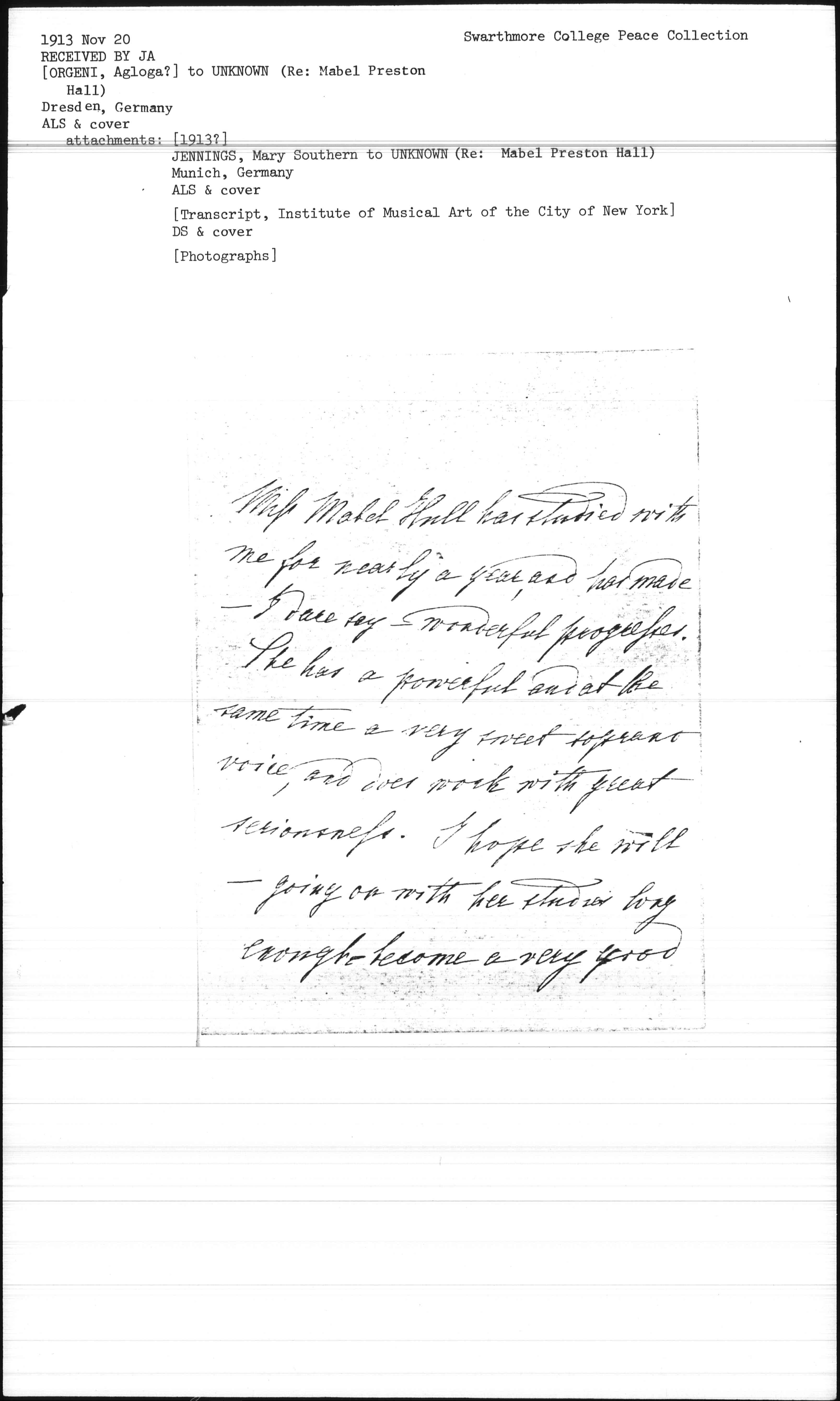 Miss Mabel [Hall] has studied with me for nearly a year and has made -- I dare say -- wonderful progresses. She has a powerful and at the same time a very sweet soprano voice, and does work with great seriousness. I hope she will -- going on with her studies long enough -- become a very good [page 2] artiste and make a very successful stage [career] as a dramatic singer.