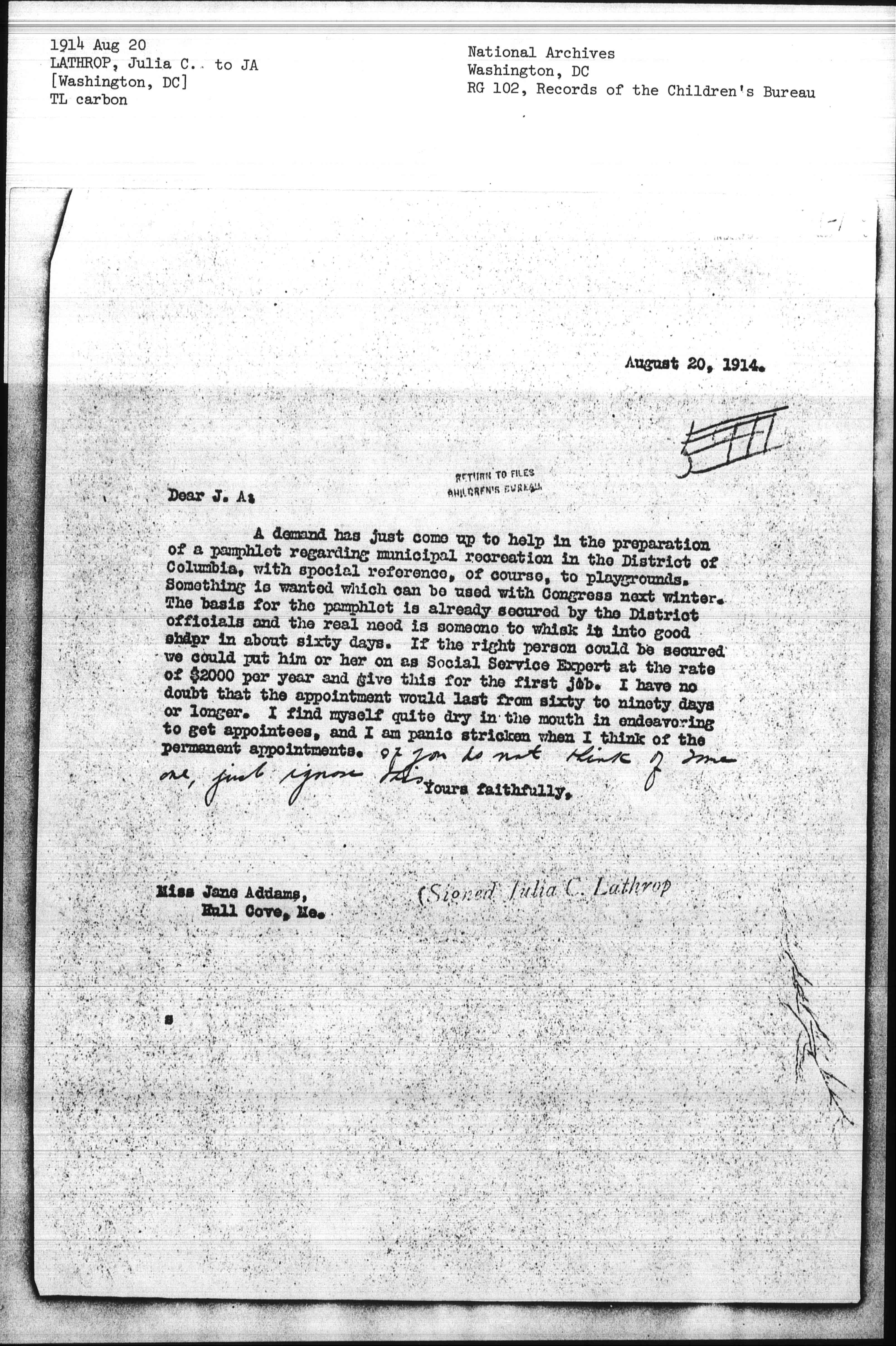 A demand has just come up to help in the preparation of a pamphlet regarding municipal recreation in the District of Columbia, with special reference, of course, to playgrounds. Something is wanted which can be used with Congress next winter. The basis for the pamphlet is already secured by the District officials and the real need is someone to whisk it into good shape in about sixty days. If the right person could be secured we could put him or her on as Social Service Expert at the rate of $2000 per year and give this for the first job. I have no doubt that the appointment would last from sixty to ninety days or longer. I find myself quite dry in the mouth in endeavoring to get appointees, and I am panic stricken when I think of the permanent appointments. <if you do not think of one, just ignore this.>